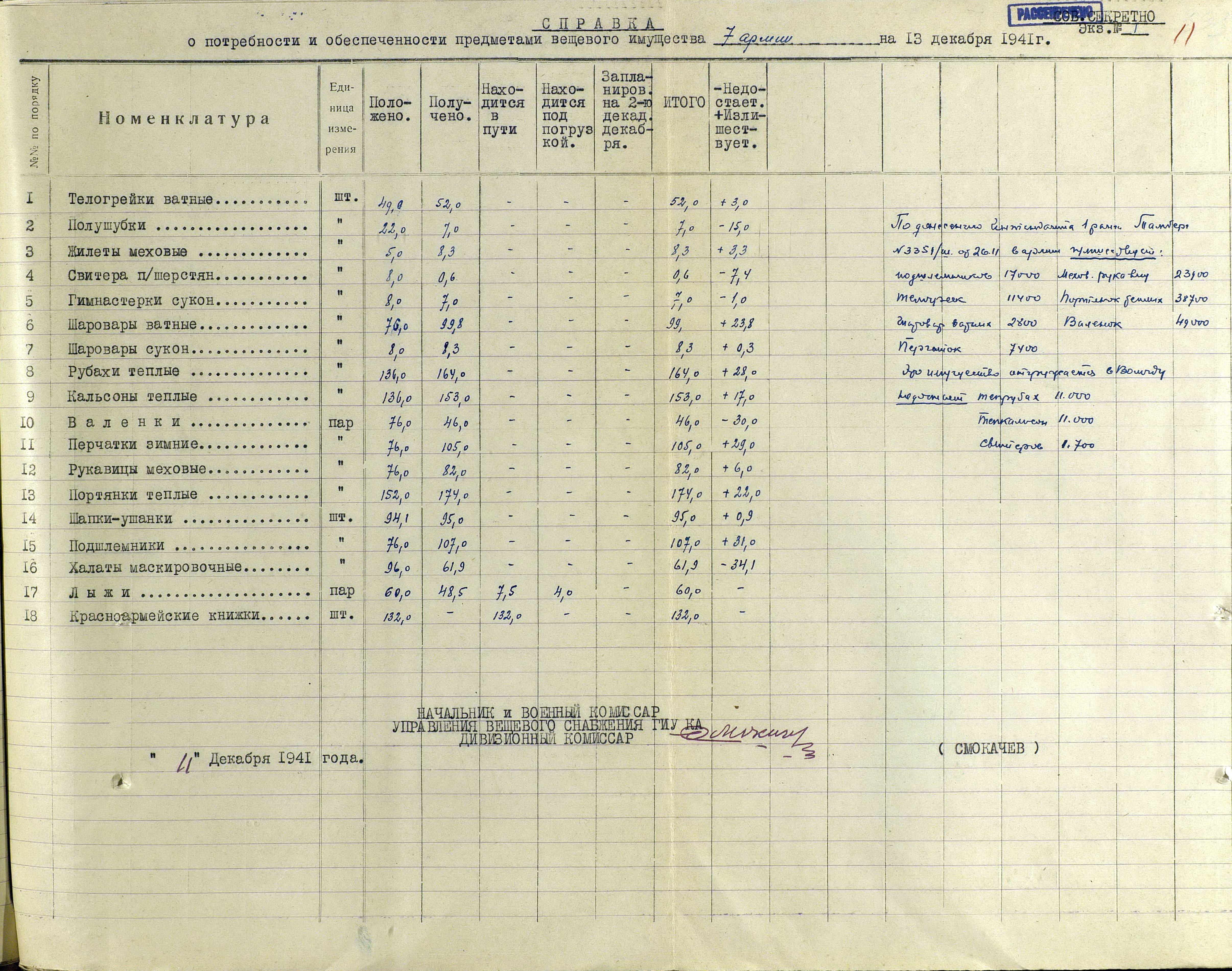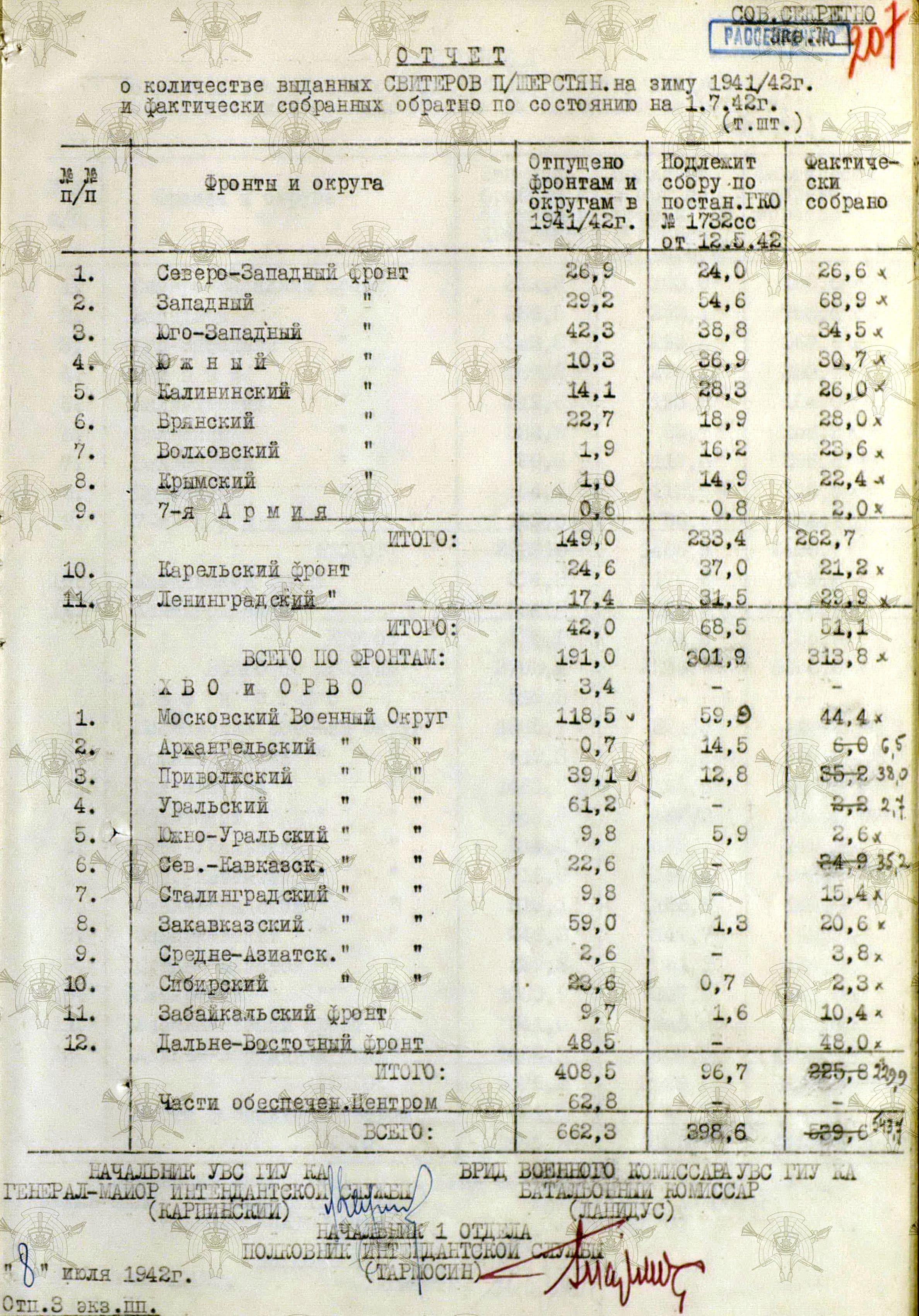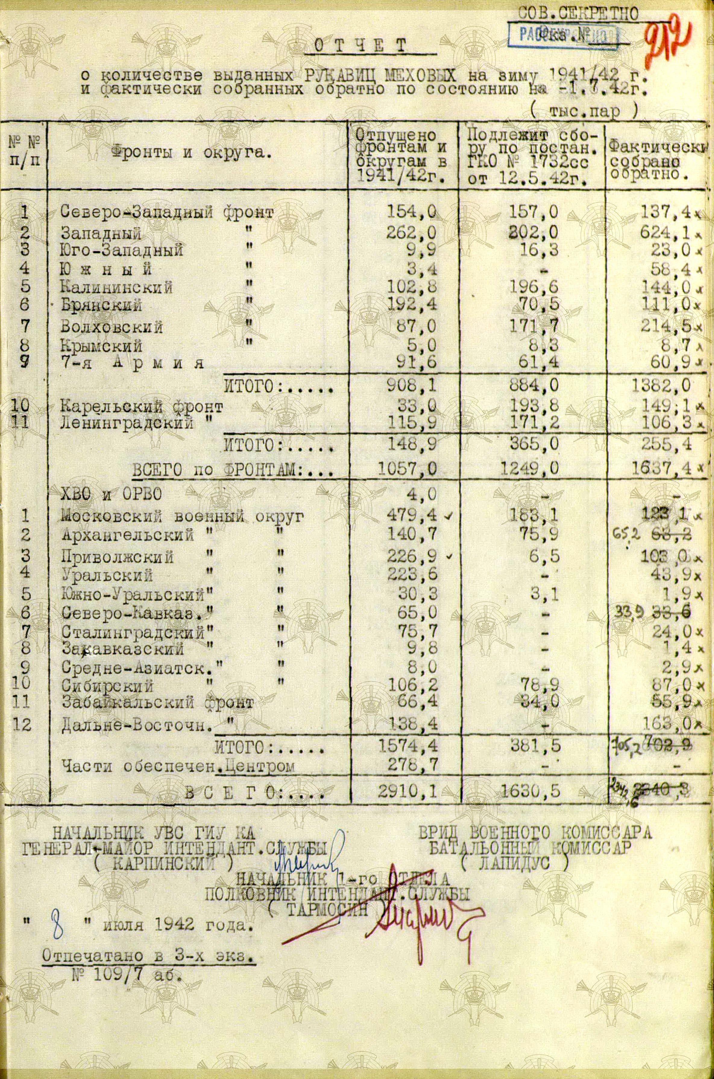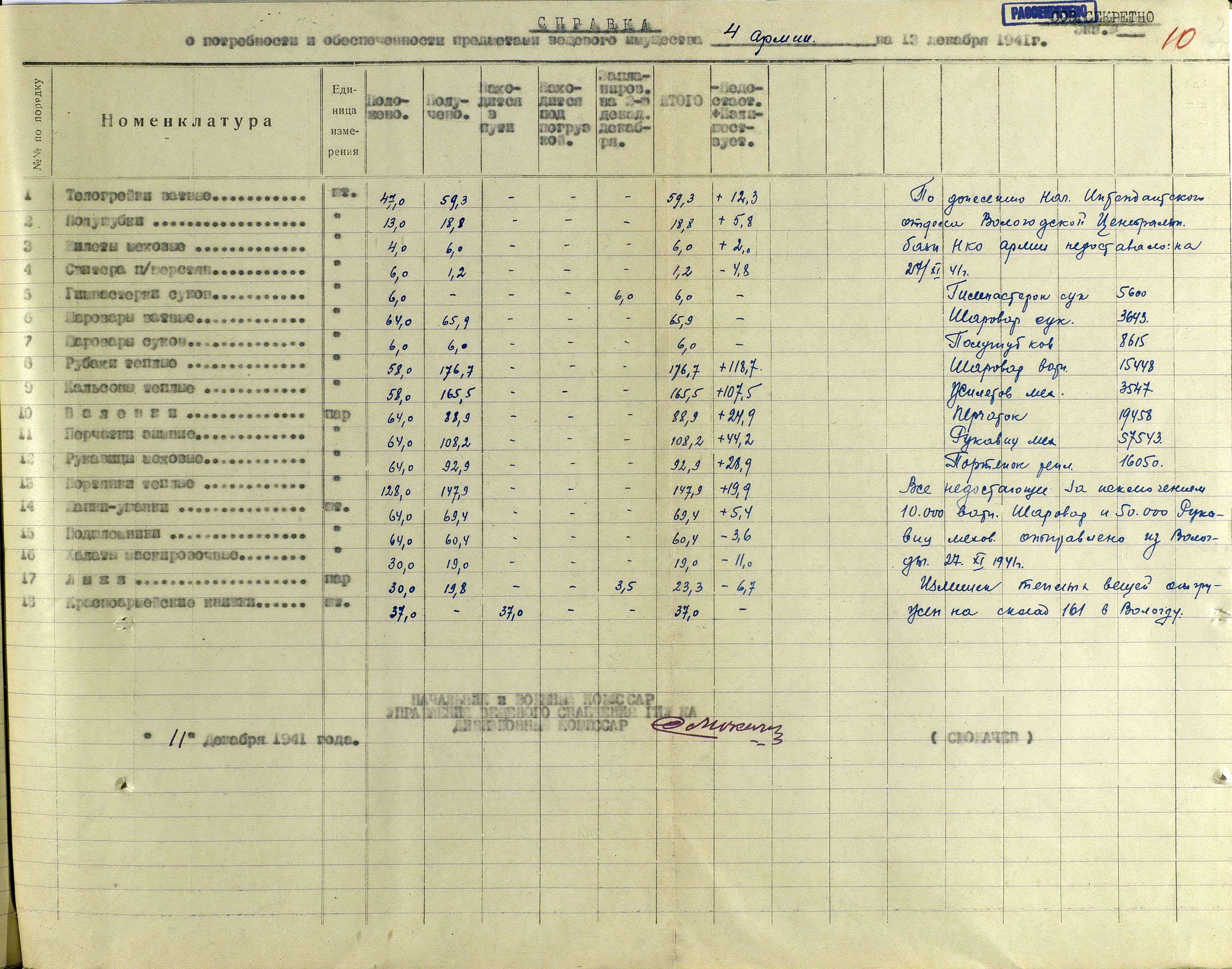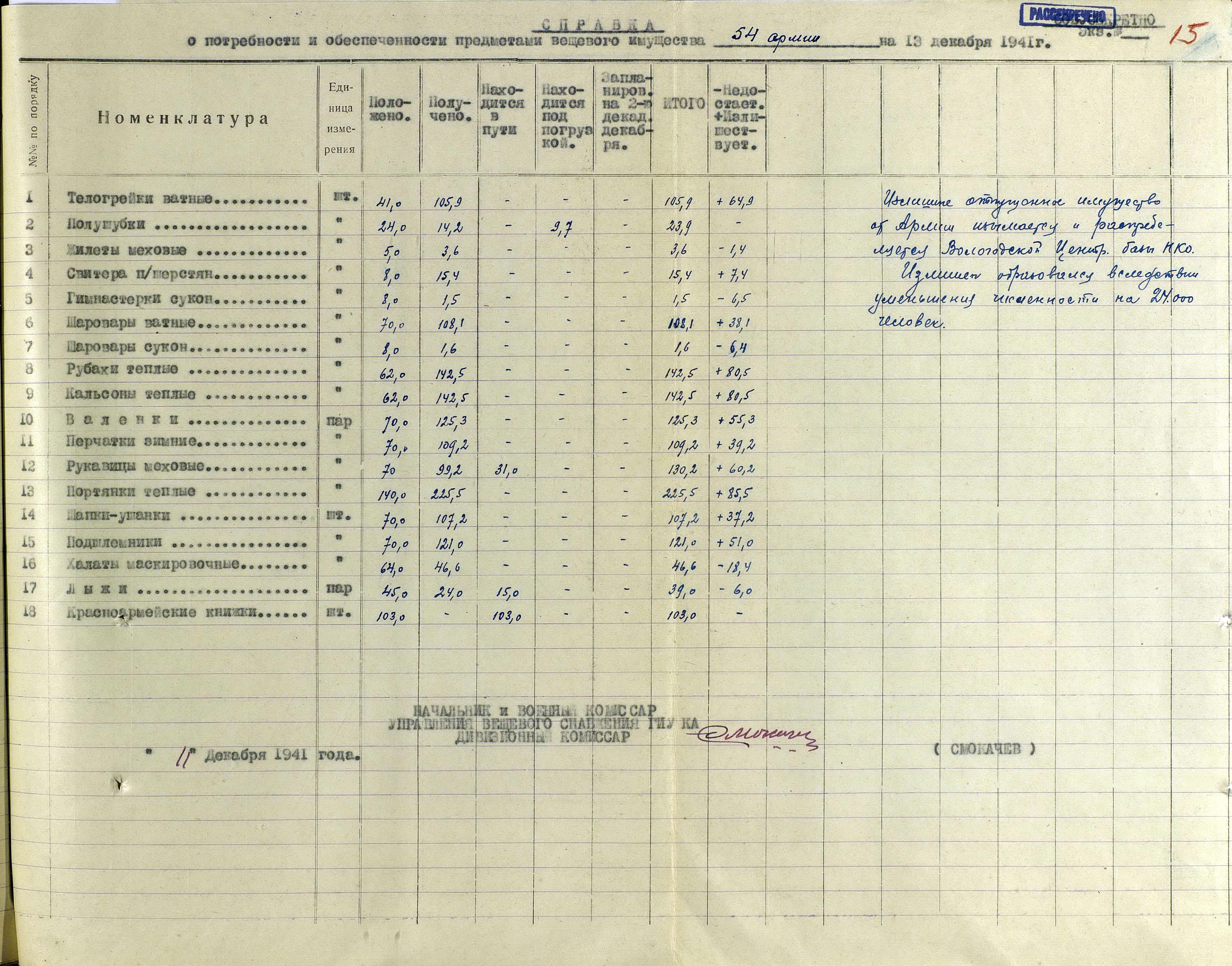 А о выполнении приказов Наркома обороны СССР и постановления ГКО, можно судить по Справке потребности – обеспеченности тёплыми вещами фронтов, по состоянию на 13 декабря 1941 г.