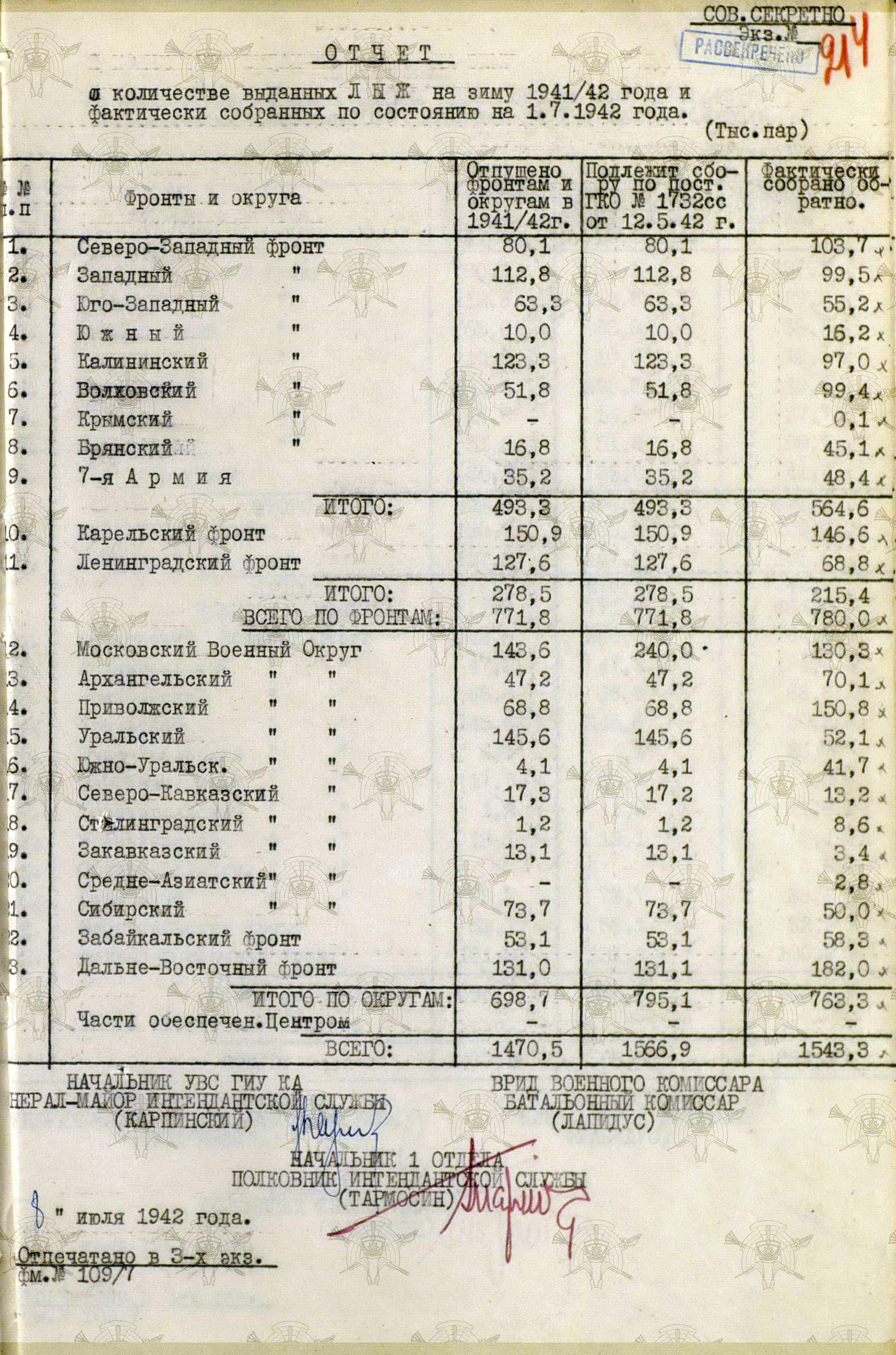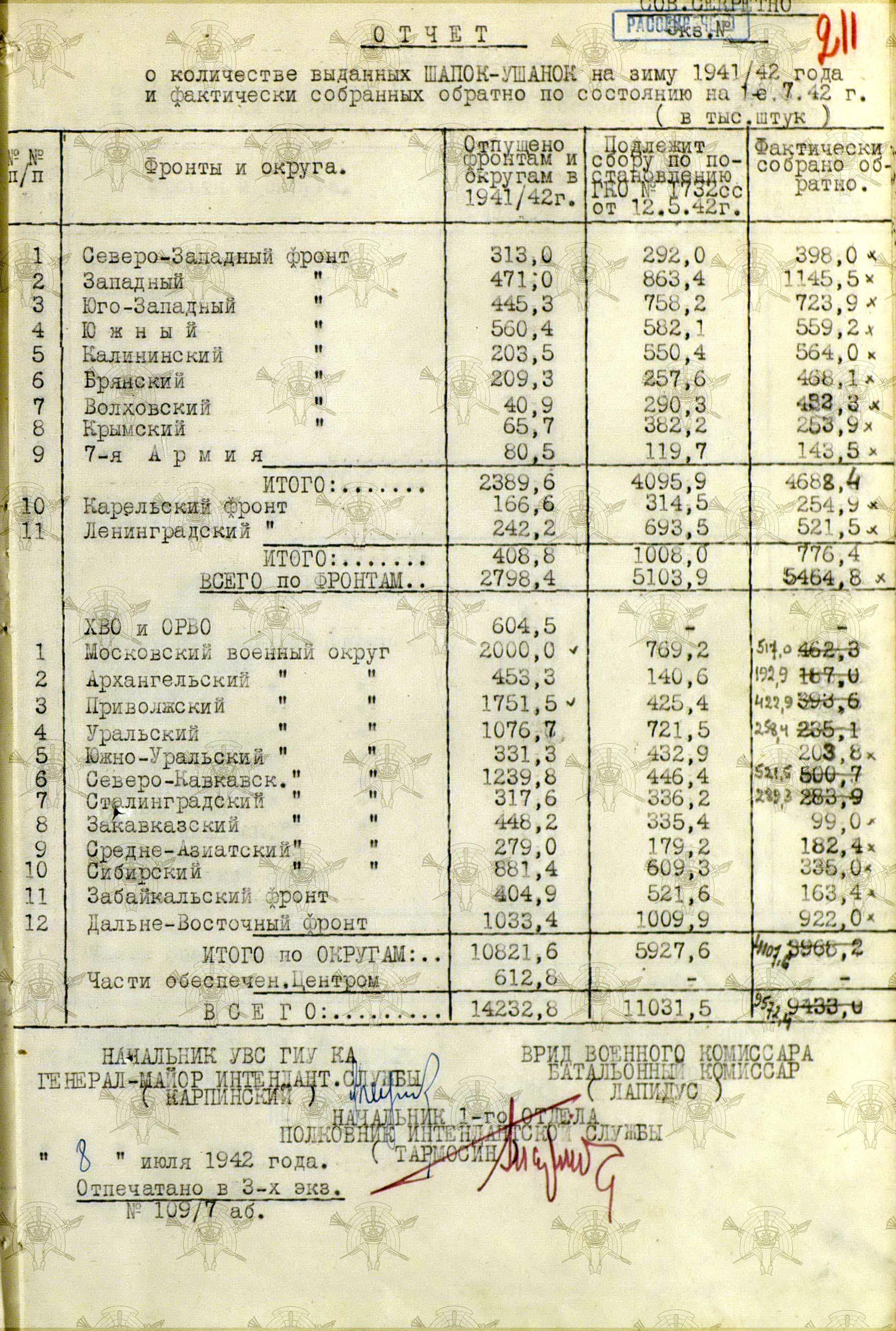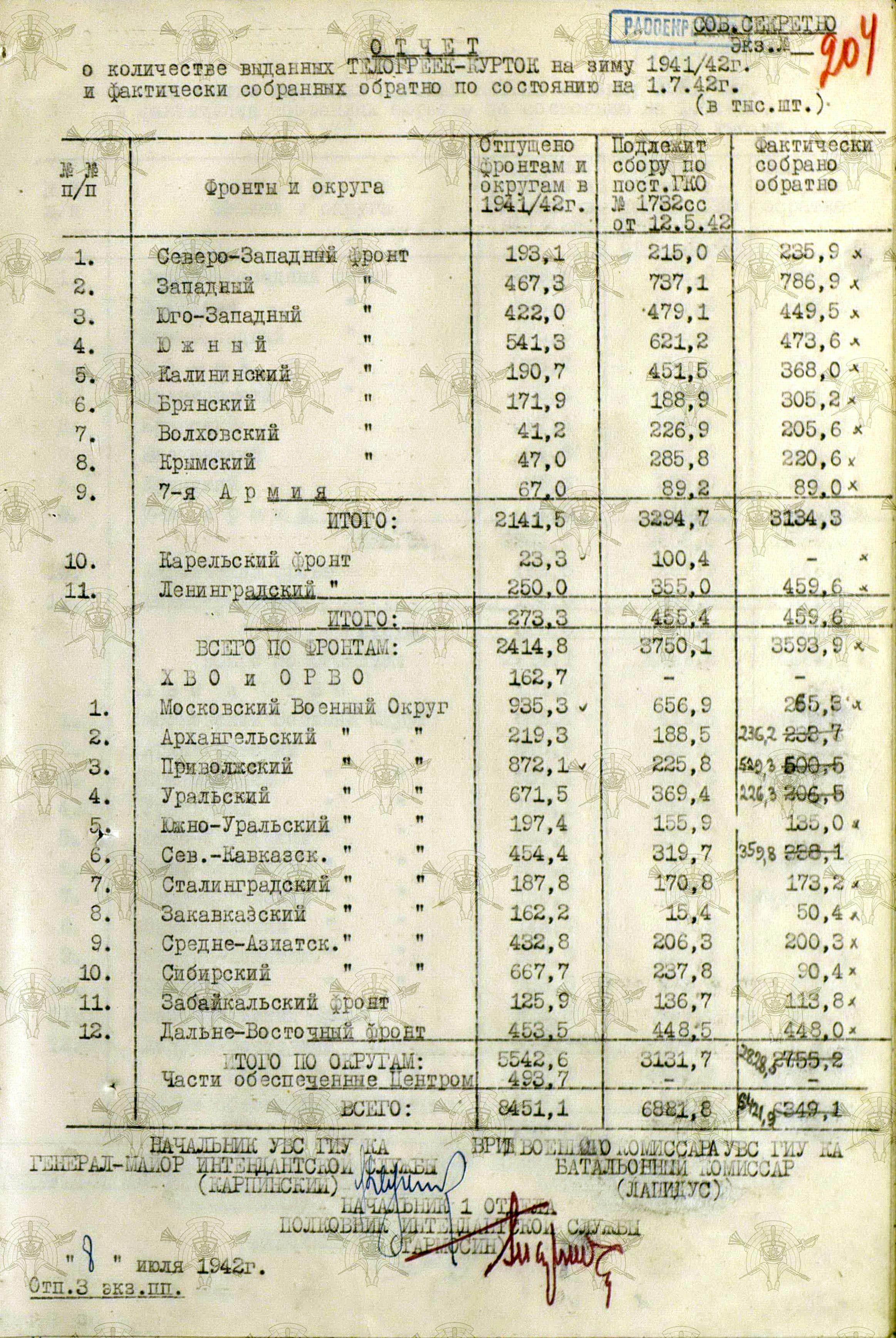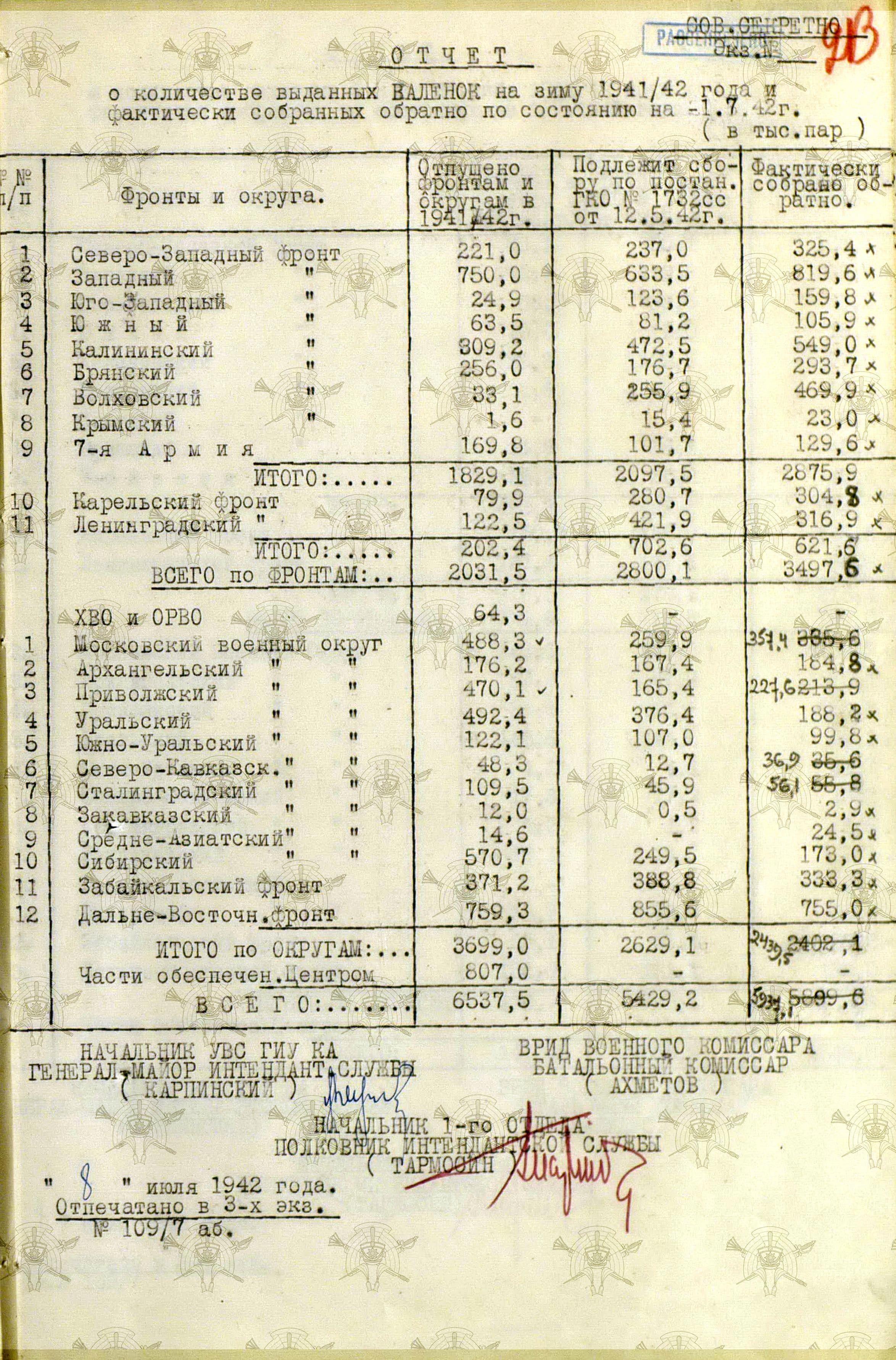 А о выполнении приказов Наркома обороны СССР и постановления ГКО, можно судить по Справке потребности – обеспеченности тёплыми вещами фронтов, по состоянию на 13 декабря 1941 г.