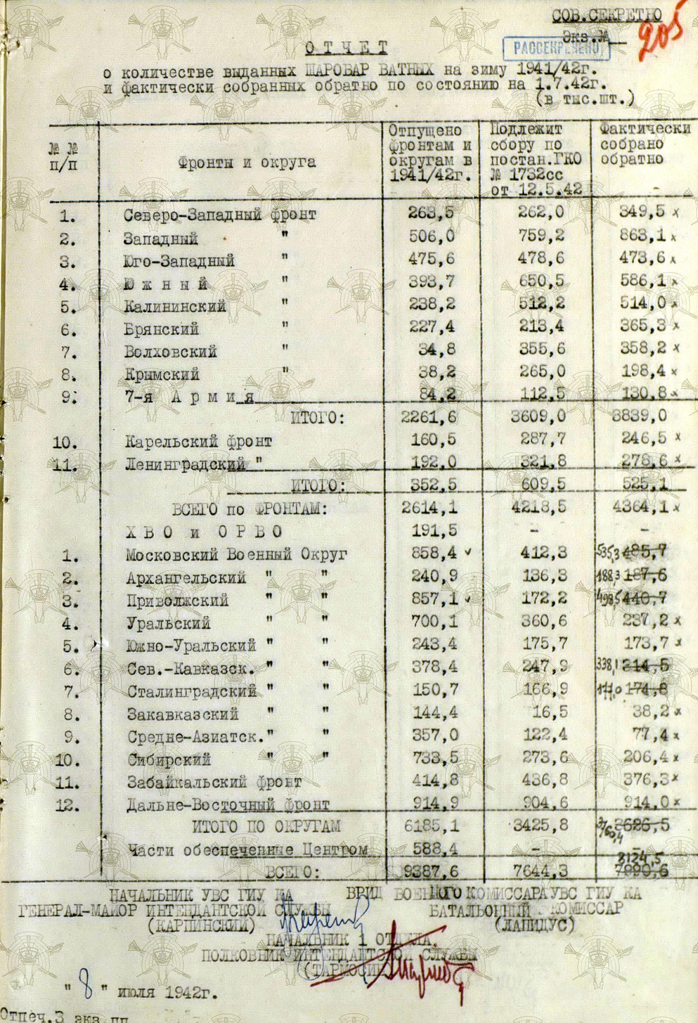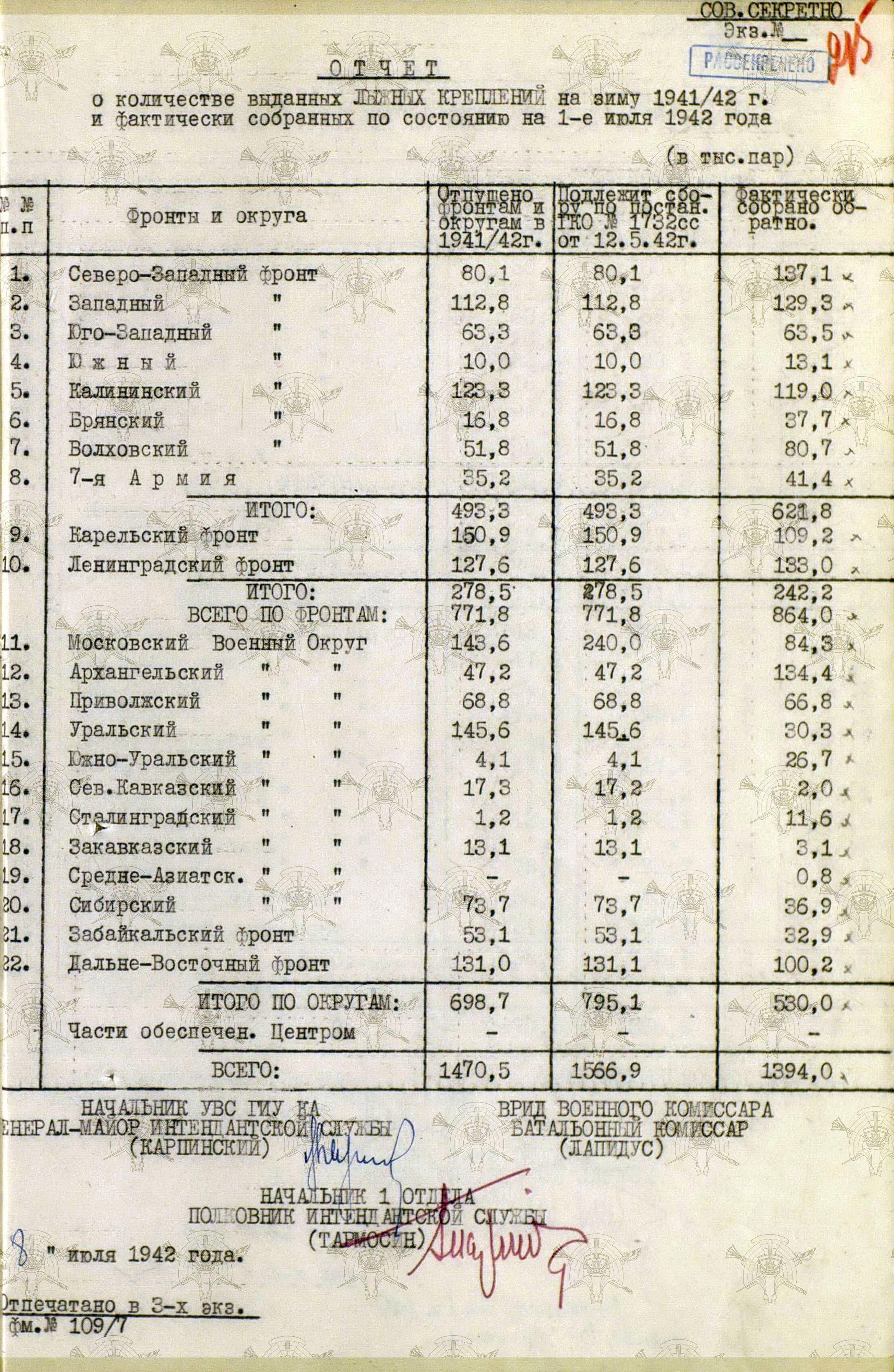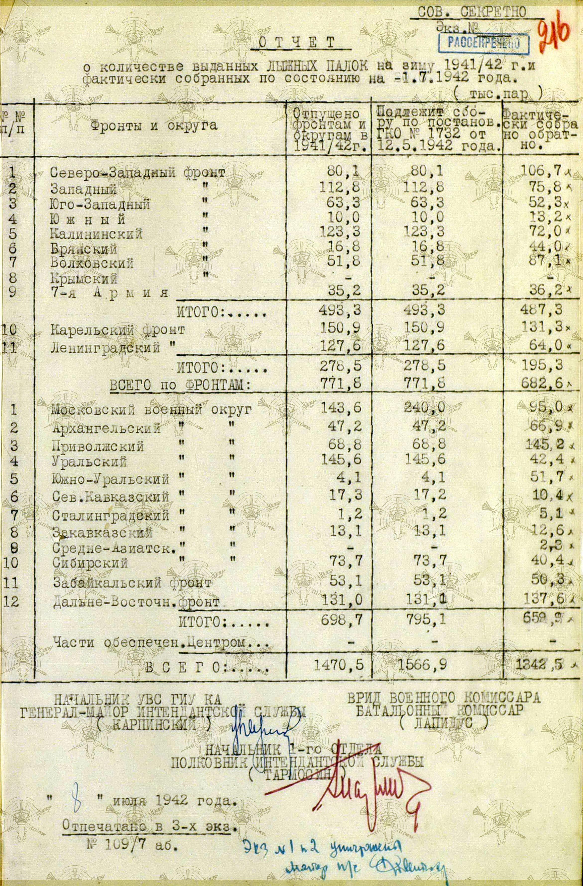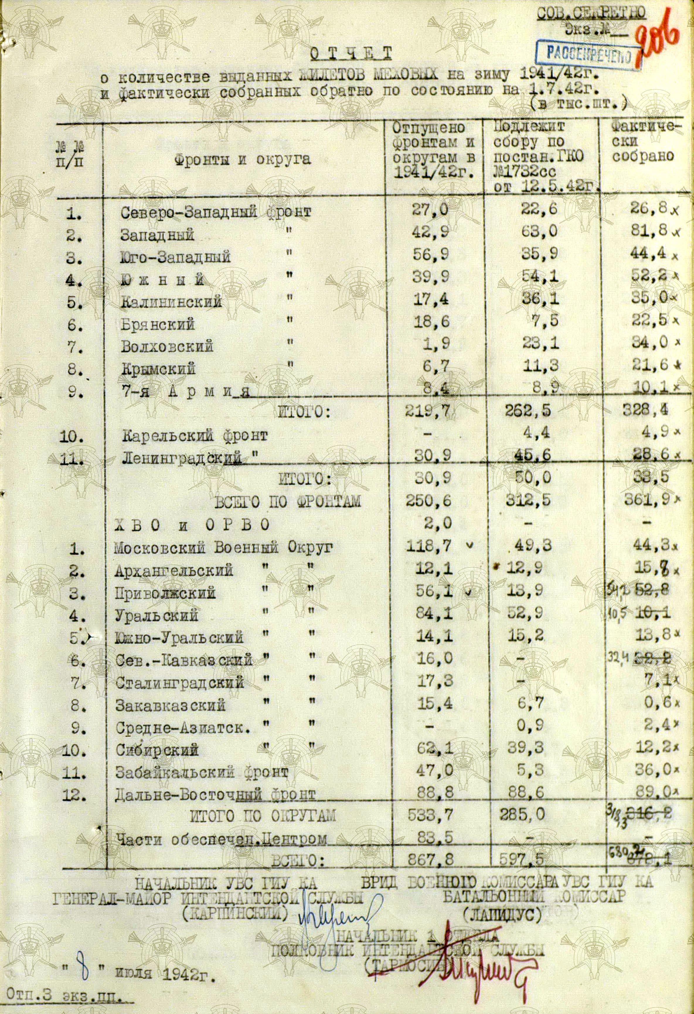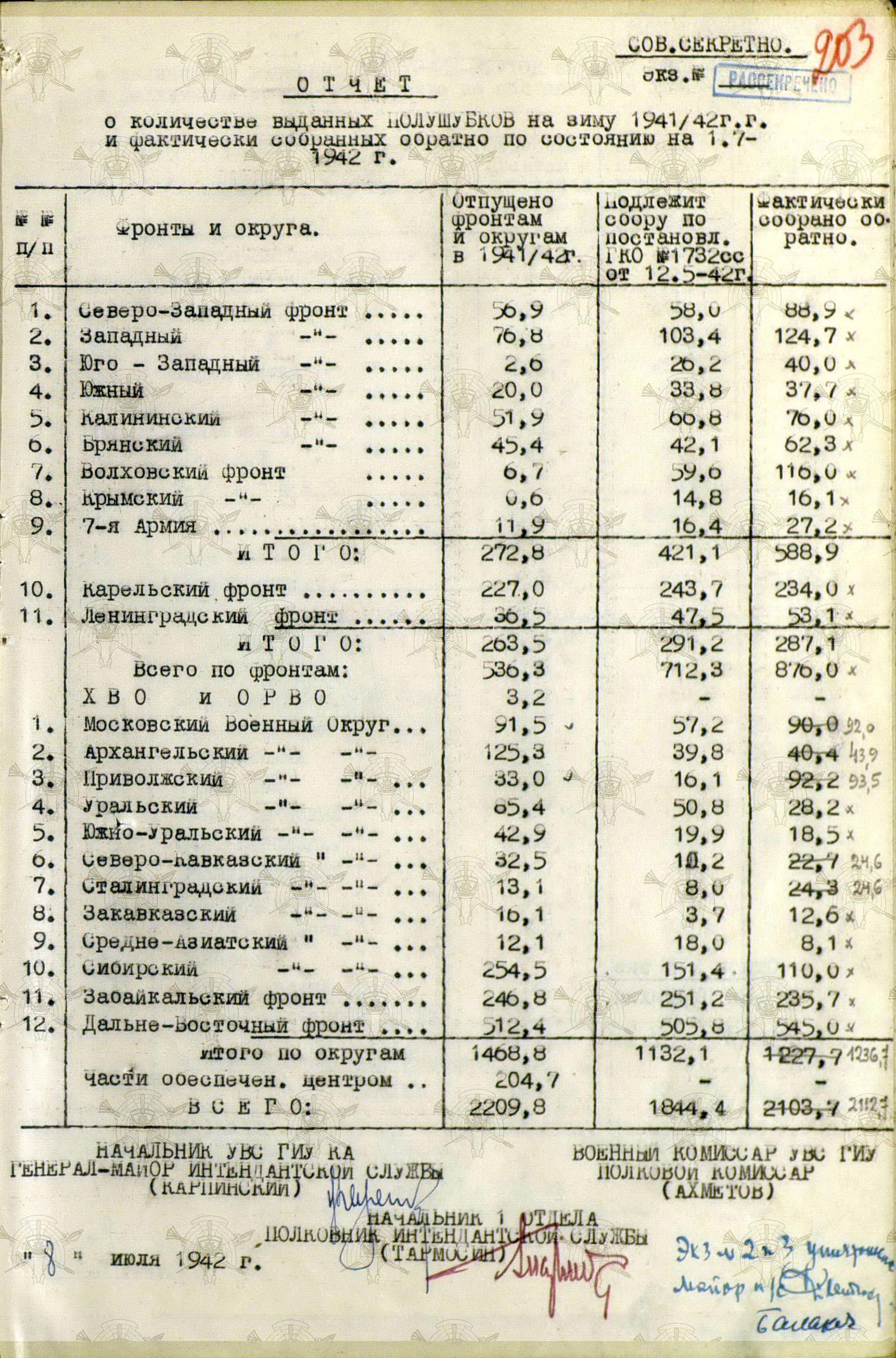 А о выполнении приказов Наркома обороны СССР и постановления ГКО, можно судить по Справке потребности – обеспеченности тёплыми вещами фронтов, по состоянию на 13 декабря 1941 г.