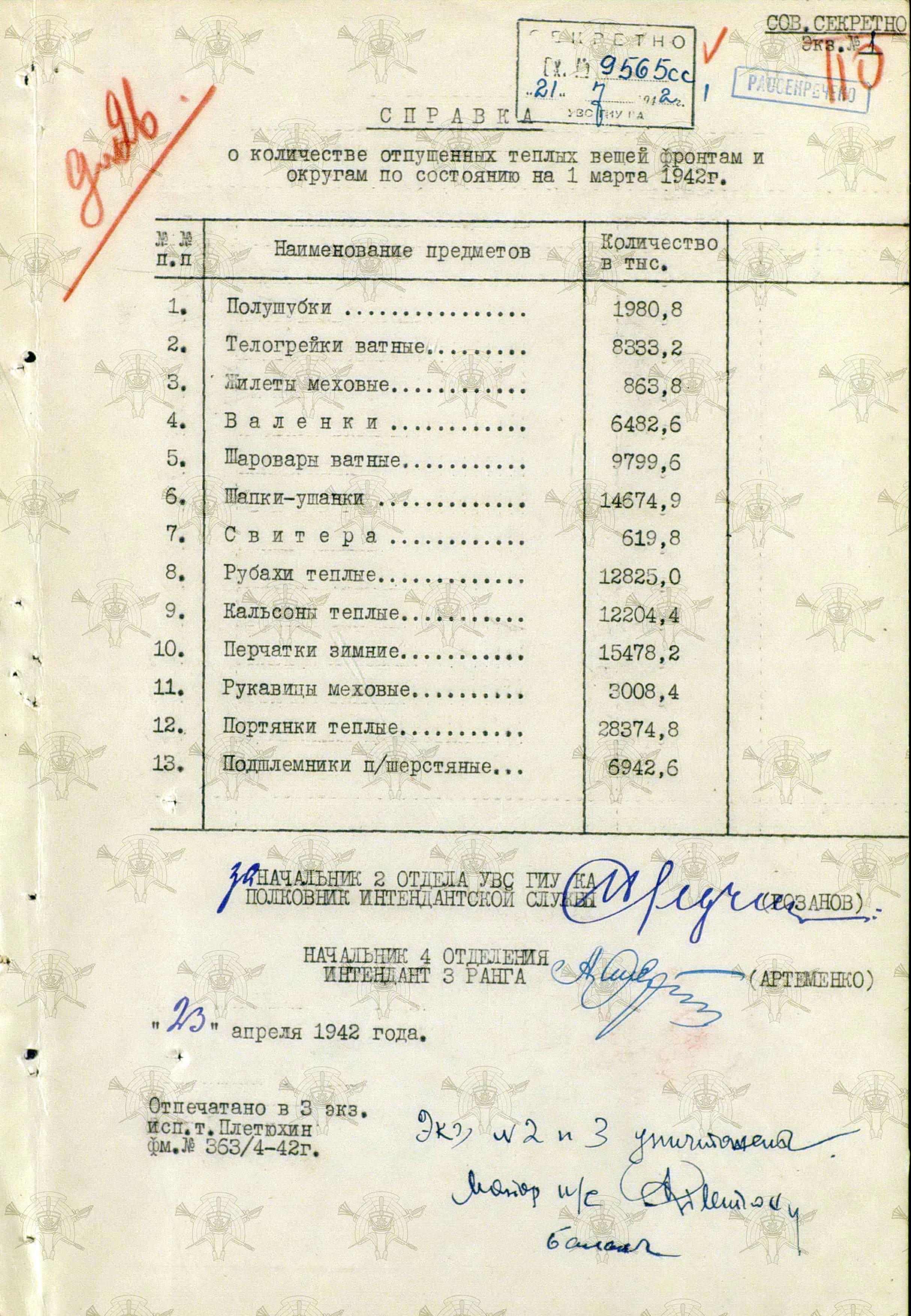Общий итог, по поставкам теплых вещей зимой 1941 – 1942 г.г., представлен ниже: