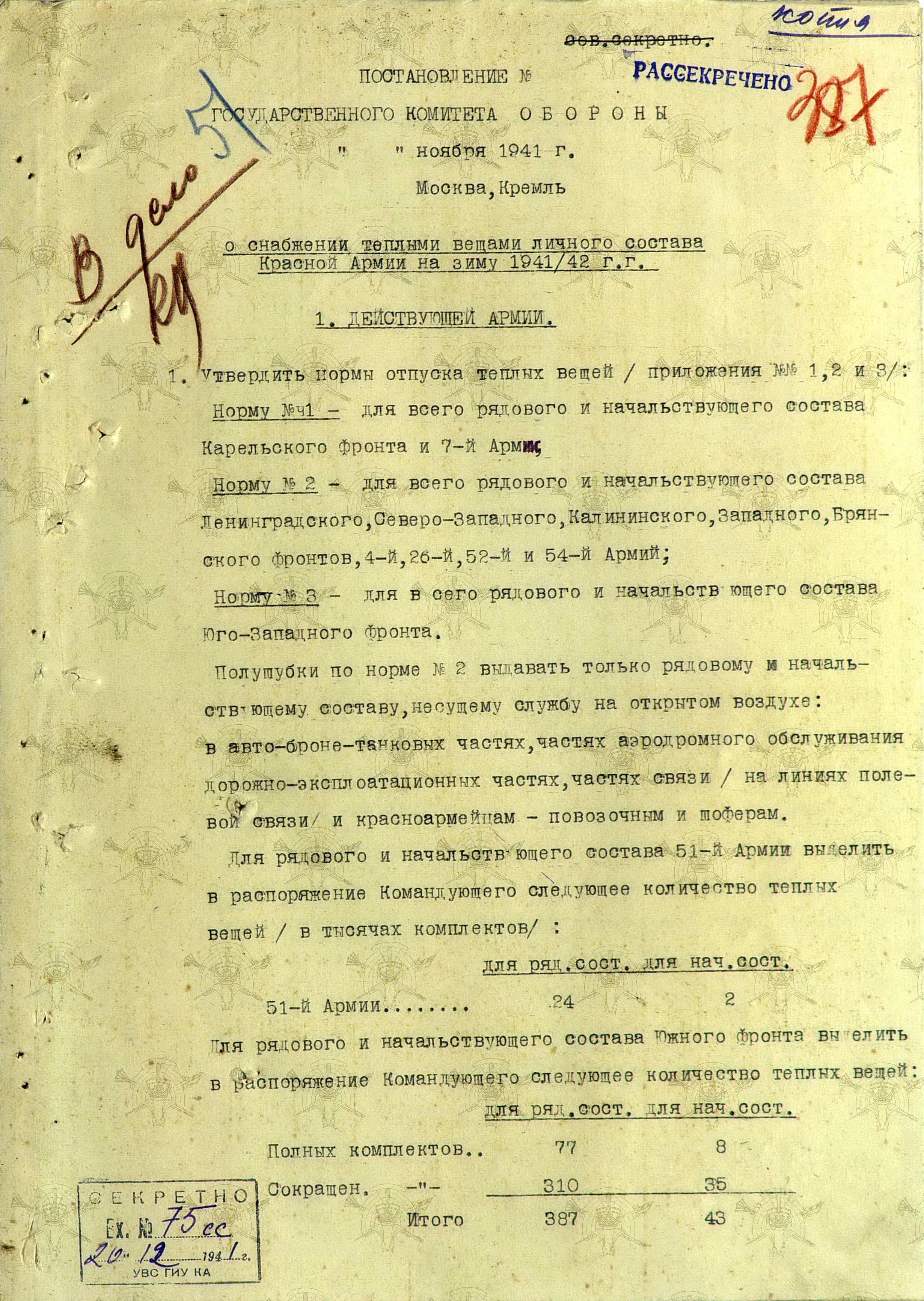 В итоге, такое постановление было принято. К сожалению, мне пока не удалось найти его номер и дату, искренне надеюсь на помощь читателей. Постановление ГКО от 18.07. 1941 г. № ГКО-196сс «О мероприятиях по обеспечению Красной Армии теплыми вещами на зимний период 1941/42 года» - хот и пересекается с темой, но не то.