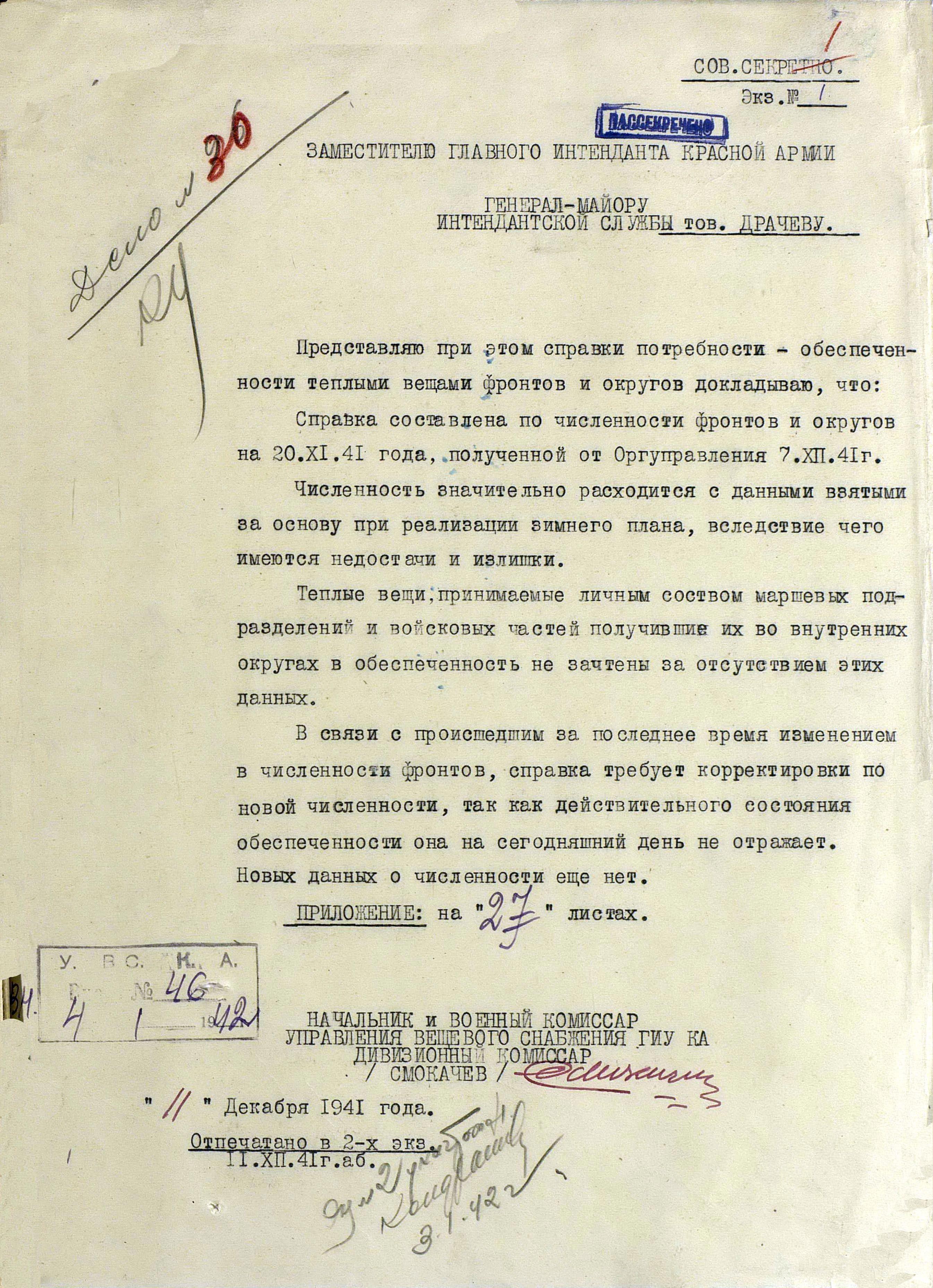 О снабжении теплыми вещами личного состава Красной Армии на зиму 1941/42 г.г.