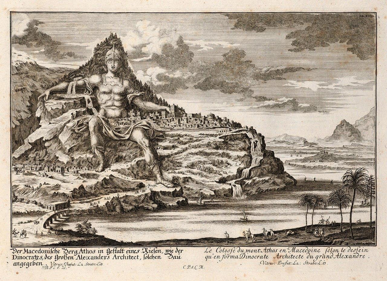 Гравюра по рисунку Й. Б. Фишера фон Эрлаха «Памятник Александру Великому» (1721), иллюстрирующая замысел Дейнократа относительно горы Афон