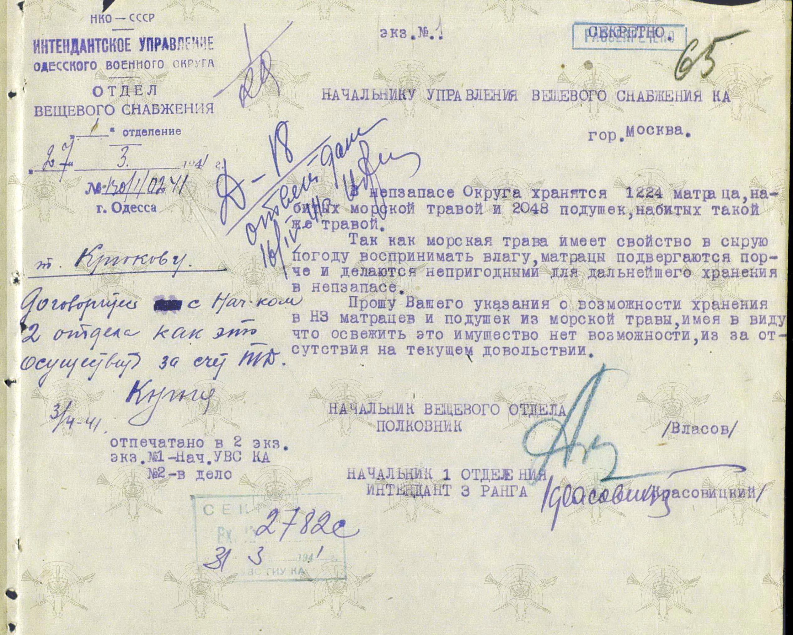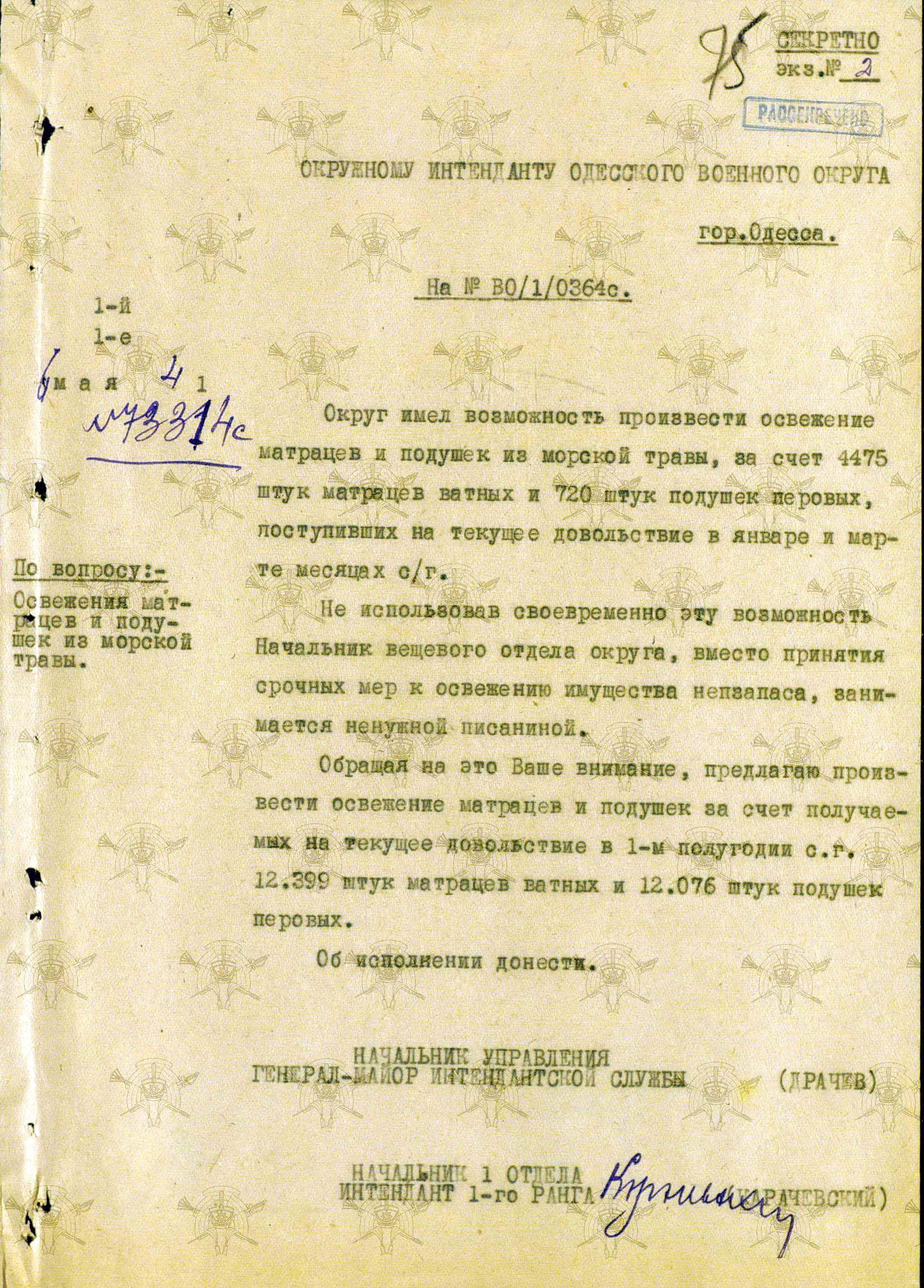 Перейдём к следующим вопросам и ответам. Отдел вещевого снабжения ОИУ Одесского ВО задаёт вопрос, что им делать с хранящимися в непзапасах матрасами, набитыми морской травой. Даже не знал, что были и такие матрасы, похоже, что их выявили в ходе инвентаризации.