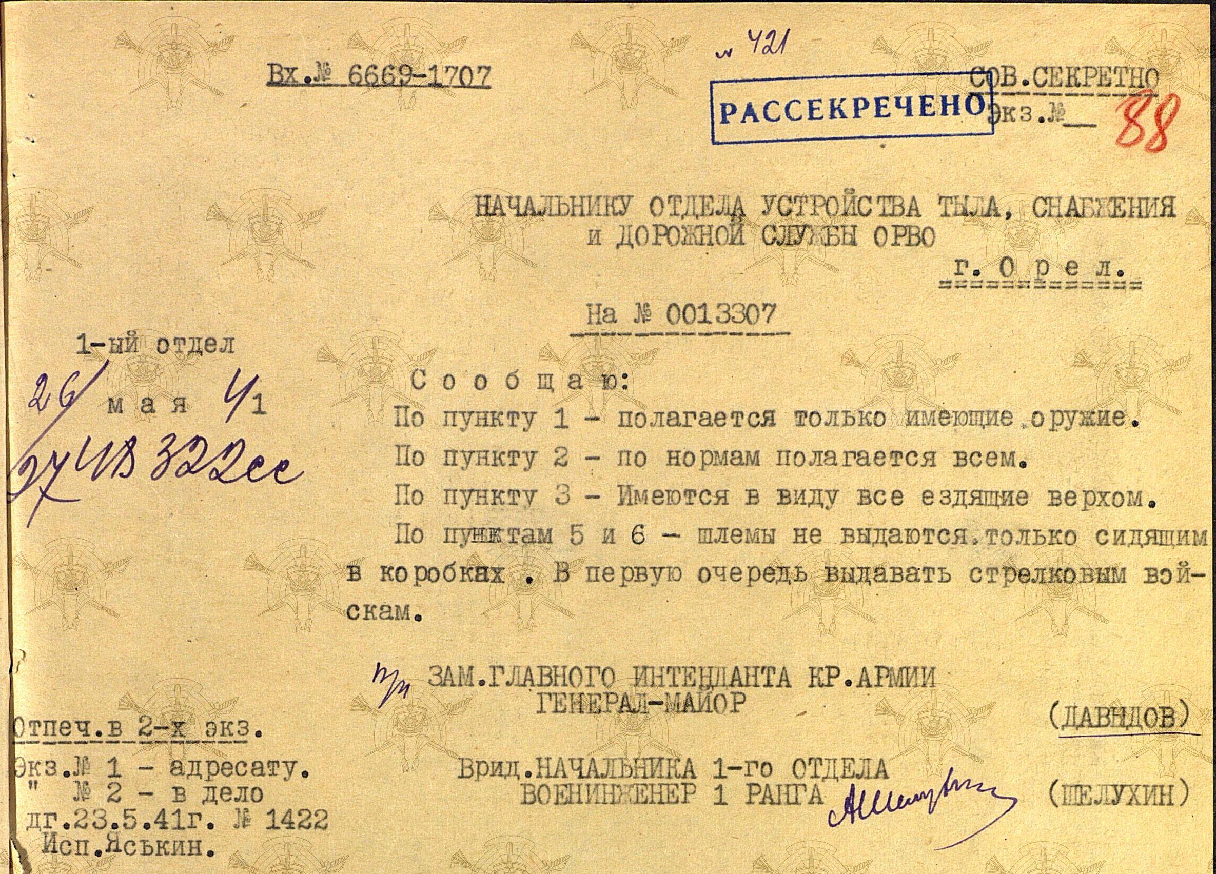 Следующий запрос интендантов ОрлВО касался снаряжения: кабур, стальных шлемов, ремней для скатки шинелей.