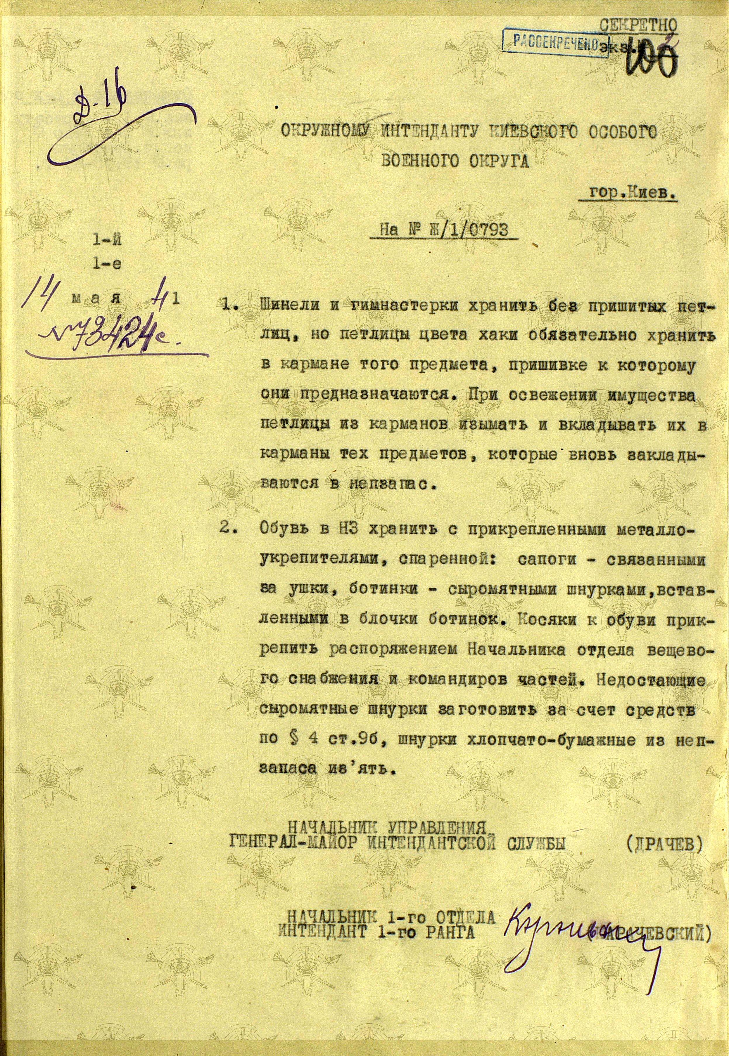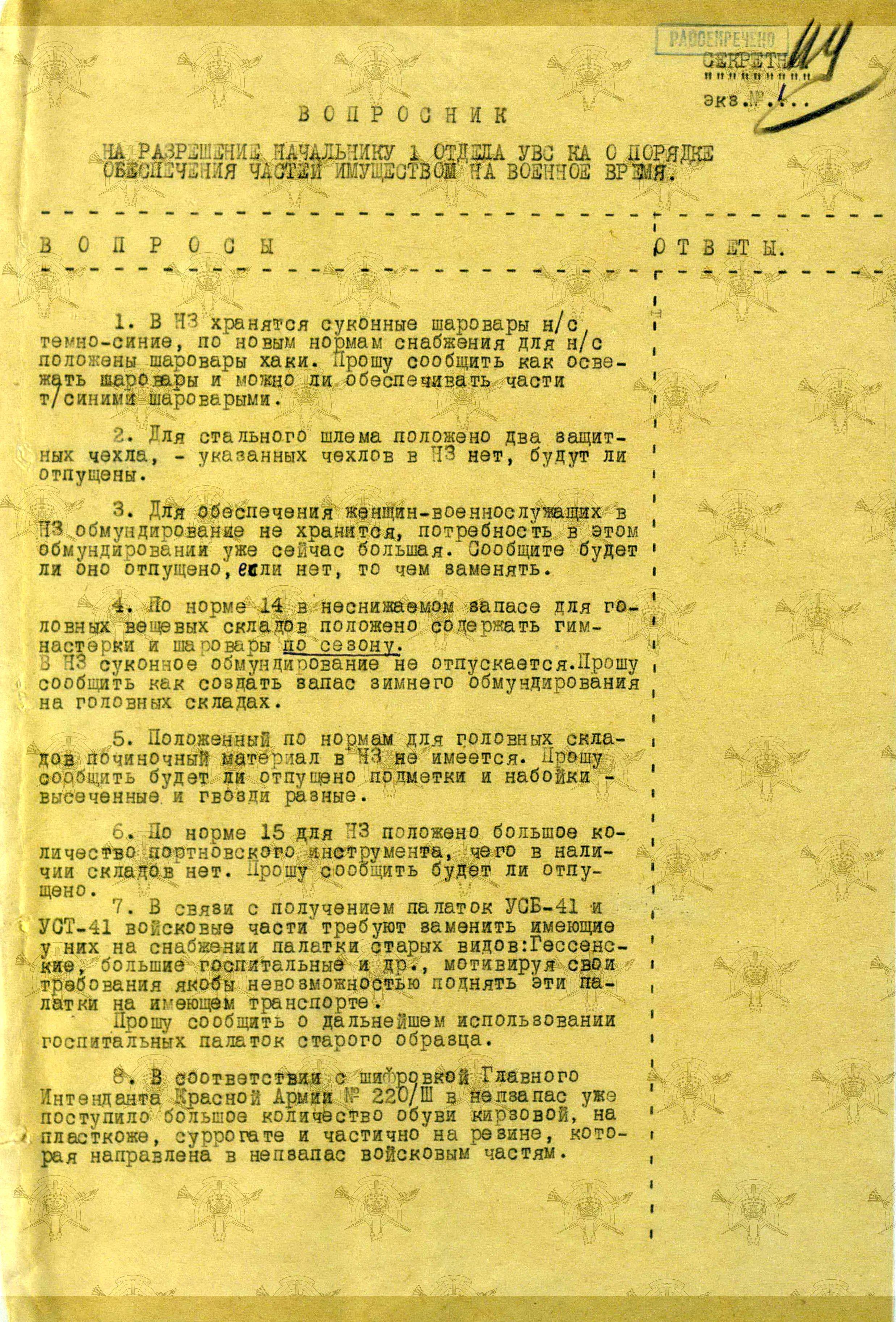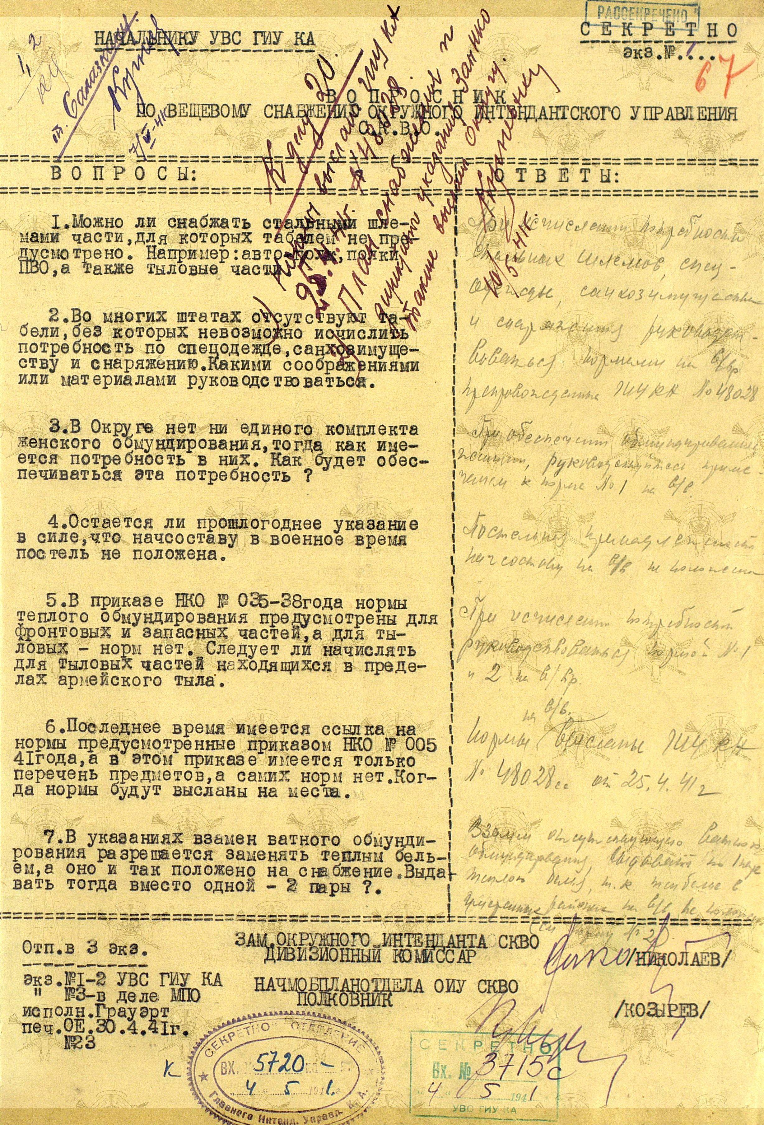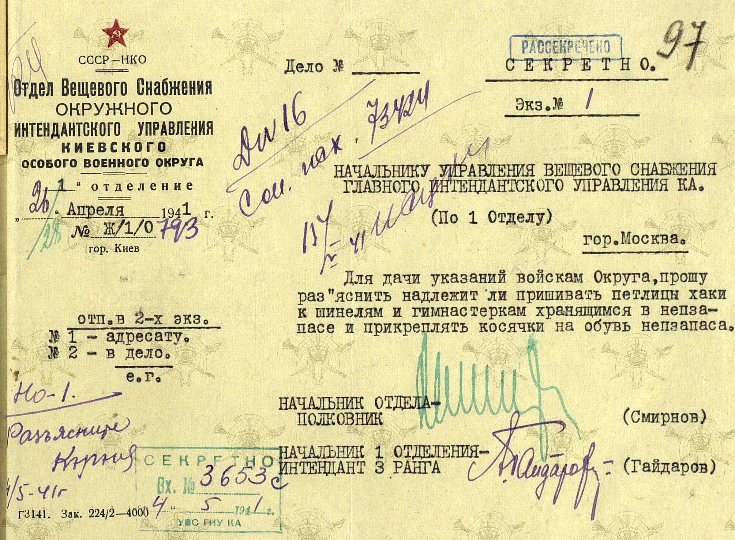 Так, Отдел вещевого снабжения окружного Интендантского управления (ОВС ОИУ) Киевского ОВО поставил перед специалистами Управления вещевого снабжения ГИУ КА два вопроса. Первые два — сугубо практические, оказывающие непосредственное влияние на выполнение мероприятий мобилизации: