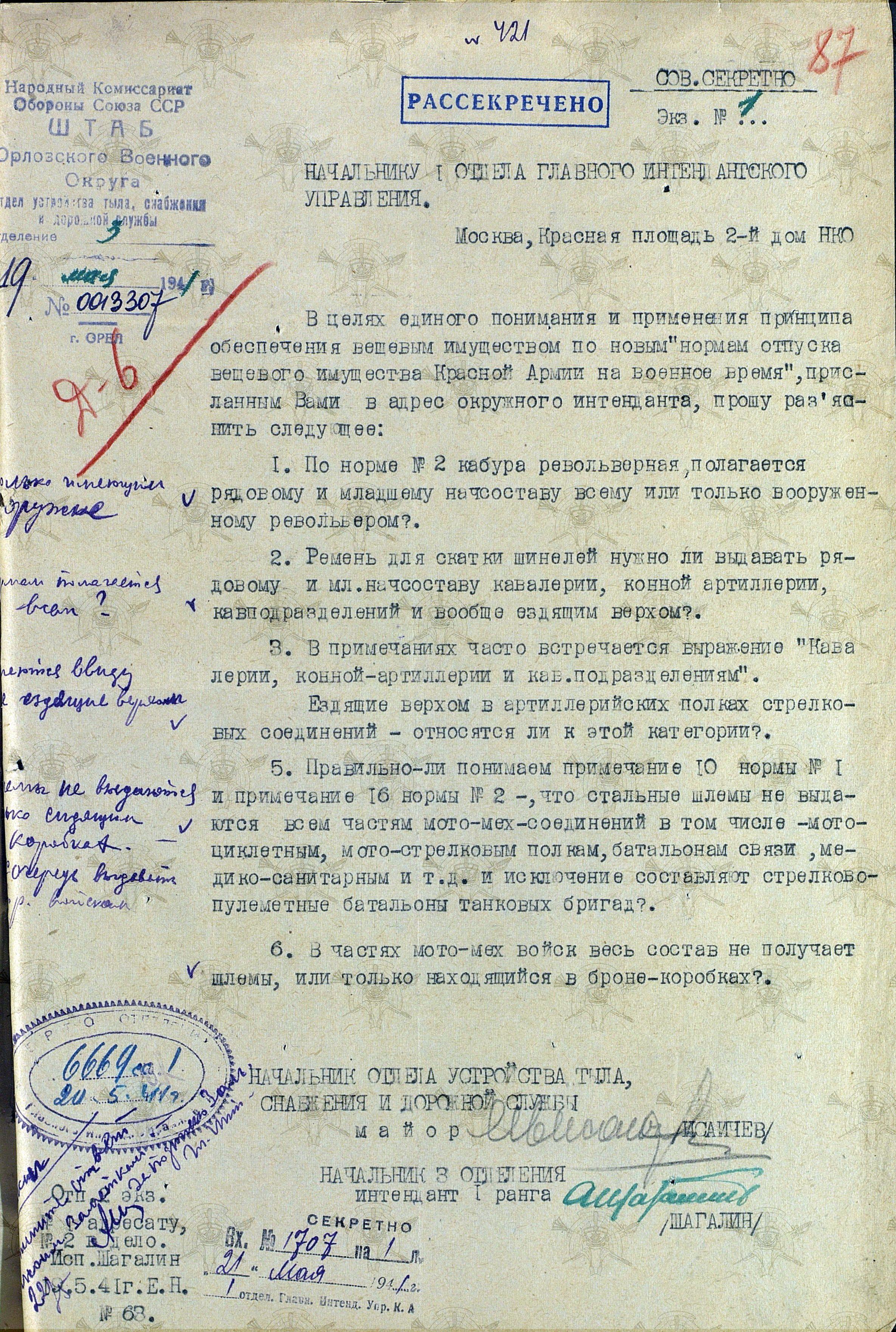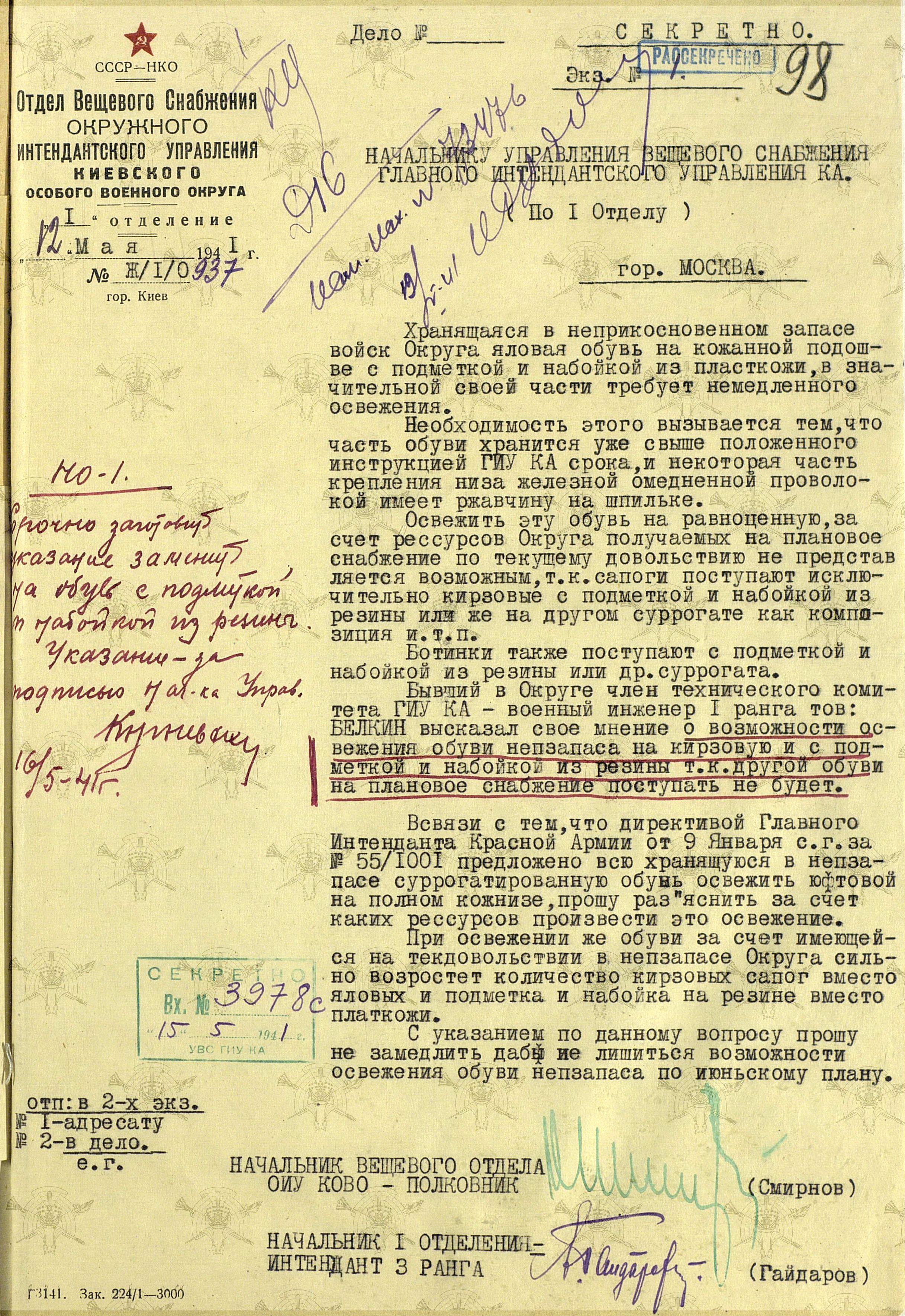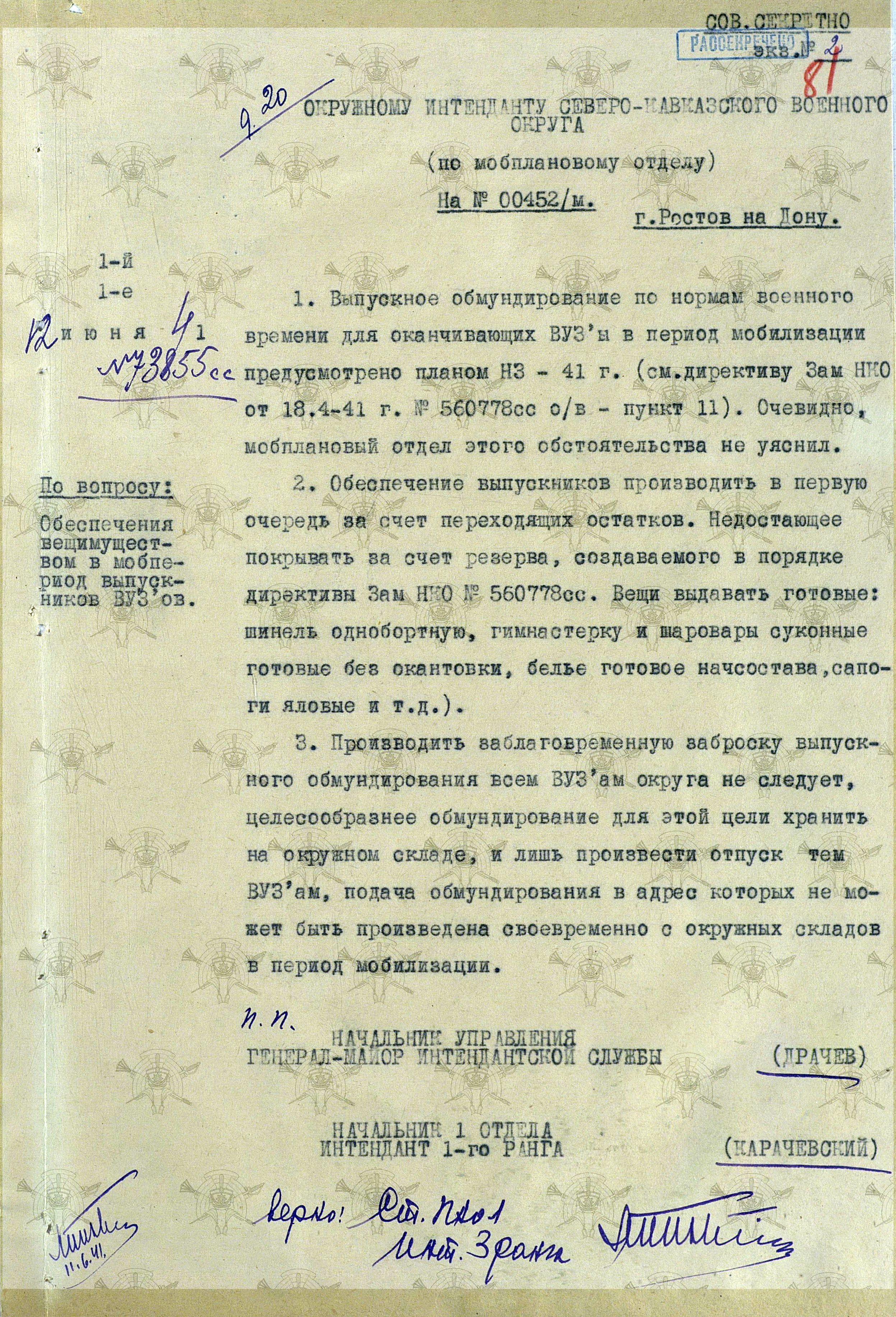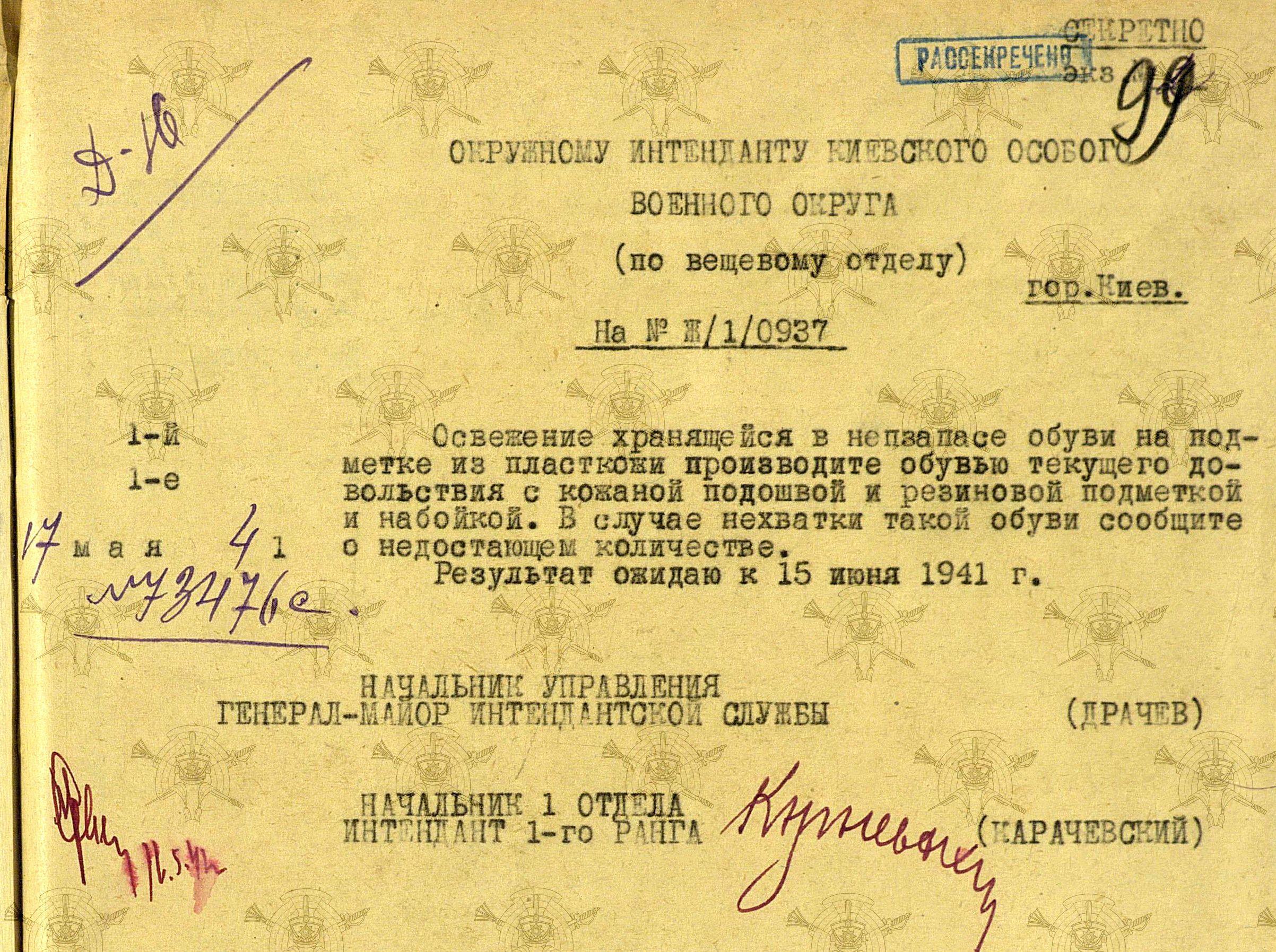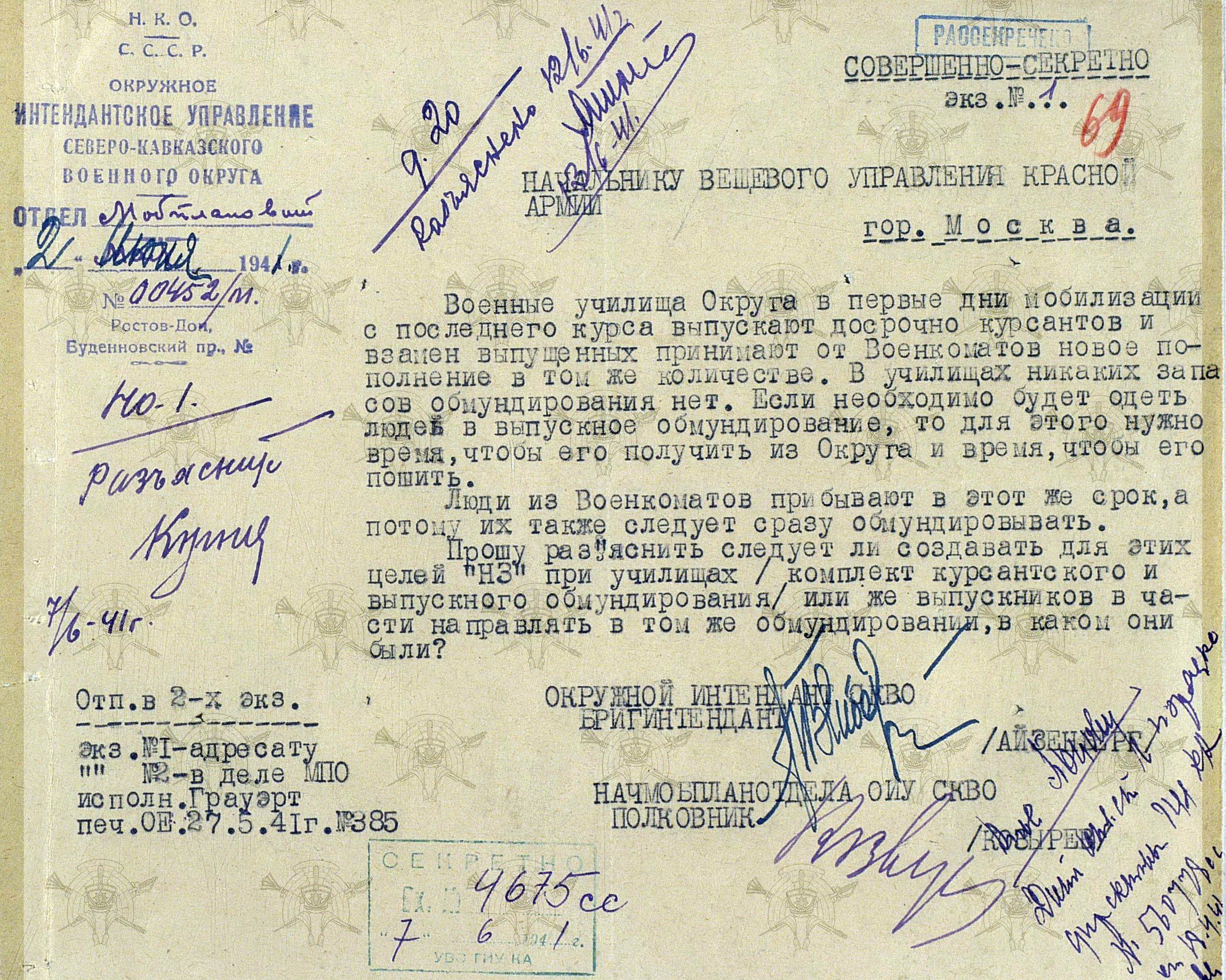 Так, Отдел вещевого снабжения окружного Интендантского управления (ОВС ОИУ) Киевского ОВО поставил перед специалистами Управления вещевого снабжения ГИУ КА два вопроса. Первые два — сугубо практические, оказывающие непосредственное влияние на выполнение мероприятий мобилизации: