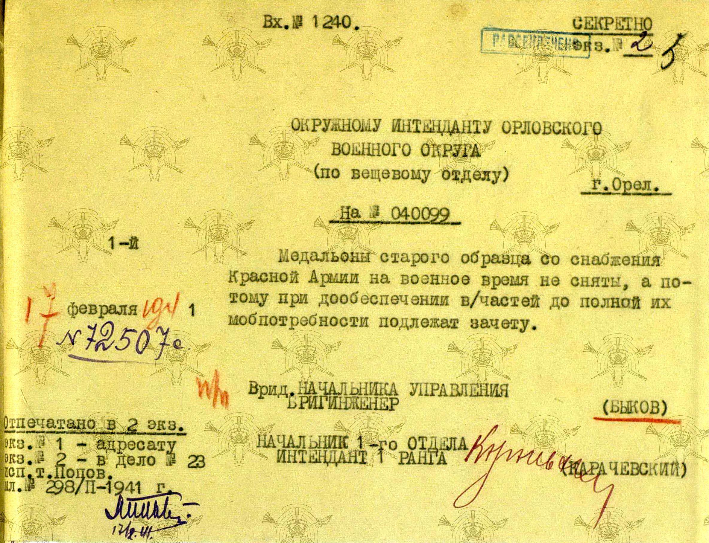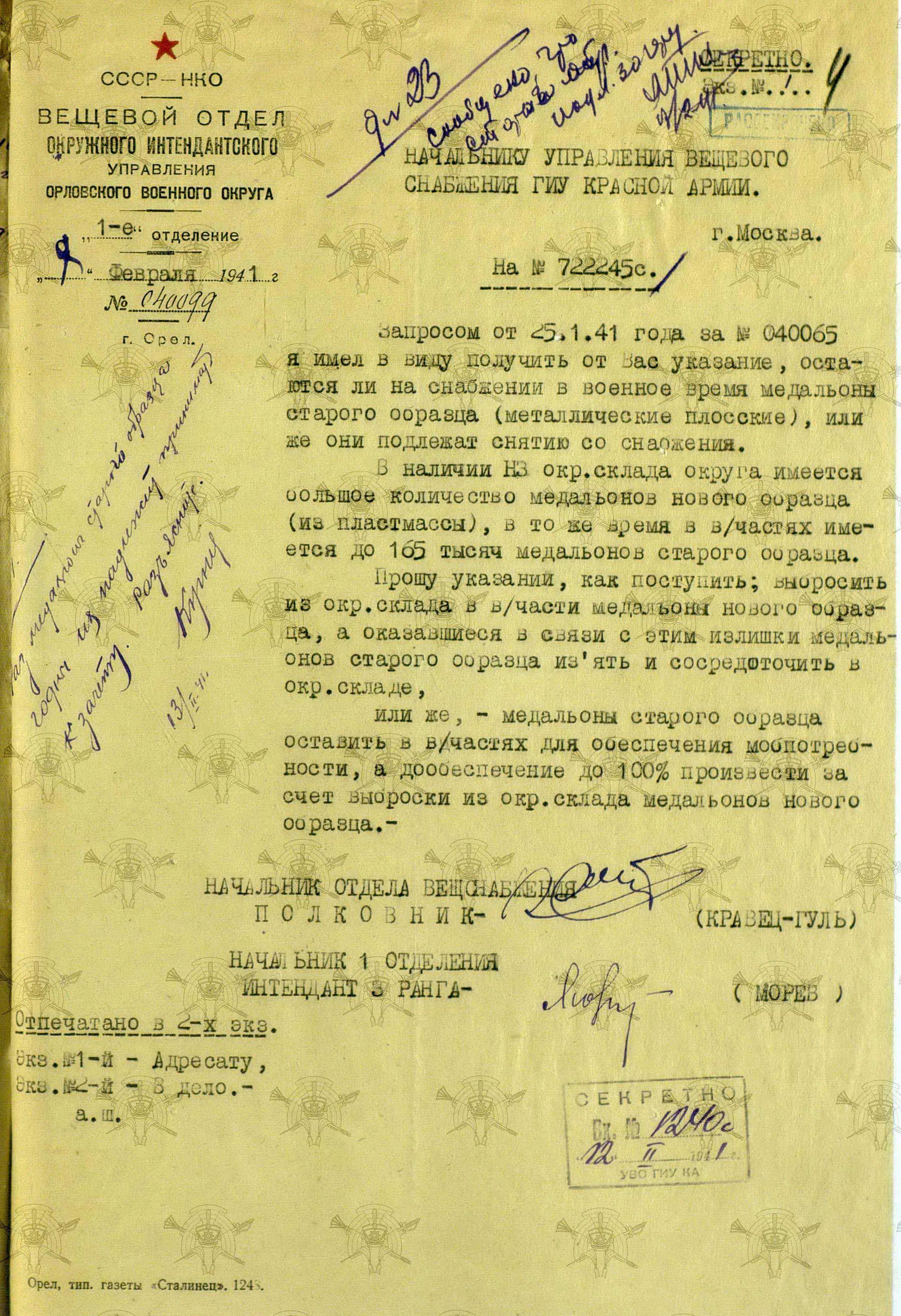 Специалисты Орловского военного округа задают вопрос, как им быть с медальонами старого образца. Переписку по медальонам я уже выкладывал, но на всякий случай продублирую запрос ОрлВО и ответ на него. Возможно, читатели уже забыли о этой публикации.