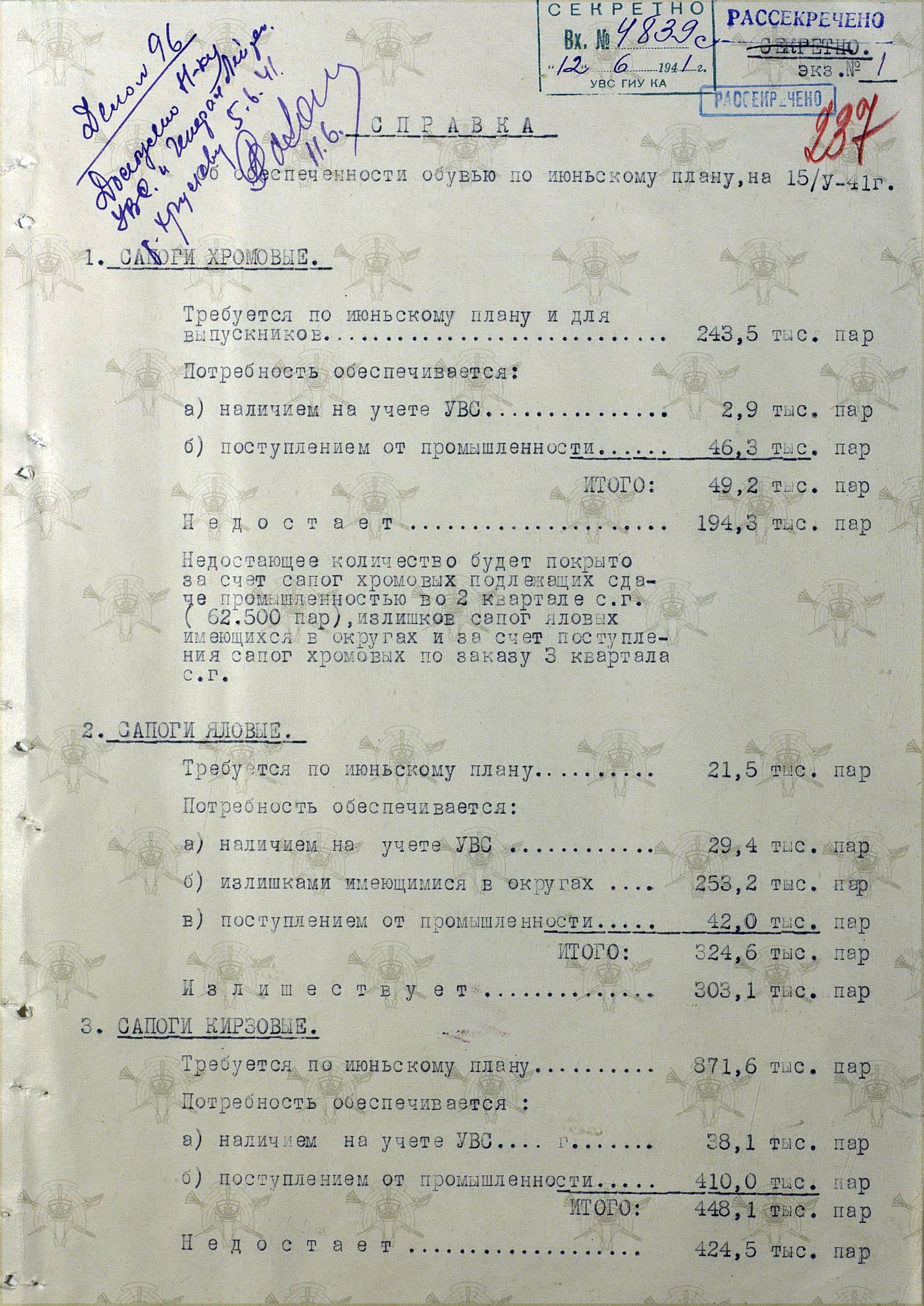 Кстати, к вопросу какую обувь должны были носить командиры и бойцы Красной Армии: сапоги хромовые/яловые/кирзовые/ботинки. Вот справка об обеспеченности обувью по июньскому плану, по состоянию на 5 мая 1941 г. Как видите, «хромачей» не хватало и их планировали заменить сапогами яловыми. К сожалению, подобных сведений по округам пока нет. В сводных таблицах проходило одно наименование — обувь, включавшая в себя и сапоги, и ботинки.