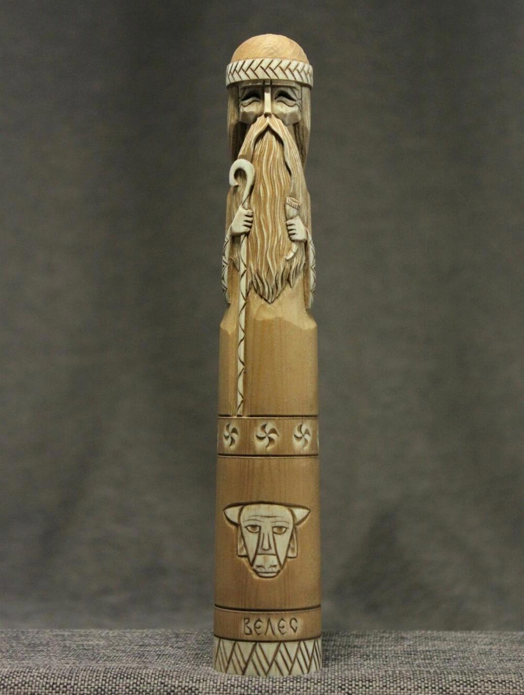 Вот так Велеса видит Челябинский мастер по дереву Александр, мы у него Банника заказывали с супругой ( https://author.today/art/191193тот который по меньше, а второй большой ему в друзья, потому как после ухода принимающих Баню, Банник ведь с друзьями парится и поэтому ему обязательно и веник оставляется и воды немного. Не будите уважать - шалить начнёт