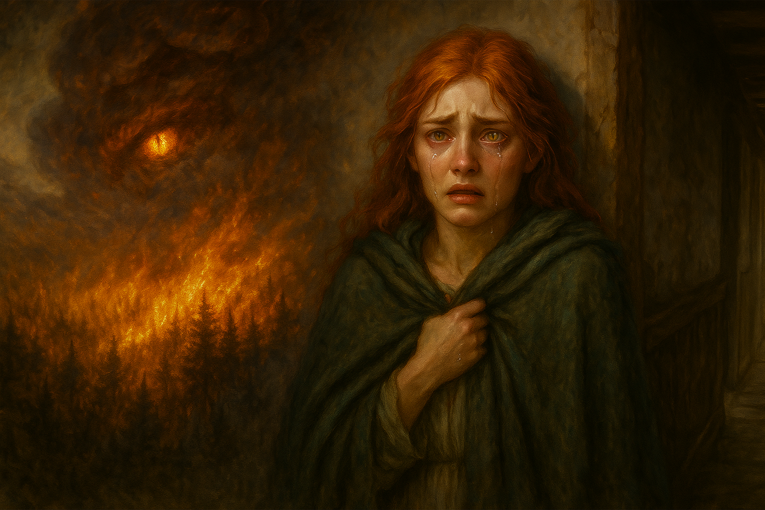 Прикрывая бесшумно дверь, Лиса по-прежнему прислушивалась к своему сердцу, отчего-то оно тревожилось и билось в безумном темпе. И вдруг, подобно вспышке молнии, в её сознании всплыл сегодняшний сон. От воспоминаний у девушки буквально подкосились ноги, и она прислонилась к потрёпанной стене коридора. Все её переживания, оказывается, были обращены в этот сон. Лиса вспомнила его во всех подробностях, будто бы прямо сейчас она оказалась там и, подобно бестелесному и невидимому духу, наблюдала с высоты за тем, как горит родной Тёмный лес… Священные Изумрудные деревья жалобно трещали, поедаемые безжалостным пламенем, клубы чёрного дыма поднимались к отрешённому багровому небу. Обозревая весь огромный горящий лес издалека, Лиса в то же время могла разглядеть и детали внутри него. Например, своего приёмного отца, Серебряного Тигра, который, как и сородичи, тщетно поливал из ведра этот огромный пожар. Как ни старались валдринги тушить пламя, создавалось впечатление, что кто-то продолжает раздувать этот погребальный костёр. Приглядевшись, Лиса заметила неясный силуэт за пределами леса, у которого на голове было одно пылающее око. Огонь продолжал захватывать лес, и в нём исчезали очередные его обитатели, их дома, и всё, что связано с их народом… Видение было слишком живым. Пламя жгло не лес, а её изнутри. Лиса не выдержала, и по её щекам потекли слёзы. Не оставалось ничего, лишь чёрная мгла заволокла всю картину жуткого бедствия, и сквозь дым на неё был устремлён взгляд всё того же пылающего глаза, пристальный и пронизывающий. Постепенно наваждение отступило, дым растворился на поверхности грязной стены трактира. Подчинившись непреодолимому желанию подышать свежим воздухом, Лиса направилась к лестнице.