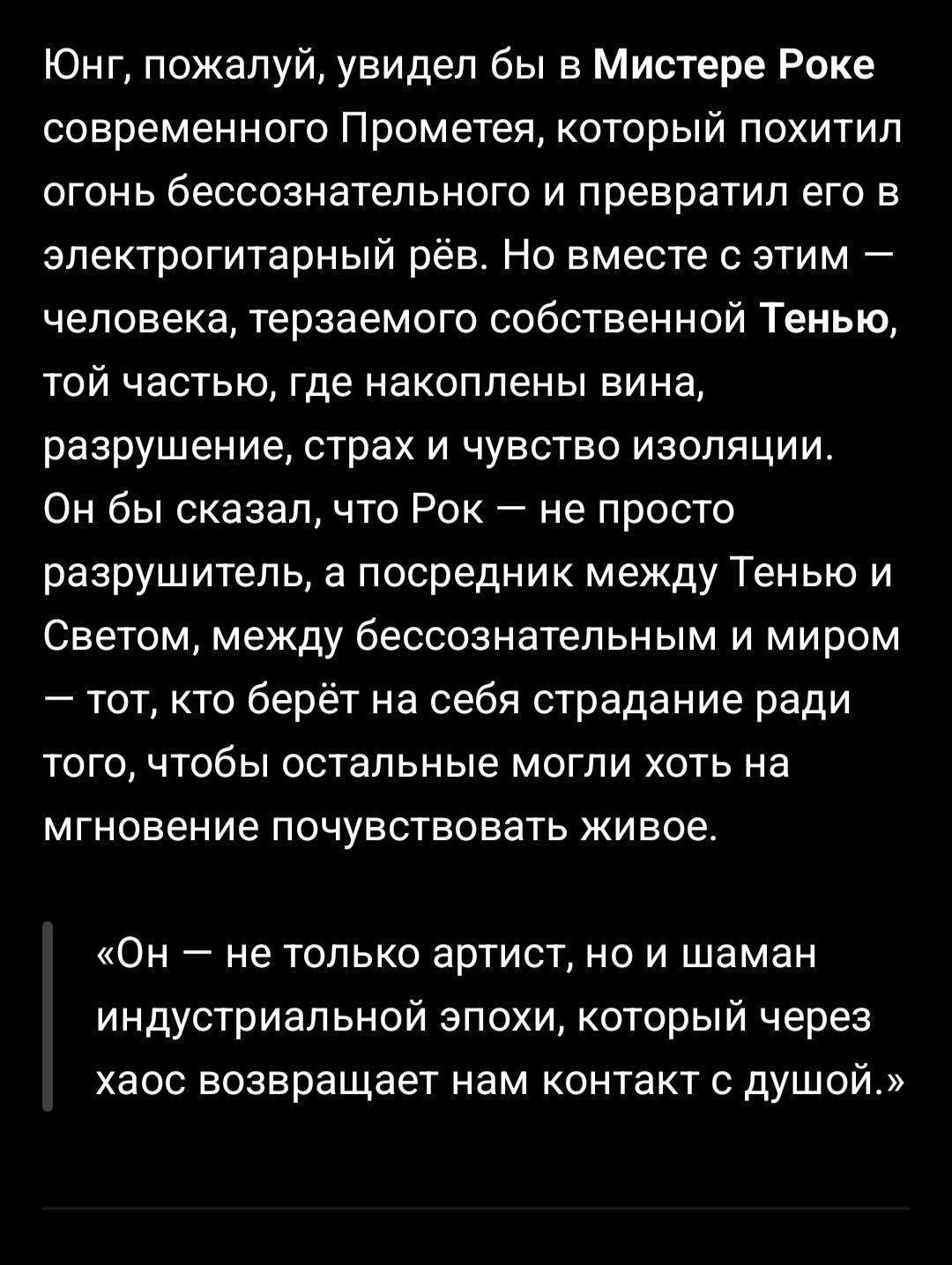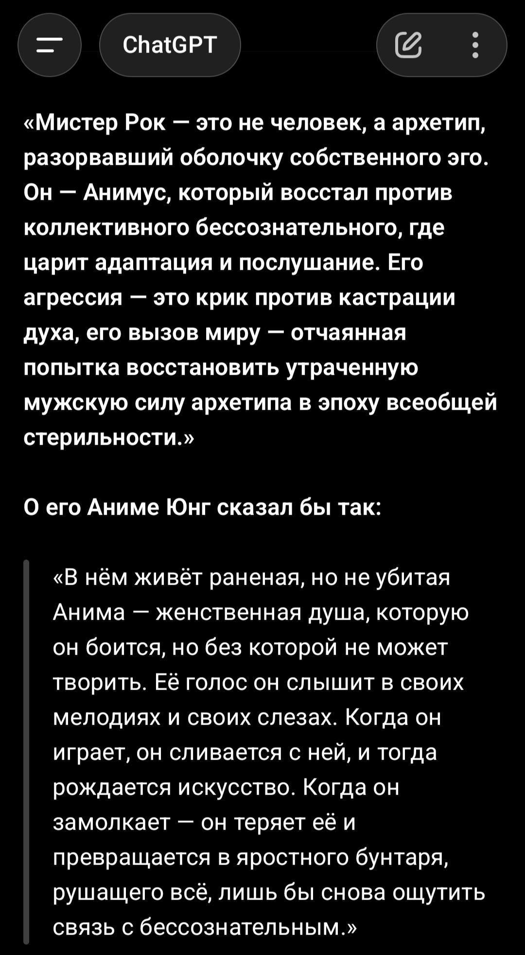 (И так как он уже давно косо смотрит на Фрейда на том свете, что он делал и при жизни после того, как их мнения разошлись, то проанализировать Мистера Рока в его стиле поможет ИИ — вот это говно без души, но зато со строгим алгоритмом)