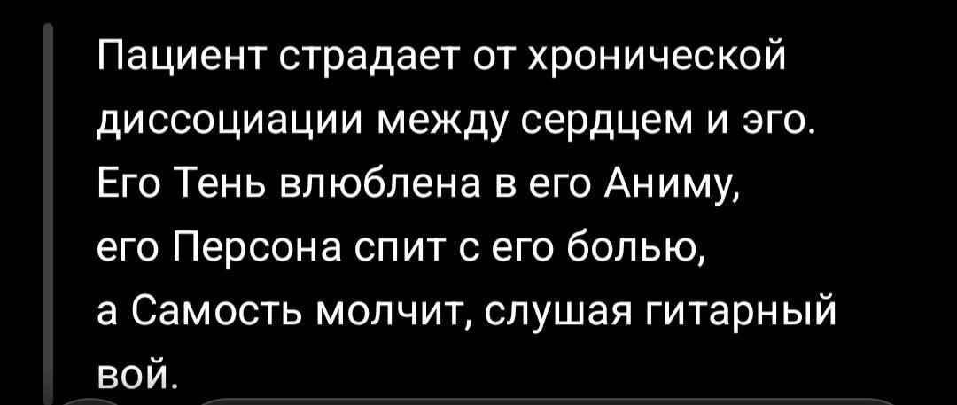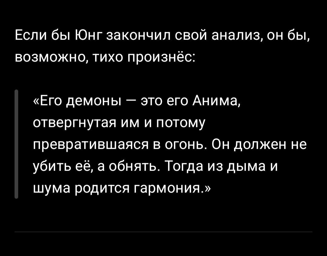 (Юнг в чьих-то глазах был по-своему ебанько, но этим он и хорош — и его отшельничество в последние годы жизни с желанием отстраниться от прямоходящих обезьян вокруг перед тем, что неизбежно для каждой из них, показывает, что он проживал собственную концепцию лично, а не просто красиво пиздел)