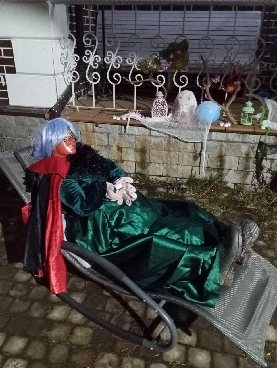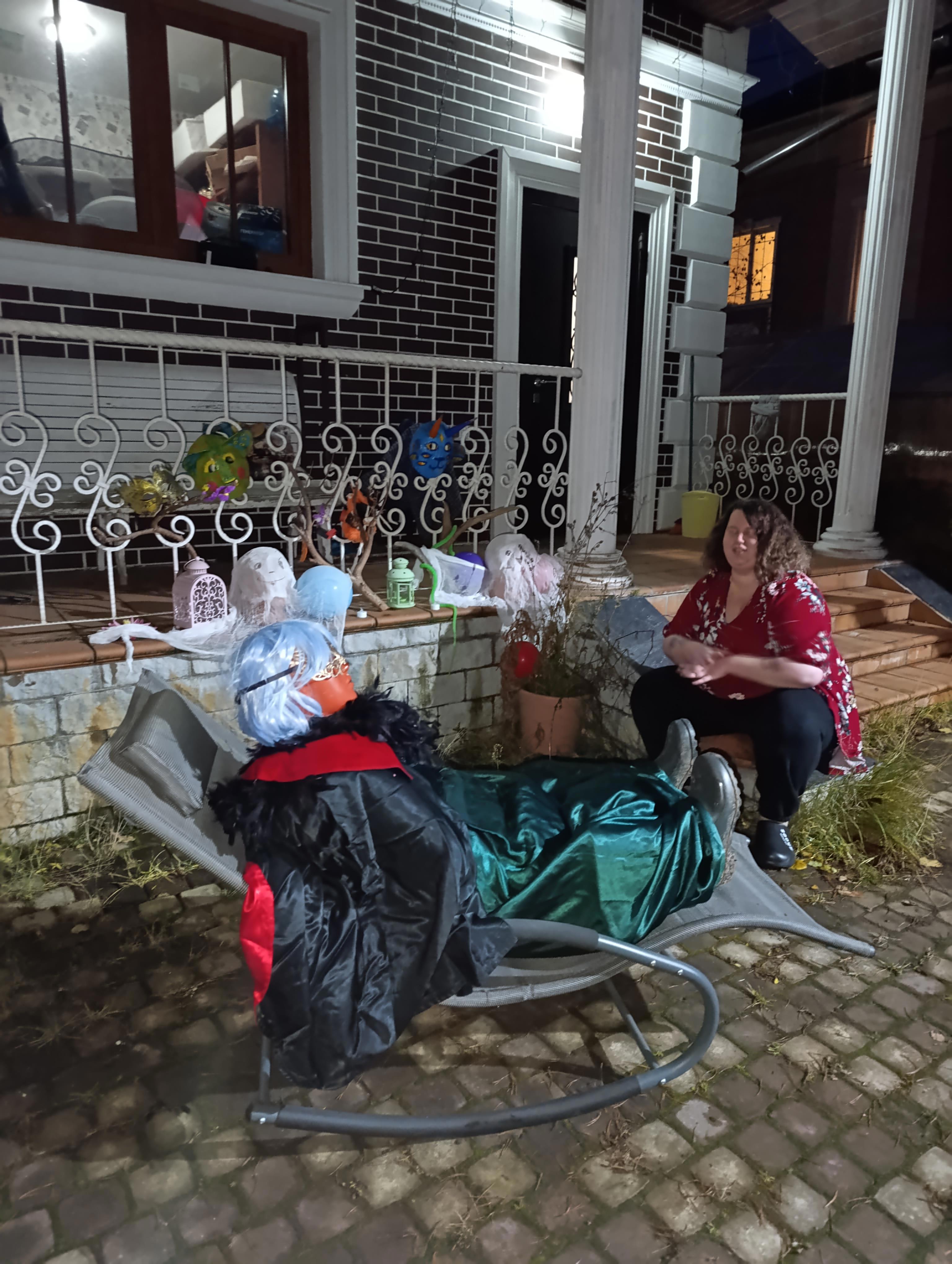Знаете, это довольно страшно, когда на тебя идёт по улице толпа радостных разукрашенных разновозрастных деток с корзинками и мешками для конфет. Посетить деткам предстояло 13 домов. Наш был примерно вторым, и детишки были радостные и свежие. Когда динозавру предложили оторвать хвост, я была вынуждена отказаться. На фото же радостно соглашалась. Было весело и шально. Дочь даже расстроилась, что толпа, нахлынув парой волн, ушла радовать других.Я для себя поняла, что от надувного динозавтра ждут мужской голос, надо молчать. А вот привидение может быть любым. Мы час потратили на укладку дохлой дамы, которую мало кто заметил.