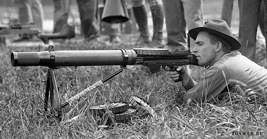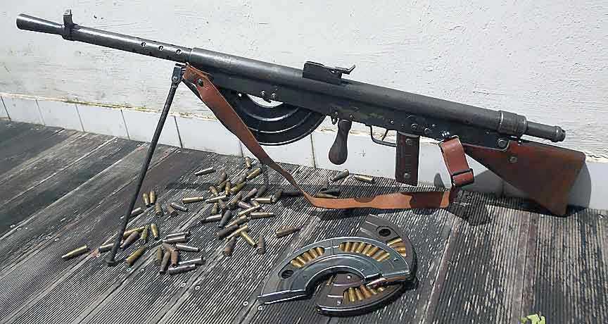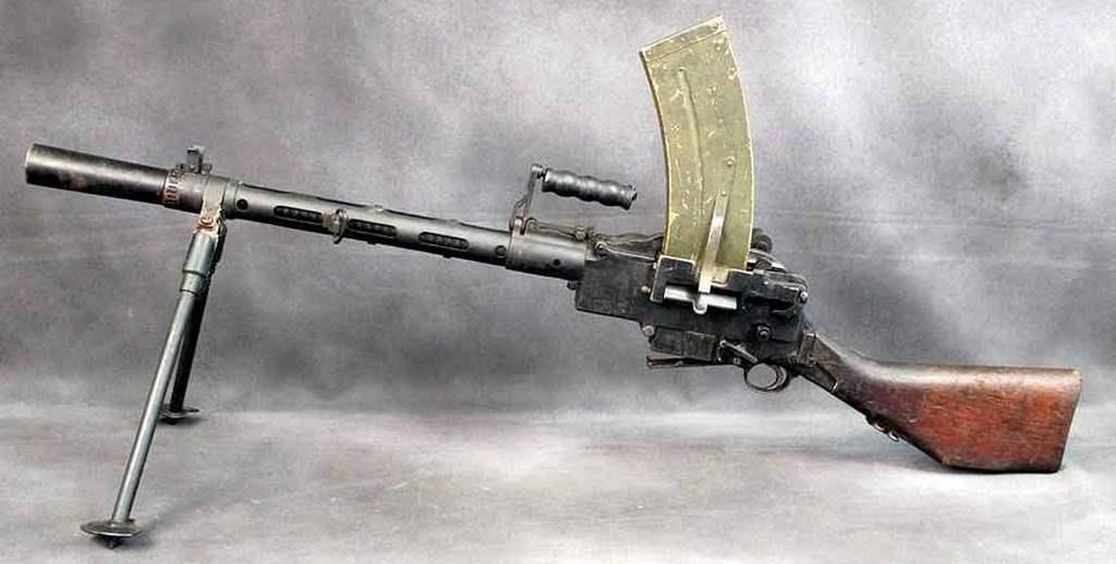 Самый дальний пулемёт на снимке не узнать вообще невозможно, если вы родились и выросли в России. Именно с таким пулемётом бился с бандитами на берегах Каспийского моря товарищ Сухов. Да, это тот самый фильм, который до сих пор смотрят космонавты перед полётом. Пулемёт же вообще немного необычный. Его толстенный ствол не означает водяного охлаждения – оно было воздушным с применением алюминиевого радиатора в кожухе. Но это далеко не единственная особенность. Даже такая маленькая деталь – его американского изобретателя звали вообще-то Самуэль Маклин. Не ищите в названии этого имени – его там нет. Пулемёт назван в честь человека, который организовал его производство и продвигал на рынок оружия. Когда в США не задалось, полковник Льюис перебрался в Европу и в 1913 году пулемёт был принят на вооружение в Бельгии. После этого пулемётом заинтересовались англичане и только потом пулемёт «вернулся на родину», в США под маркой BSA Lewis Mk.I: