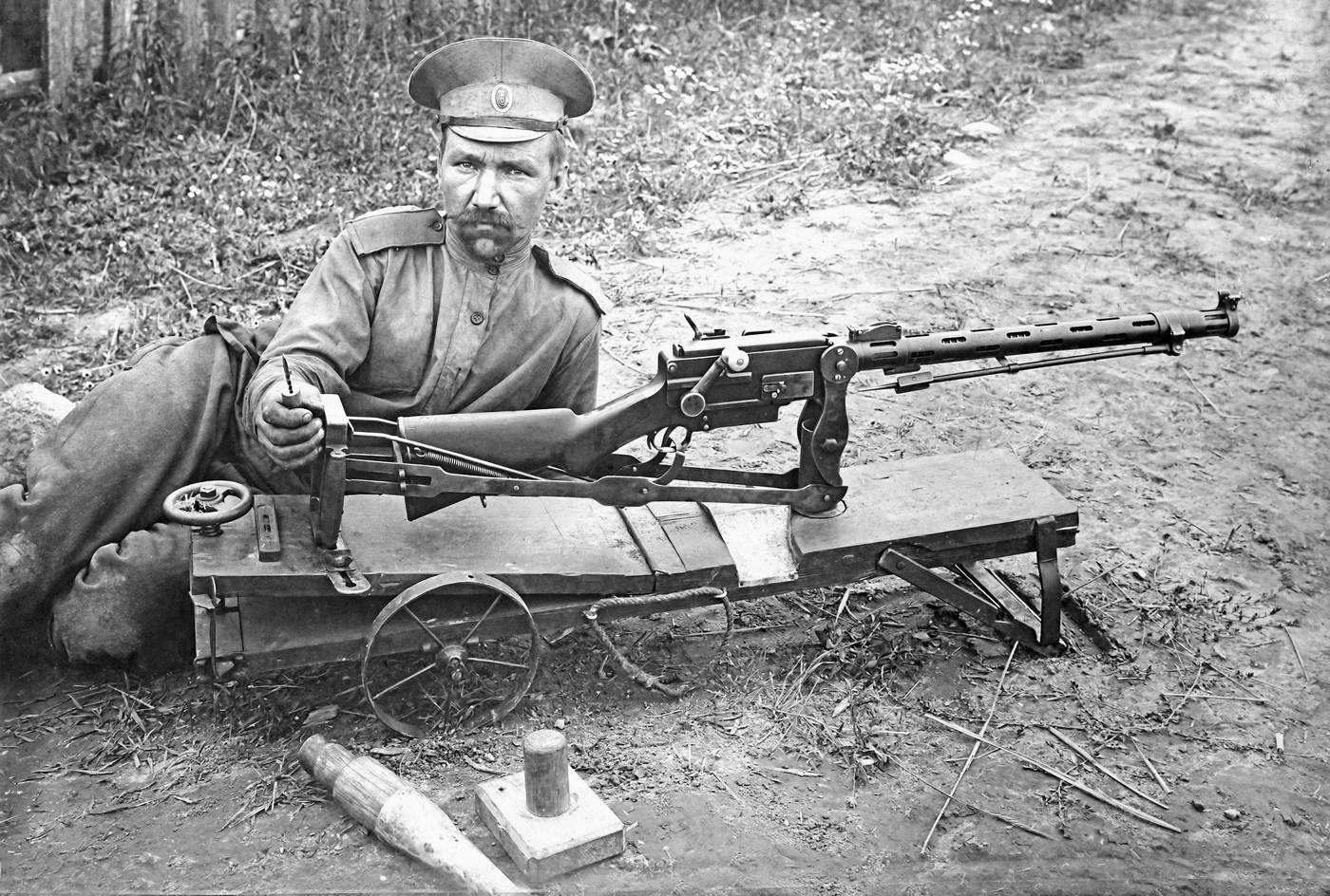 Пулемёт при весе всего 9 кг стрелял со скорострельностью 450 выстрелов в минуту с прицельной дальностью в полкилометра. Россия была первой страной, которая закупила 1250 этих пулемётов у датчан. У нас уже переделанный под наш патрон пулемёт получил обозначение «ружьё-пулемёт образца 1902 года». Вскоре они пригодились для войны с Японией. Именно такие пулемёты устанавливались в числе других на тяжёлых бомбардировщиках «Илья Муромец». Попали они и в армию. Там они активно использовались и даже модернизировались для большей эффективности. Например, вот на этой фотографии как раз такая «народная» модернизация в виде самодельного станка: