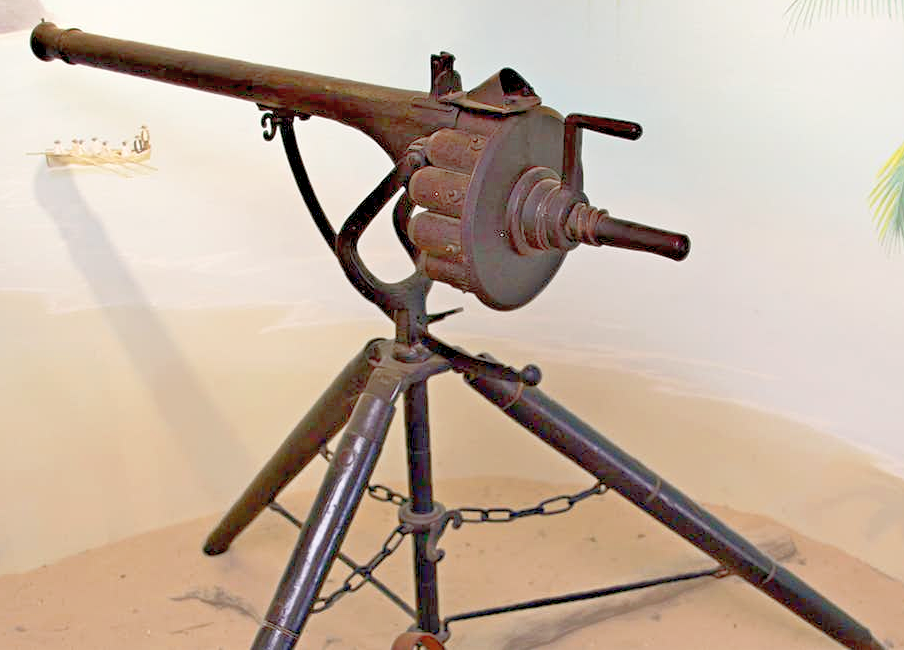 А! Там же нет никакого механизма, то есть процессом в процессе руководить нельзя. Хорошо. Тогда можно вспомнить, например, митральезы Уильяма Гарднера от 1880 года и вообще митральезы. Вот посмотрите на это изделие – чем это не пулемёт? Даже по внешнему виду его трудно отличить от того же Максима, хотя на самом деле там, в латунной банке для охлаждающей воды, не один, а два ствола, которые работали по очереди: