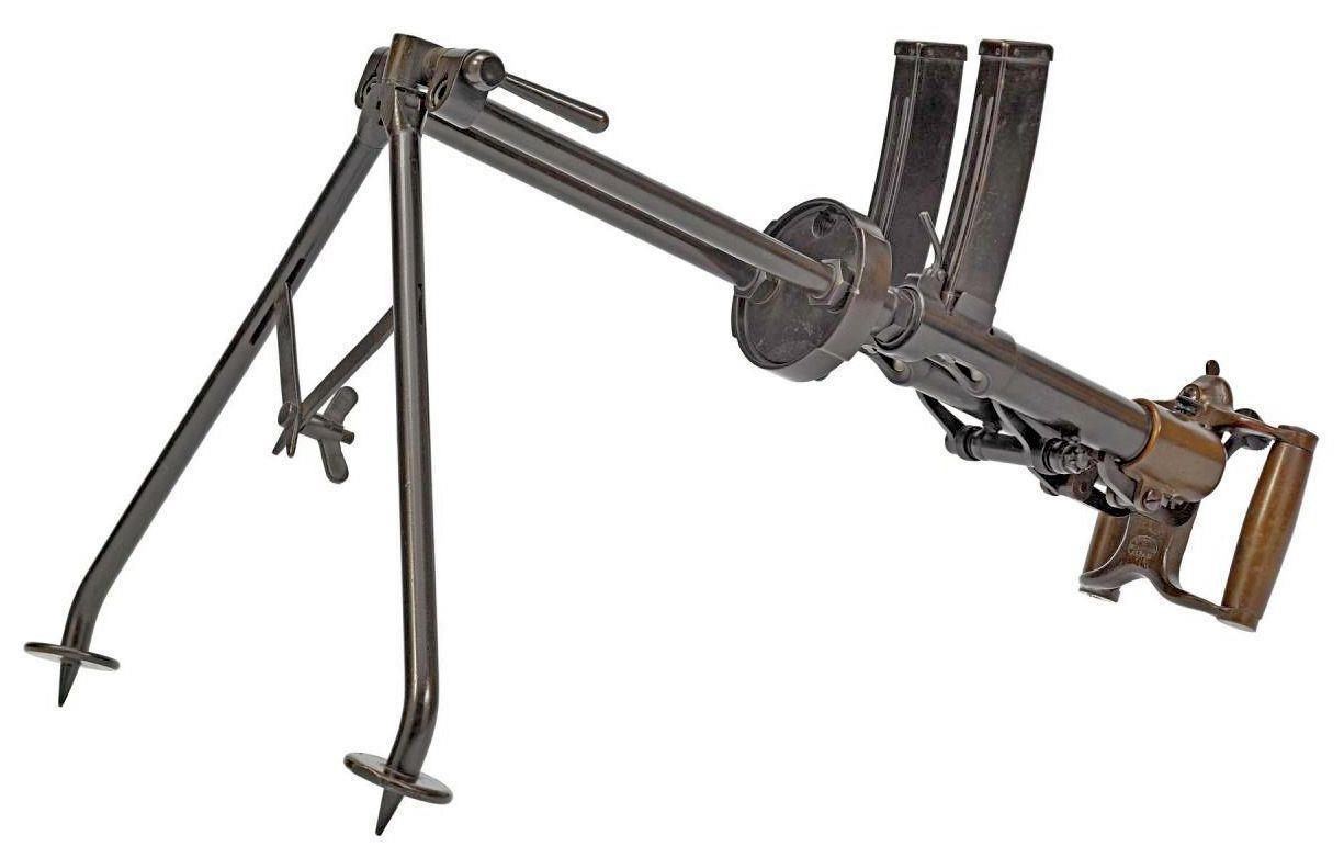 Как вы, наверняка сразу заметили, пулемёт состоял из двух вполне самостоятельных автоматов, соединённых вместе, видимо для увеличения плотности огня. Авиаторы его отвергли, как слишком маломощный и тогда его определили на вооружение горнострелковых подразделений в качестве лёгкого пулемёта. Патрон 9х19, начальная скорость вылета пули всего около 320 м в сек. Потом ещё были попытки разделить оружие на две части для использования их по отдельности. Всё равно ничем хорошим дело не кончилось.
