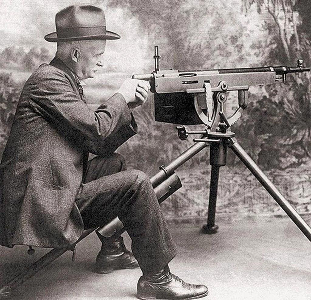 Всё это так, но я предлагаю ещё раз посмотреть на старые фотографии. На них можно найти другой пулемёт, который не очень-то отстал по времени от Максима. Это пулемет Кольта Браунинга (Colt Browning M1895). Вот фотография самого автора со своим детищем: