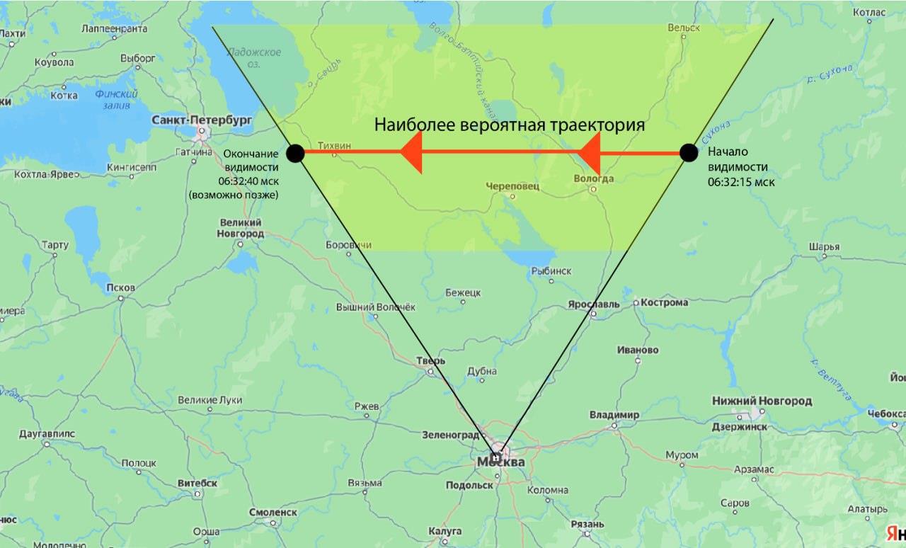 Если считать, что объект перемещался на высоте в диапазоне от 100 до 60 км, то это означает, что его траектория проходила на расстоянии от 350 до 700 км к северу от Москвы. Наиболее вероятное расстояние с учетом баллистического характера движения— от 450 до 500 км.