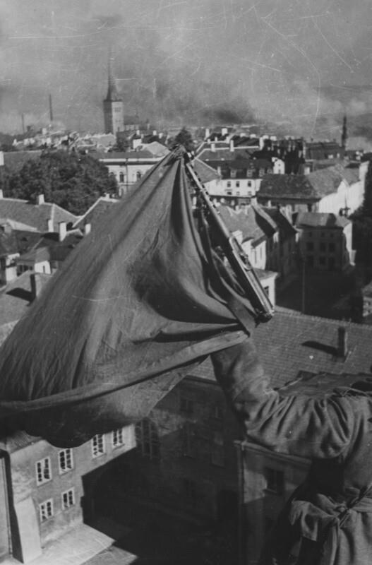 Советский солдат рядовой В. Вьюрков держит пистолет-пулемет ППС-43 с прикрепленным к нему флагом на башне здания Президиума Верховного Совета Эстонской ССР в Таллине.