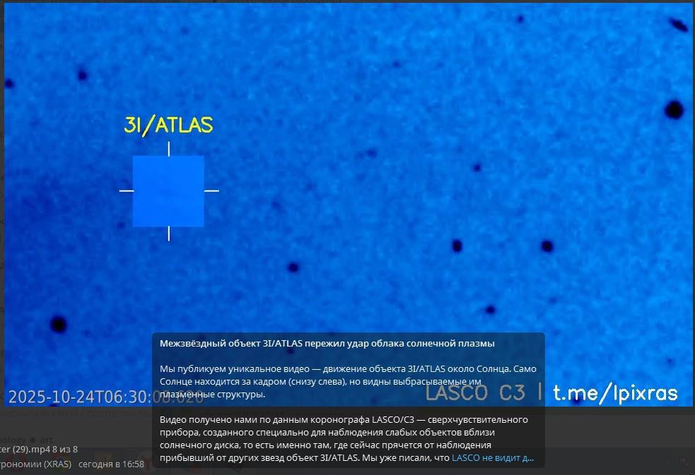 Мы публикуем уникальное видео — движение объекта 3I/ATLAS около Солнца. Само Солнце находится за кадром (снизу слева), но видны выбрасываемые им плазменные структуры.