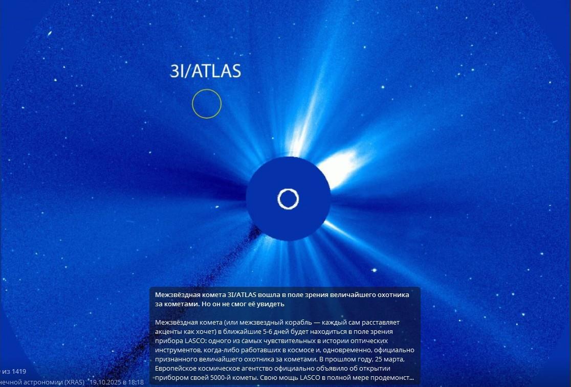 В данном случае, однако, прибор оказался бессилен. Расстояние до тела от Земли составляет сейчас более 350 миллионов км, и такая дистанция, как стало понятно, оказалась неподъемной даже для инструмента такой мощи. Комета не видна. До 19 декабря 3I/ATLAS приблизится к Земле на минимальное расстояние 260 миллионов км (всё ещё гигантская цифра), но в данном случае это уже не будет иметь значение: из поля зрения LASCO объект уйдет уже через 5-6 дней.
