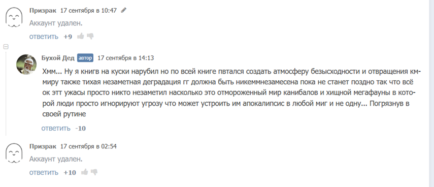 и когда я пишу свои "страшные книги" они реально страшные... Но для меня ибо больное сознание живо рисует все детали и нагнетает ту самую удушающую атмосферу которую я хотел вложить в варвара... кстати я его закончил и на рулейте уже есть последняя глава