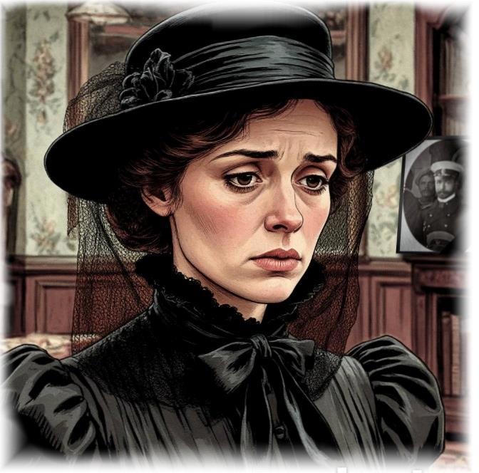 Когда муж погиб с адмиралом на "Петропавловске", застряла в Артуре - сначала ждала и надеялась, что отыщут тело мужа (зря, не нашли), потом сильно заболела, а когда встала с постели - железнодорожное сообщение уже прервалось. На верхней картинке - Каргополов видит её на пирсе в первый свой день в Артуре. Сама она, ясное дело, в трауре.