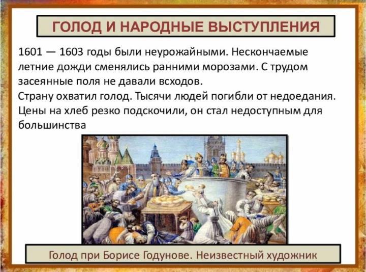 В 1600-1603 годах, также случился мощный голод. Российский народ буквально ел себе подобных, кто порешительней до посильней - объединились в банды. Массами бежали на Дон и на Днепр, - на юг. Страна запустела, дороги заполонили лихие люди и охрана олигархов, также промышлявшие разбоями... даже в Москве было нечего есть. Власть имущие, однако, не голодали.