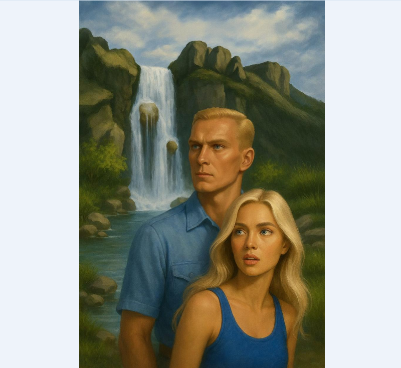 Как видно, в ней присутствуют элементы плакатов СССР - особенно в этом смысле примечателен парень с его рублеными чертами передовика какого-нибудь труда, характерным поворотом головы и устремленным вдаль взором, а также "знойная", будто "выцветшая" на солнце цветовая палитра. Окружение, впрочем, обыгрывает уже другое: девушка (удивленная, возможно, даже застигнутая врасплох) как будто отвечает за "подростковость" и разительно отличается от уверенных, "пробивных" женщин, которых обычно рисовали советские пропагандисты, а безмятежный горный пейзаж с водопадом и спокойными облачками кажутся искусственными (будто герои нашли изображение с ними и сфотографировались на его фоне). Здесь нет подчеркнутого, даже выпяченного символизма, нет игры объемов и/или масштабов - в сущности, за исключением парня, картинка очень "мягкая" и настраивает на мирную прогулку, а не на героические свершения. И, судя по описанию произведения, она действительно очень точно отражает его содержание и атмосферу. Но есть несколько "но".