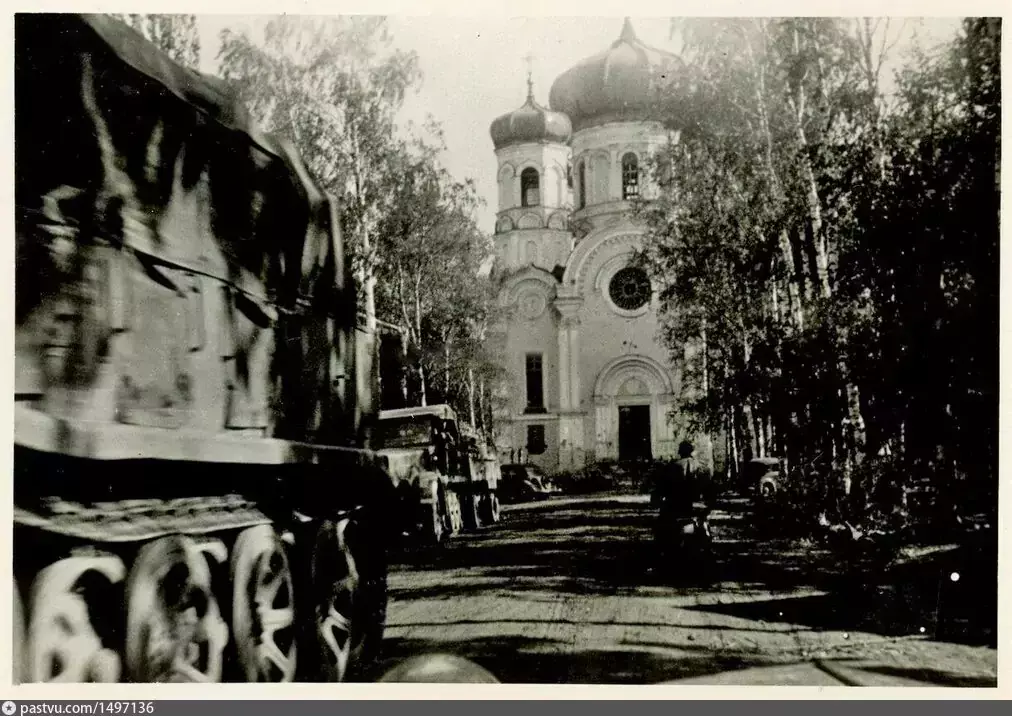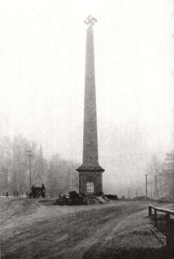 Перед войной его хотели реставрировать, стоял в лесах. Немцы этим воспользовались, воткнули наверху слепленную из какого-то металлолома свастику. Леса потом пустили на дрова.
