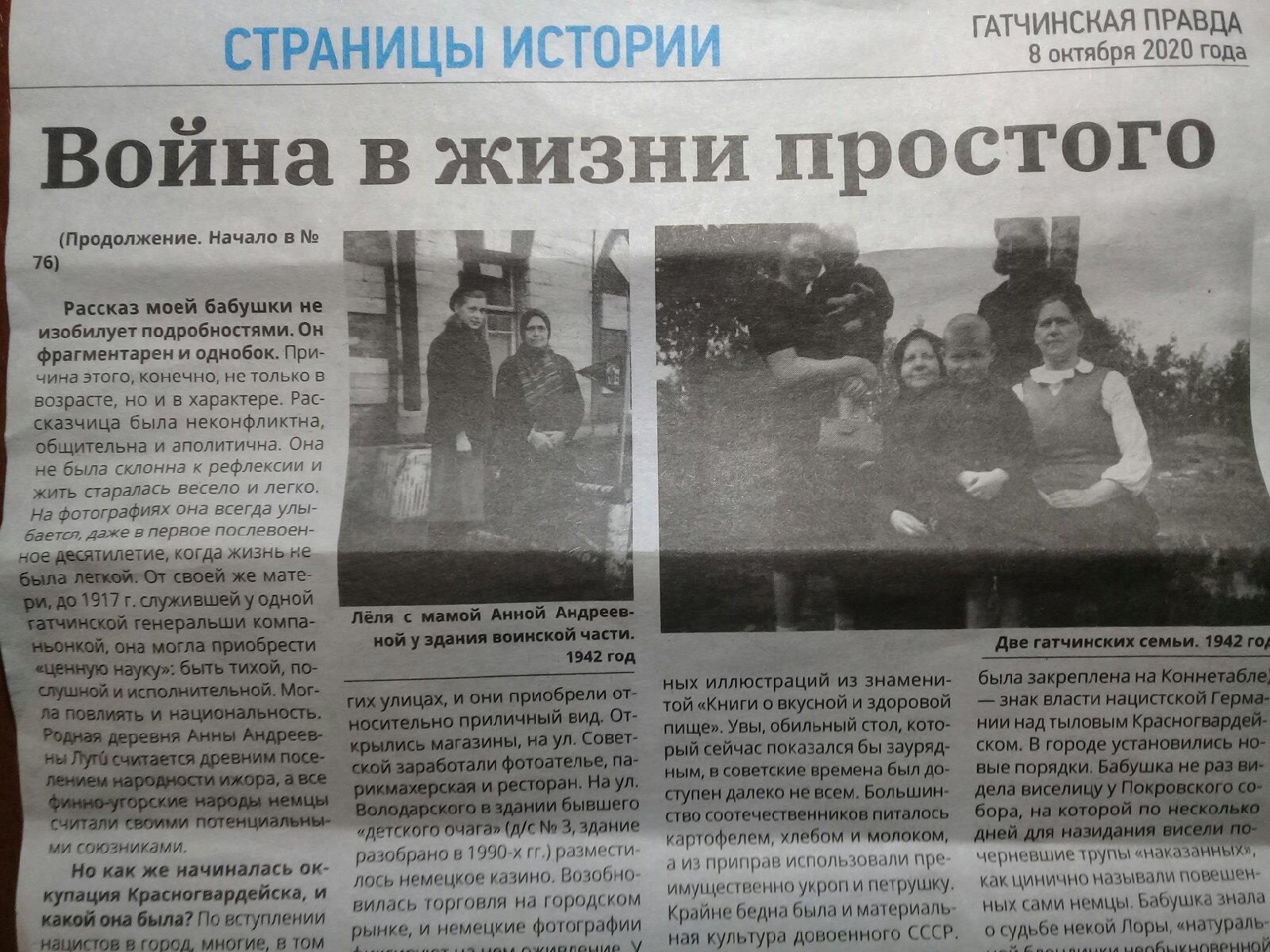 Некоторое время назад в гатчинской газете вышла скандальная статья, где человек приводил воспоминания своей бабушки, вызвавшая настоящую бурю эмоций (как понял, основная претензия — много восторгов всему немецкому). Смог отследить только следы этого события, саму статью уже удалили (а жаль).