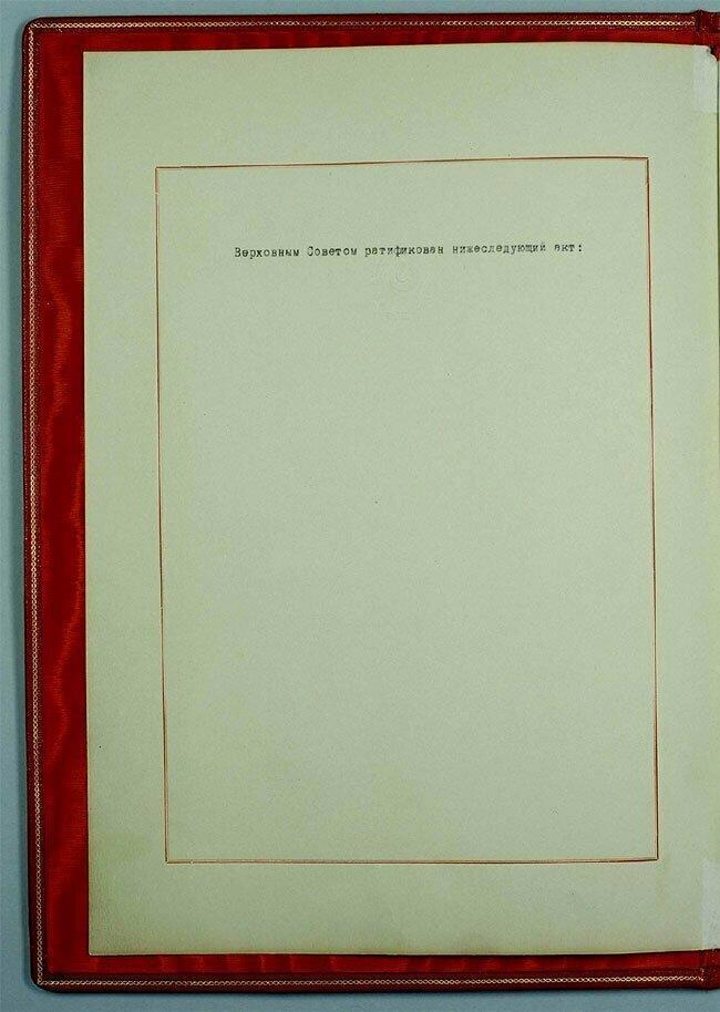 1. Первая страница русского текста Договора, сверху листа по центру тиснением выполнен герб СССР, первый абзац пронумерован вместо римской цифры - "1", нет красной рамки по периметру документа;
