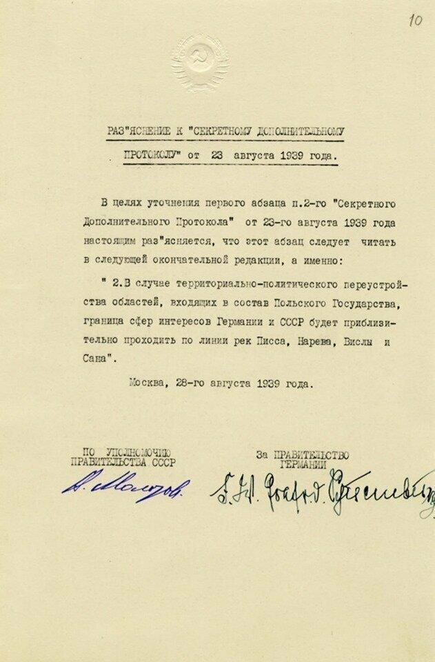 10. Разъяснения от 28 августа 1939 года к "Секретному Дополнительному Протоколу" на русском языке, сверху листа по центру тиснением выполнен герб СССР, нет красной рамки по периметру документа, в отличии от Договора и Протокола место "за кого подписывают" пропечатано (а не выполнено от руки) и нанесены подписи сторон на одном уровне одна относительно другой, но подписи радикально отличаются, как от подписей под Договором и Протоколом, как Риббентропа, так и Молотова, отсутствуют печати красного сургуча и прошивка красной тесьмой ;