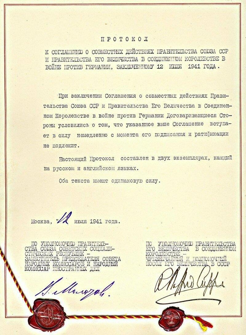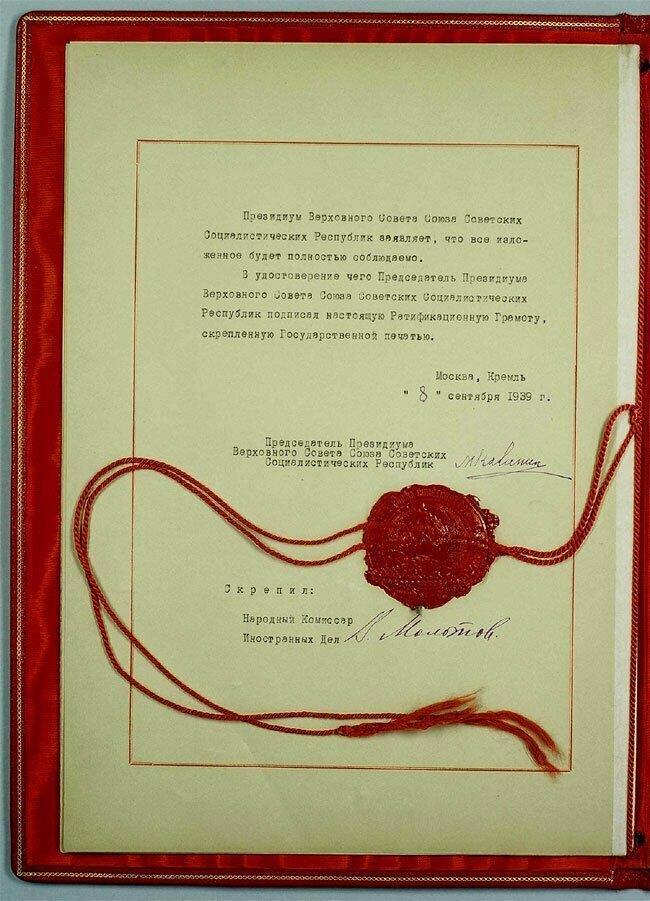 Ратификационная Грамота с Государственной печатью, с подписями Председателя Президиума Верховного Совета Калинина и Народного Комиссара Иностранных Дел Молотова, удостоверяющие, что "всё изложенное будет полностью соблюдаемо", как заявил Президиум Верховного Совета Союза Советских Социалистических Республик.