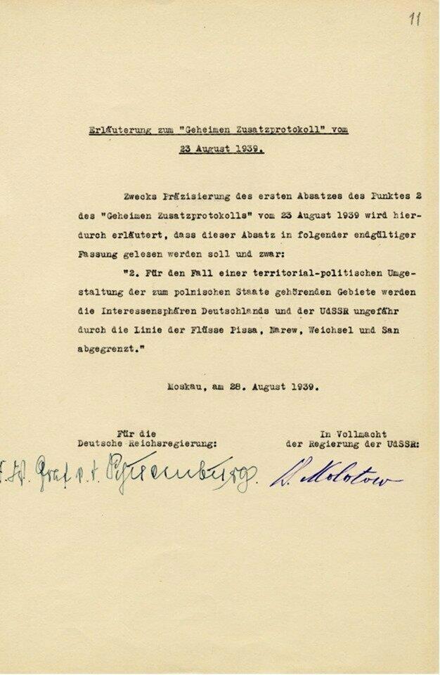 11. Разъяснения от 28 августа 1939 года к "Секретному дополнительному протоколу" на немецком языке, нет красной рамки по периметру документа, в отличии от Договора и Протокола место "за кого подписывают" пропечатано (а не выполнено от руки) и нанесены подписи сторон на одном уровне одна относительно другой, но подписи радикально отличаются, как от подписей под Договором и Протоколом, как Риббентропа, так и Молотова, подпись Молотова выполнена латинскими буквами, первая буква инициала выполнена русской буквой "В", отсутствуют печати красного сургуча и прошивка красной тесьмой.