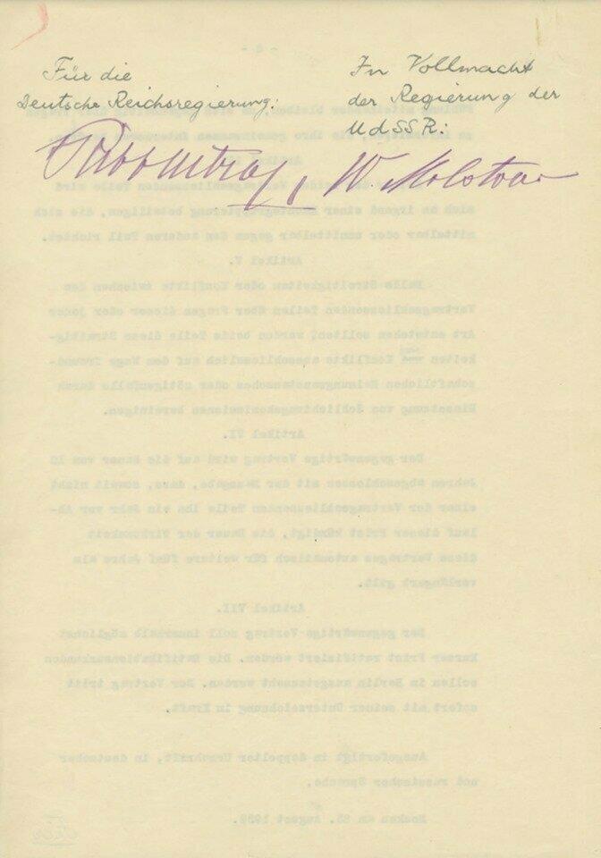 5. Третья страница немецкого текста Договора, нет красной рамки по периметру документа, присутствуют только подписи сторон и от руки описание за кого подписывают, подпись Молотова выполнена латинскими буквами, отсутствует текст договора на странице (это невозможно, ибо подпись удостоверяет текст - подпись на листе отдельном от текста договора быть поставлена не может), отсутствуют печати красного сургуча и прошивка красной тесьмой; нет красной рамки по периметру документа;