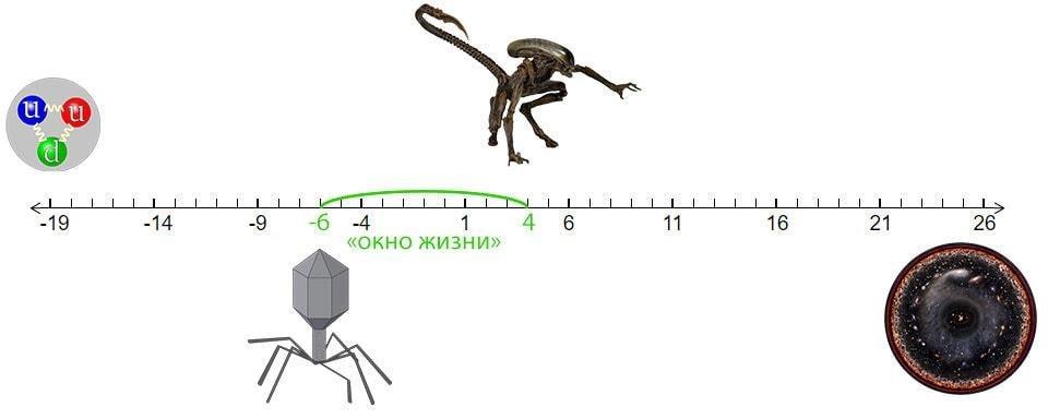 Жизнь (от вирусов до гиганстких инопланетян) по размеру занимает всего 10 порядков из 45 возможных — от кварков до обозримой Вселенной