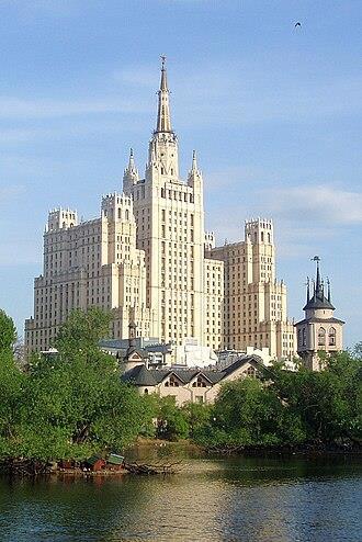 Все эти колонны, фронтоны, башенки и пилястры были сочтены «архитектурными излишествами» и попали под нож. Резали, что называется, по живому — останавливали уже шедшее строительство, перерабатывали проекты и запускали уже в покоцанном виде. В Москве. например, есть несколько мест, где это отчетливо видно — например, разительно отличаются стоящие друг напротив друга дома 101 и 120 по проспекту Мира, или потерявший правую декоративную башенку дом 1 на набережной Шевченко (на фото ниже). Почившую в бозе гостиницу «Россия» построили на уже готовом фундаменте для восьмой «сталинской высотки».