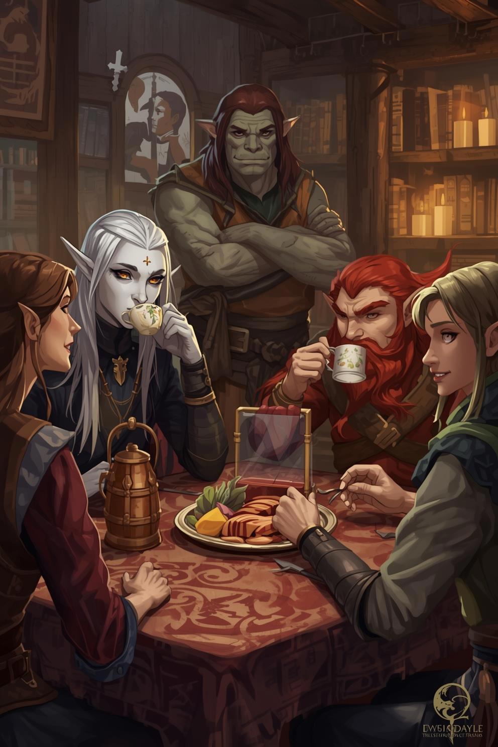 Я хотела создать застольную сцену, отражающую характеры персонажей, примерно как на этой картинке, нарисованной неизвестным мне художником: