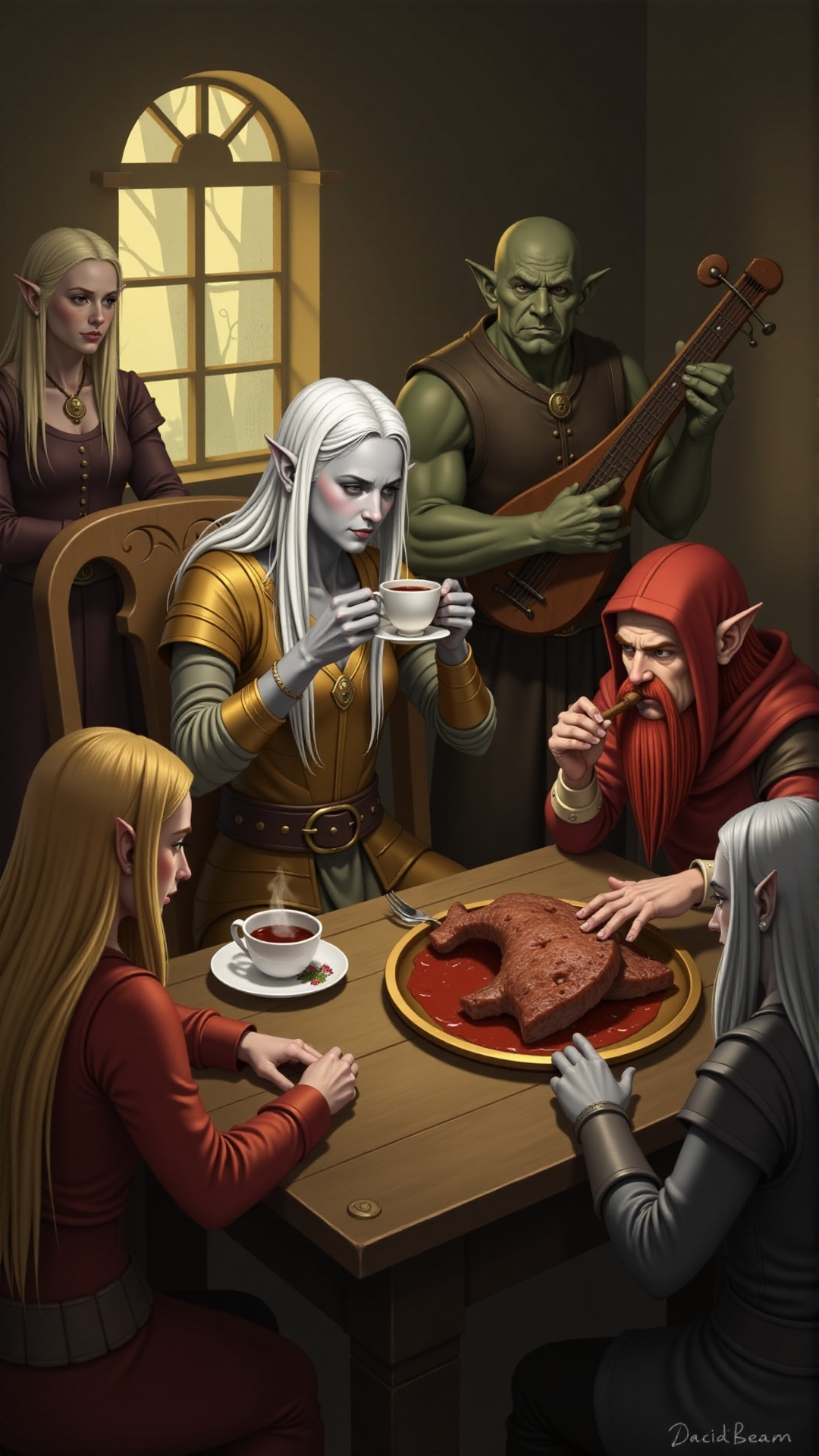 Затем каким-то неведомым чудом мне выдало нечто похожее! С той лишь разницей, что орк у меня молодой, лысый и безбородый, дроу — не синекожий, гном не похож на крестьянина, а мясо должнно быть жареное! Ну, и по мелочи вроде странно сложенных рук. Я обвела, что меняла.