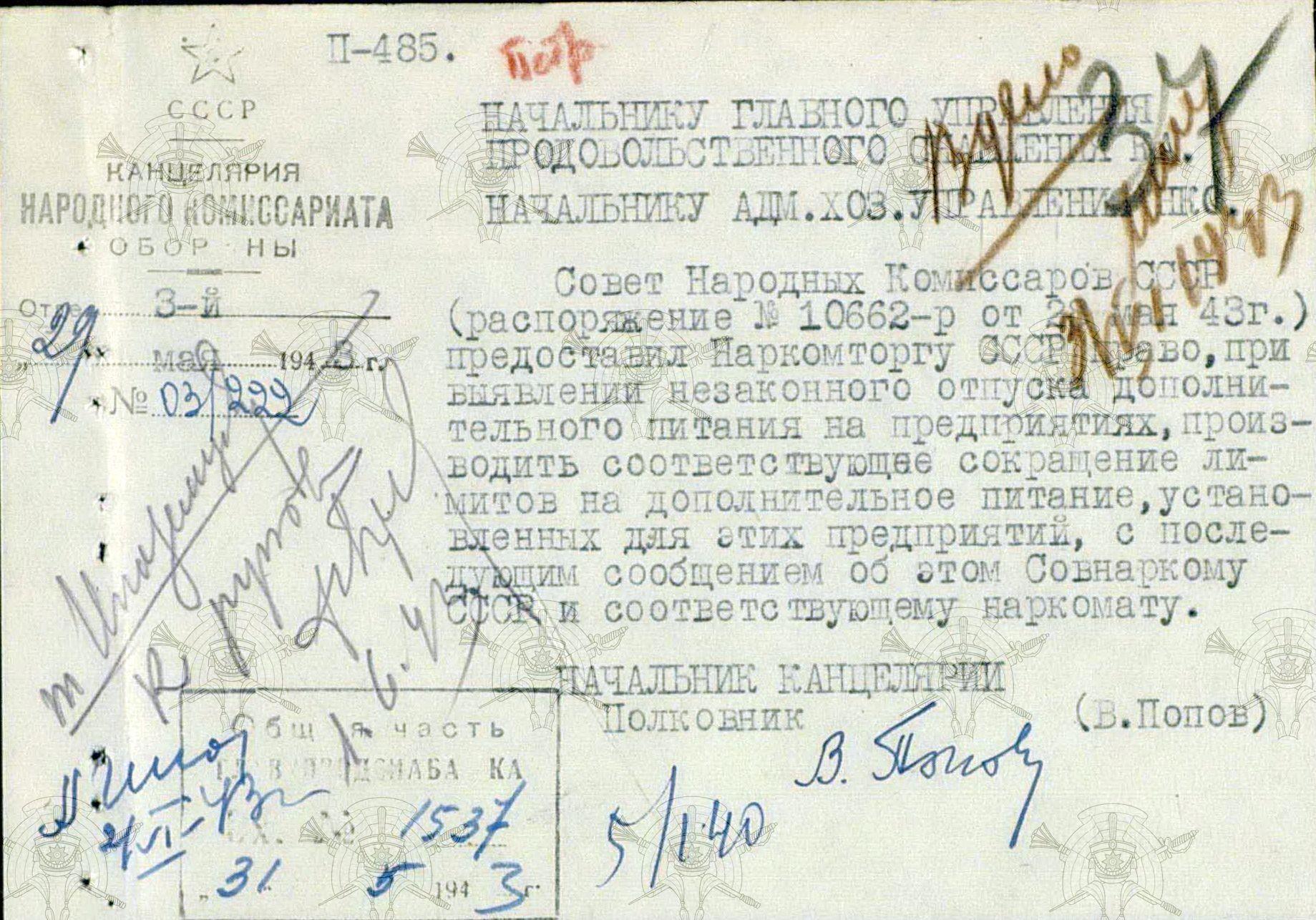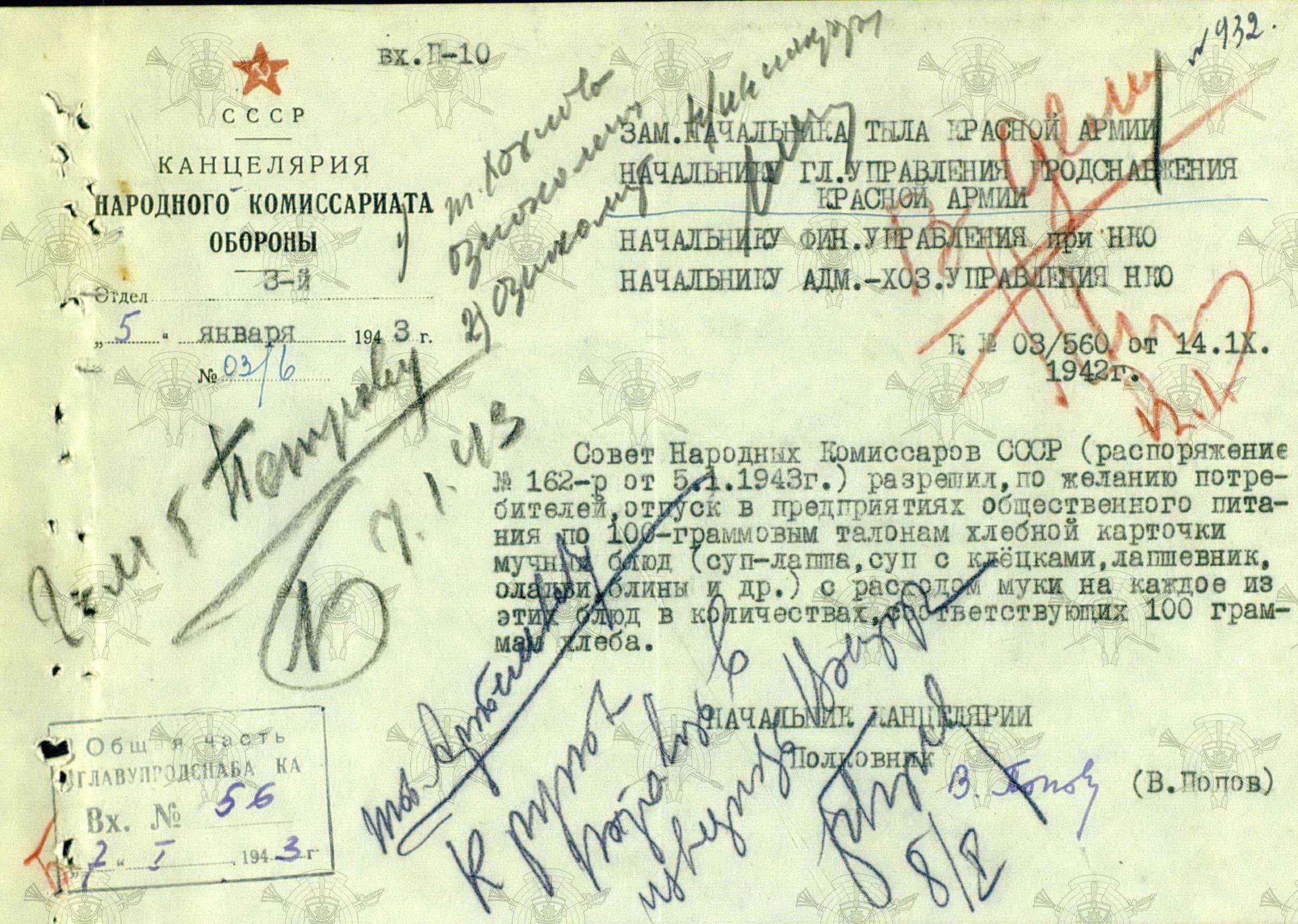 Текст следующего, упомянутого в одной из телеграмм, распоряжения СНК СССР № 162-р от 5 января 1943 г. найти не удалось, но у него вполне «говорящее» название: «О разрешении по желанию потребителей отпуск в предприятиях общественного питания по 100 граммовым талонам хлебной карточки мучных блюд суп-лапша, суп с клёцками, лапшевник, оладьи, блины и др. с расходом муки на каждое из этих блюд в количествах, соответствующих 100 граммам хлеба.»: