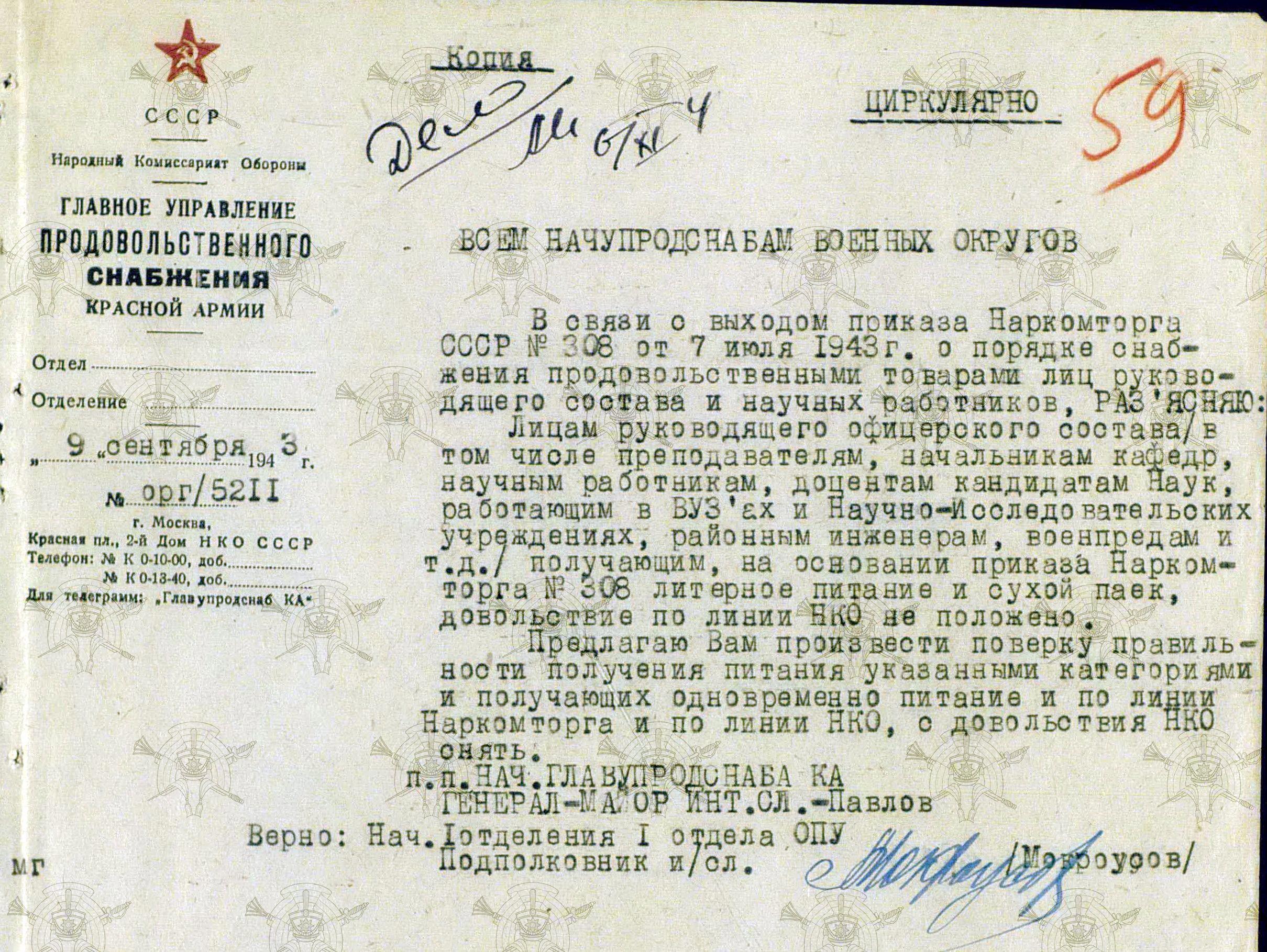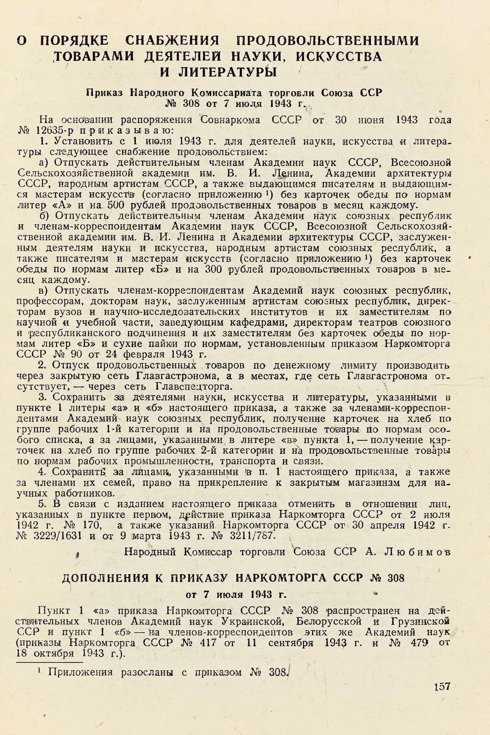 Следующее распоряжение касается порядка снабжения продтоварами руководящих лиц и научных работников. И вновь мы видим отсылку к очередному приказу Наркомторга: