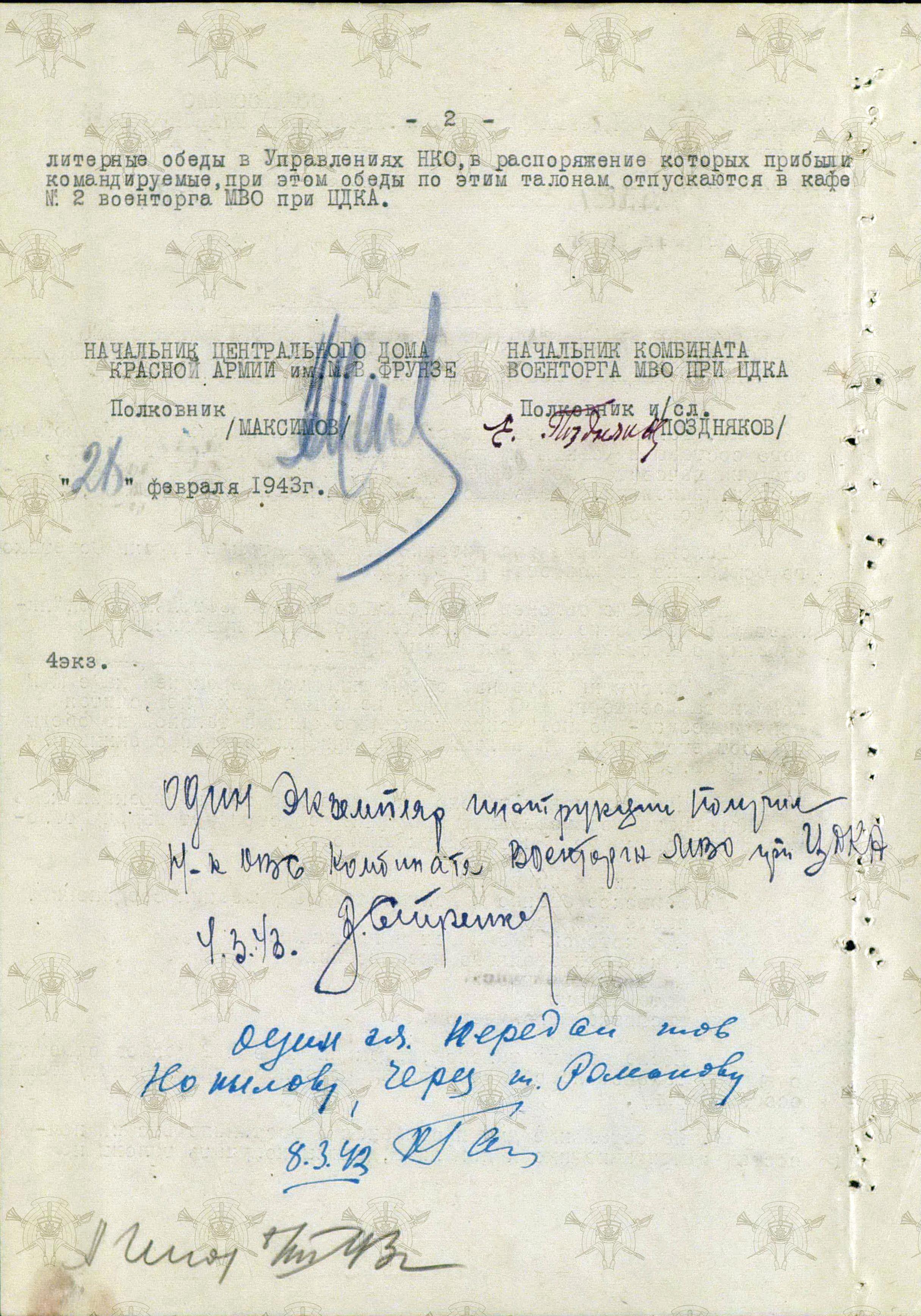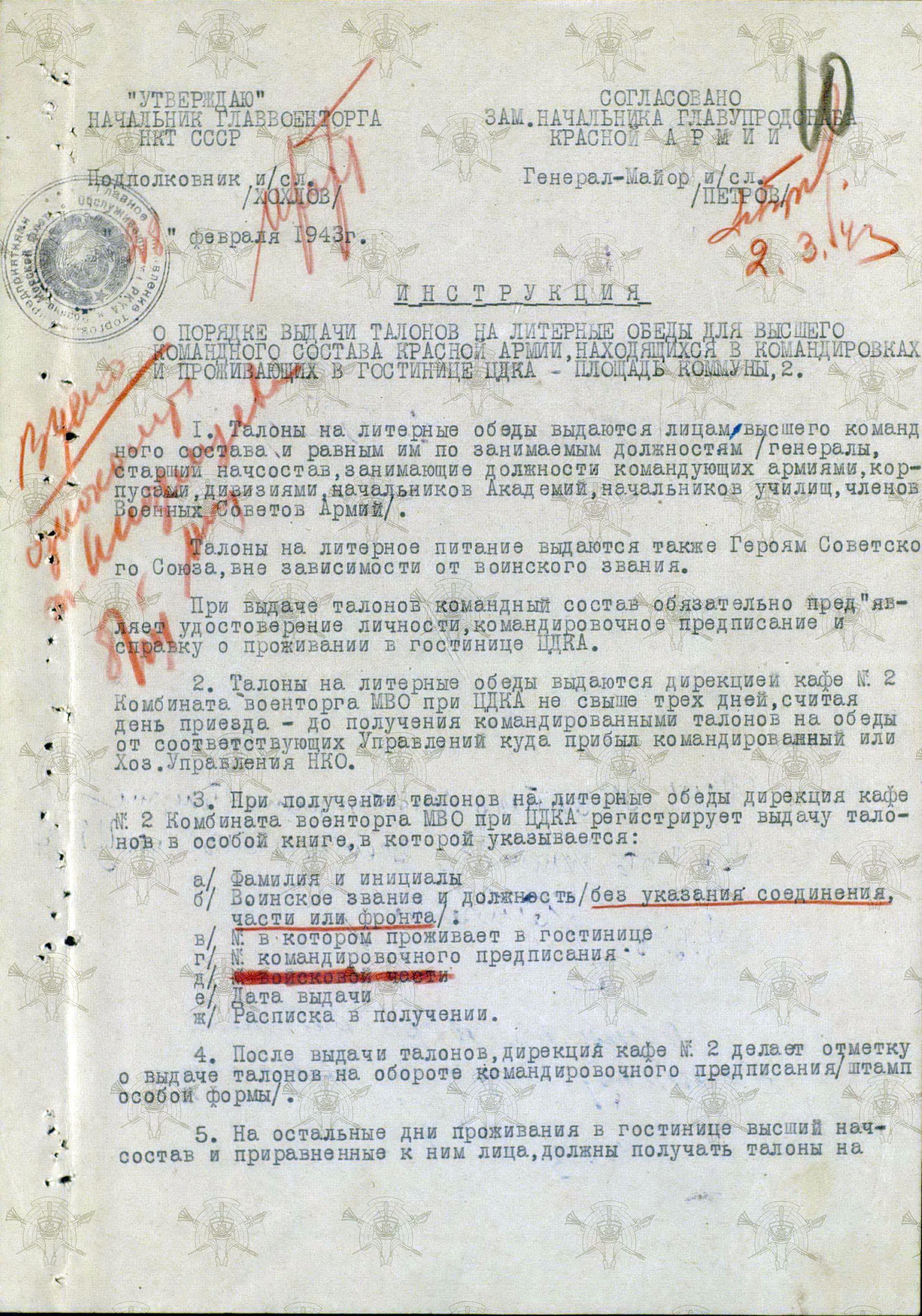 Следующая инструкция тоже достаточно необычна. И если выдача талонов на питание высшего комсостава армии особого удивления не вызывает, то особый порядок продснабжения Героев Советского Союза - говорит о продуманности указания и особом внимании к героям: