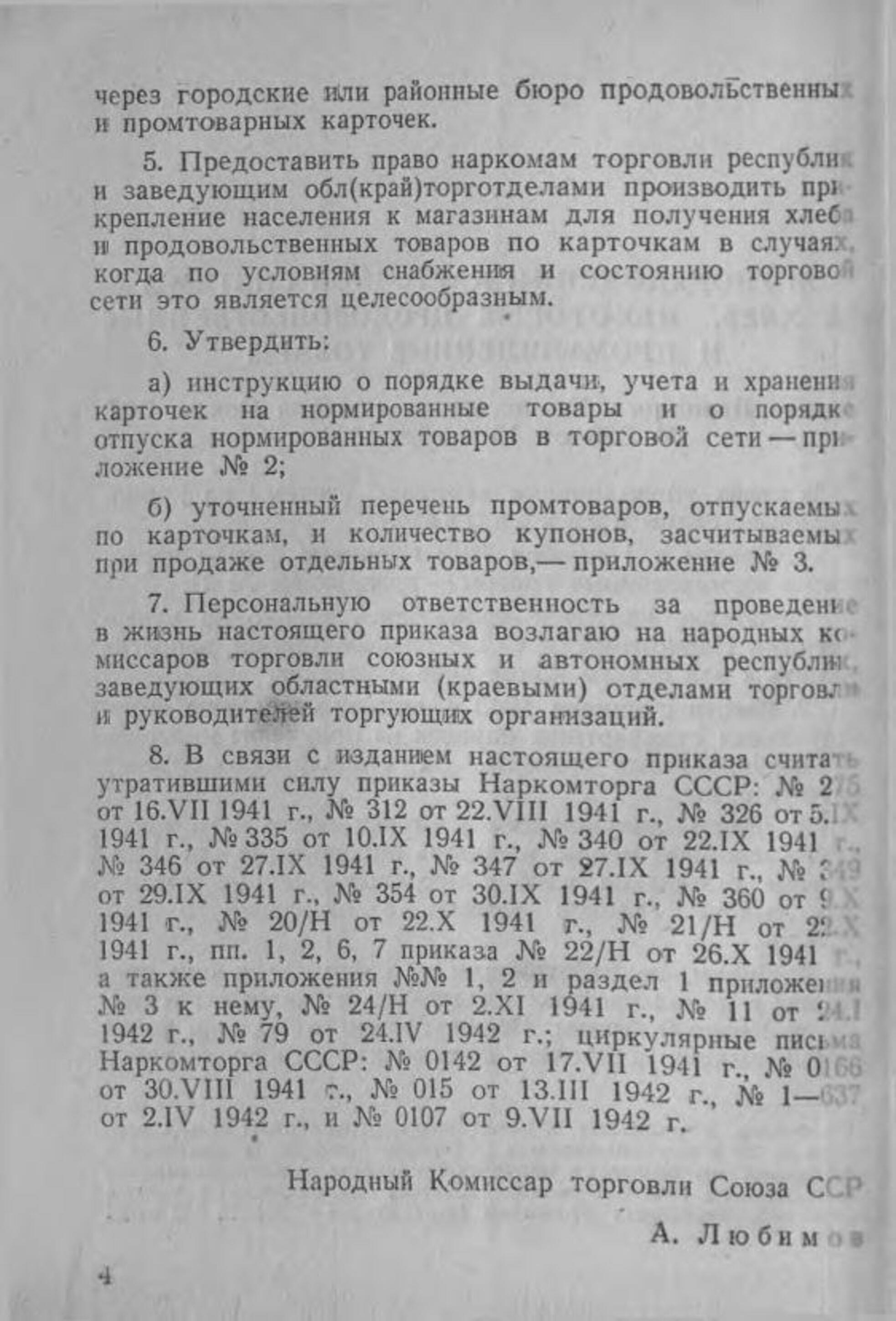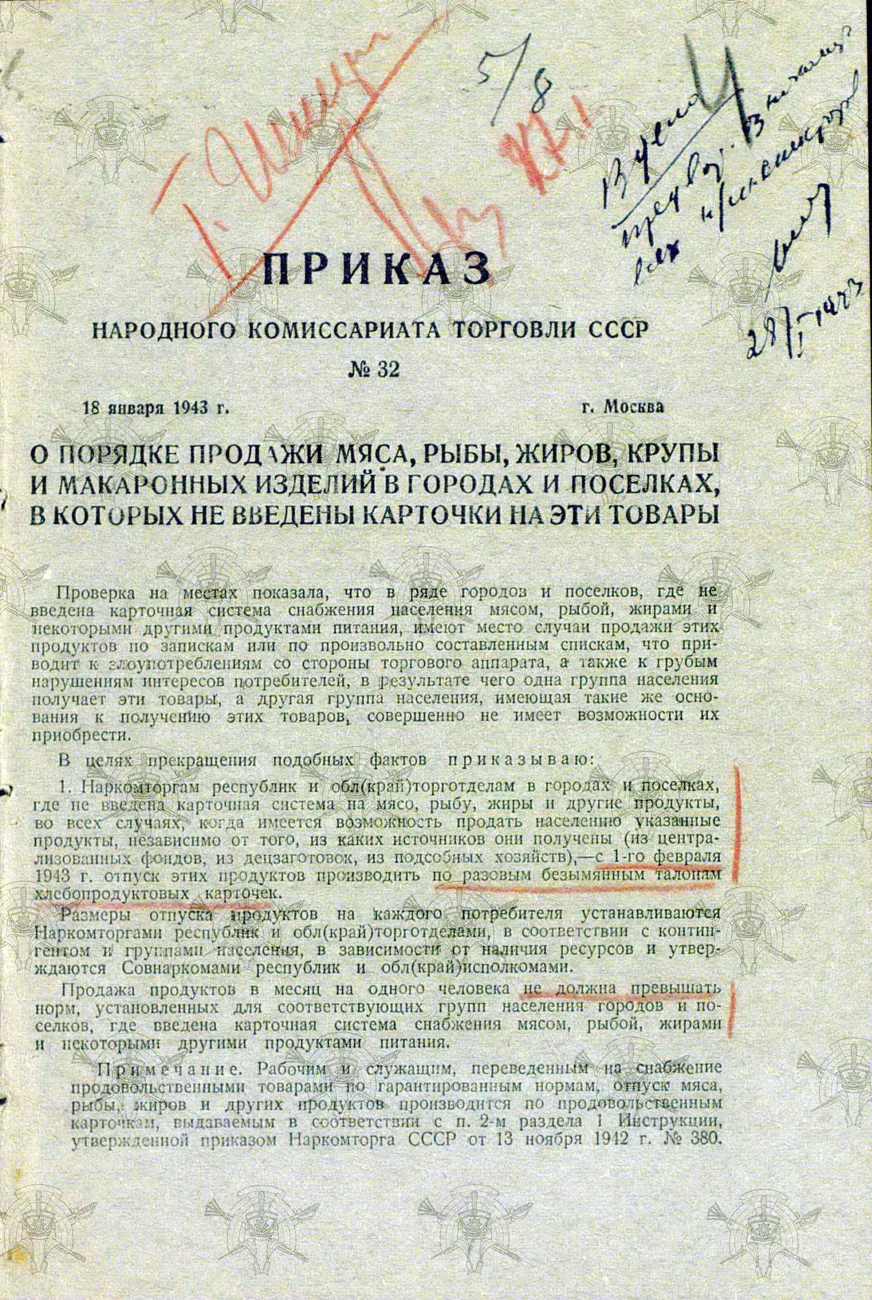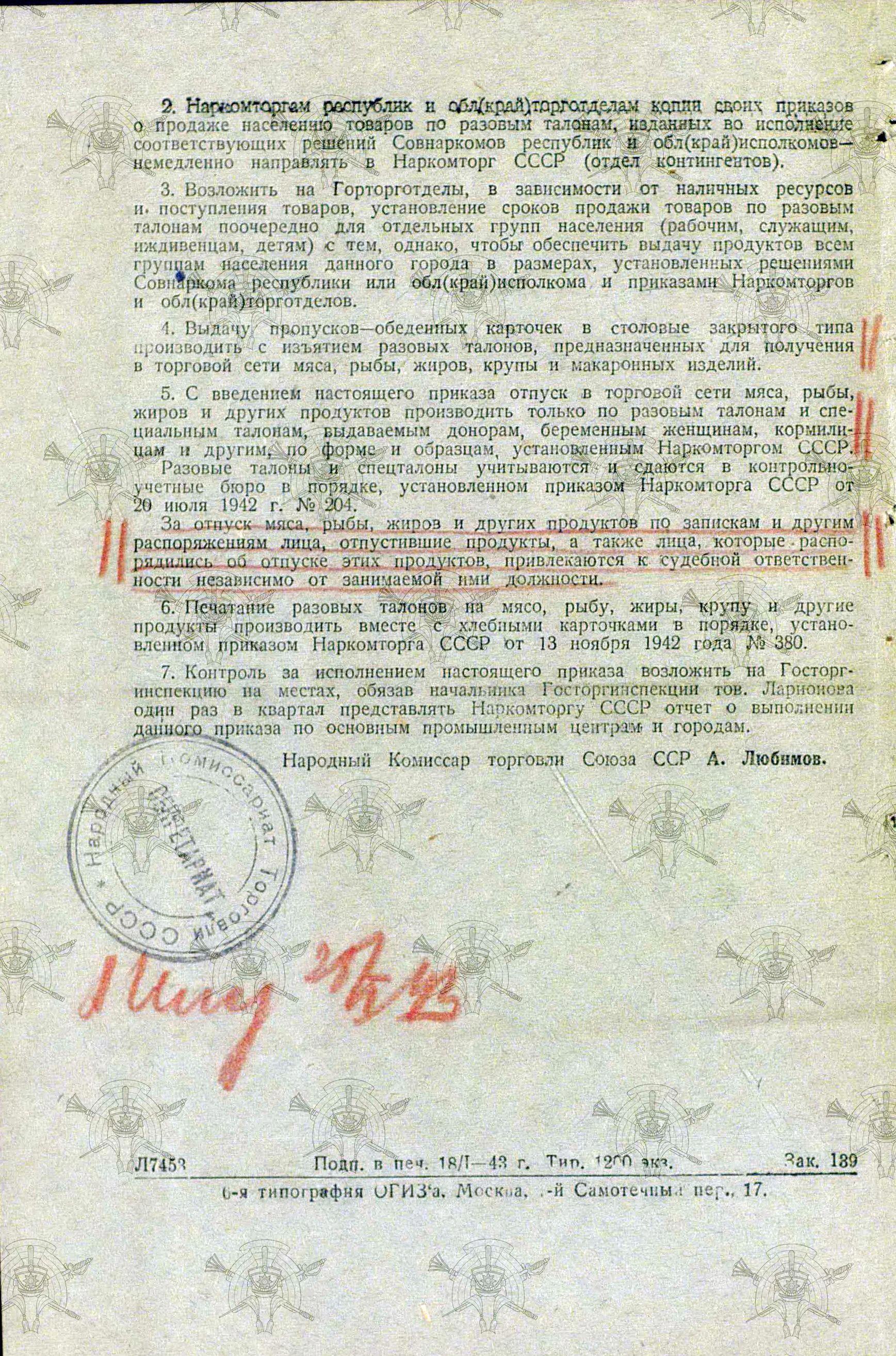 И вновь перед нами обширный документ. Ознакомиться с полной версией приказа можно по ссылке: Об упорядочении карточной системы на хлеб, некоторые продовольственные и промышленные товары. Приказ Народного Комиссариата торговли Союза ССР № 380 от 13 ноября 1942 г.