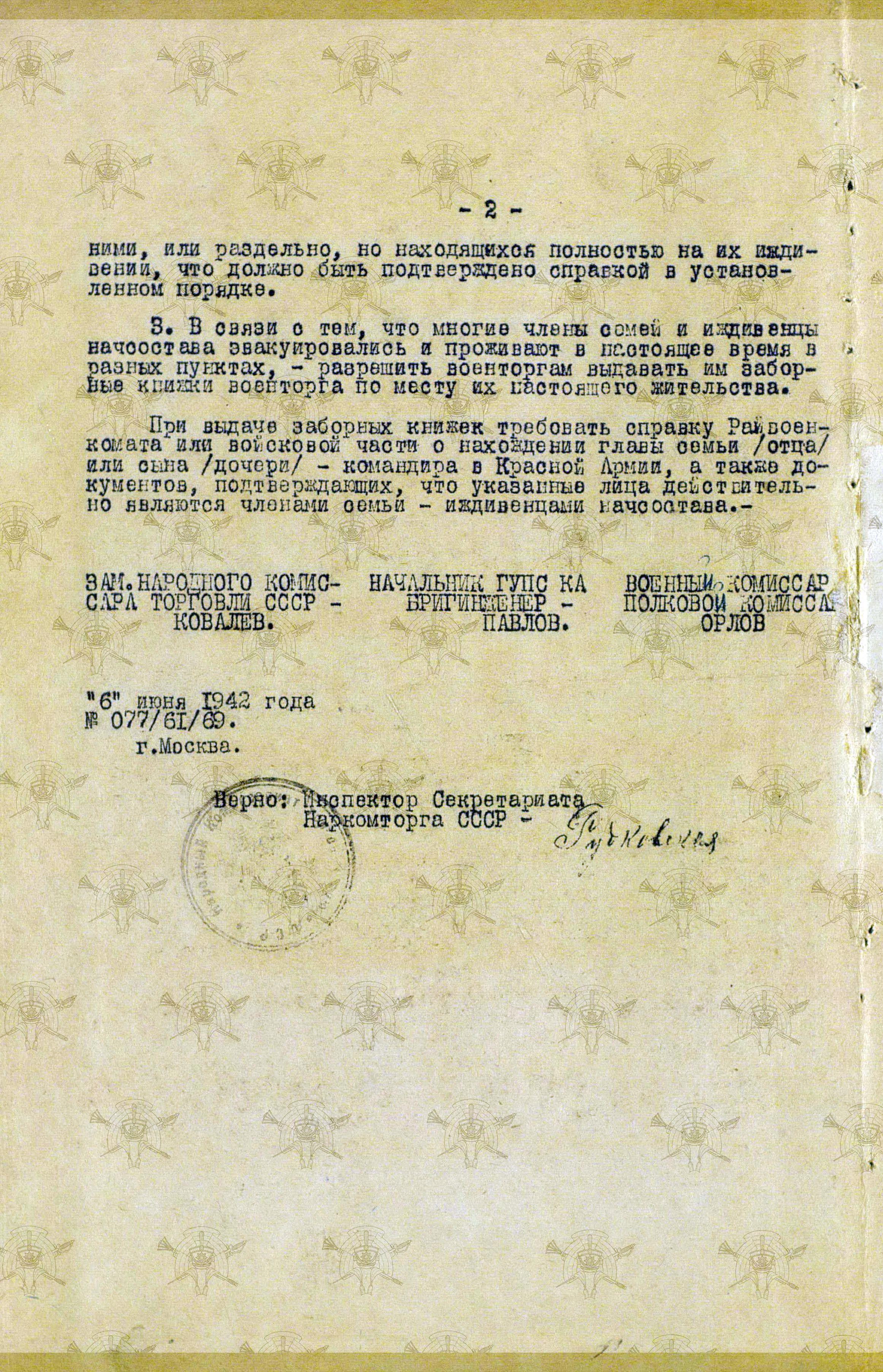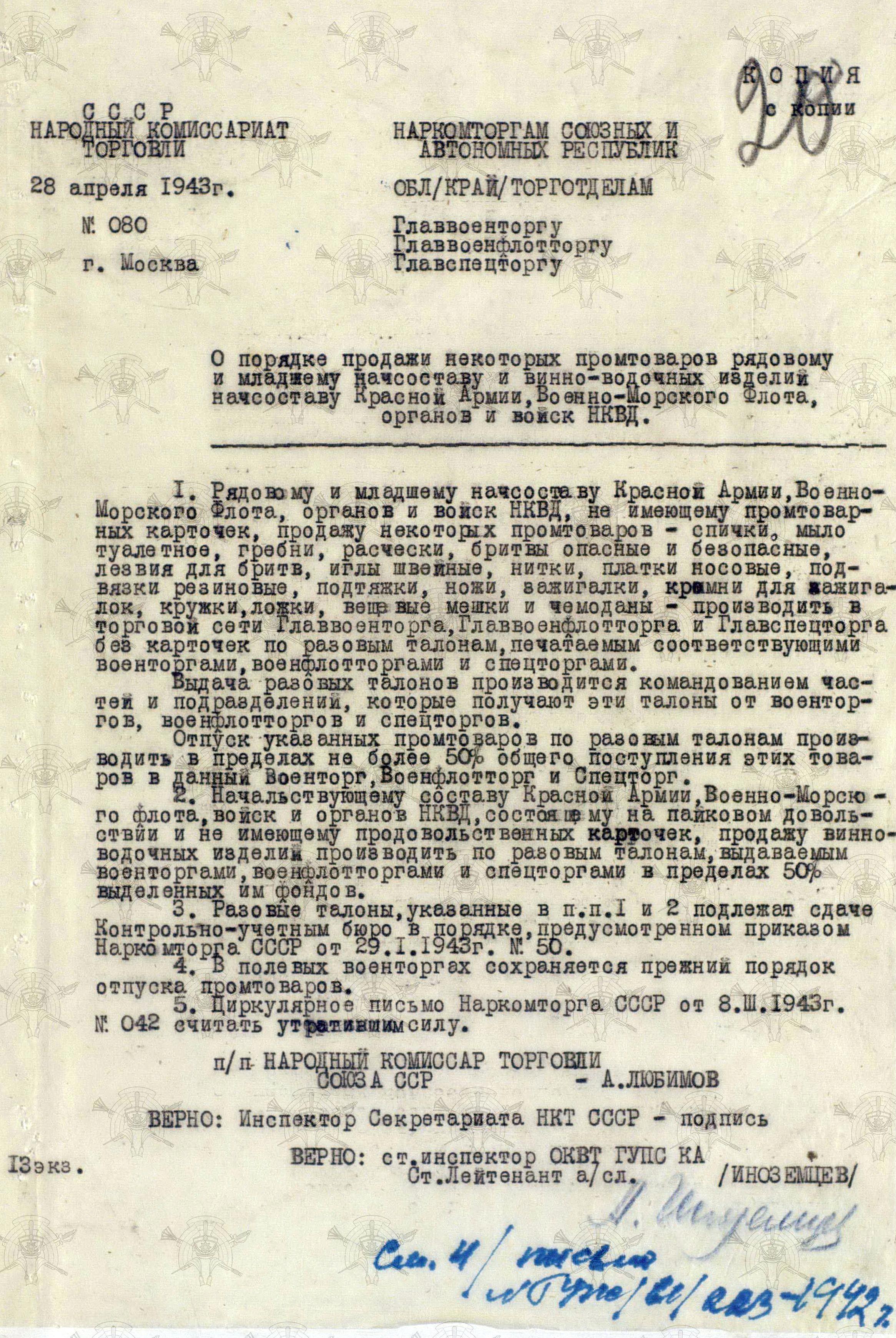 И вновь перед нами несколько необычный приказ, действие которого распространяется на личный состав ВМФ и НКВд. Причём, военнослужащих действующей армии он не касается, в пункте 4 прямо говориться, что в полевых военторгах сохраняется прежний порядок.