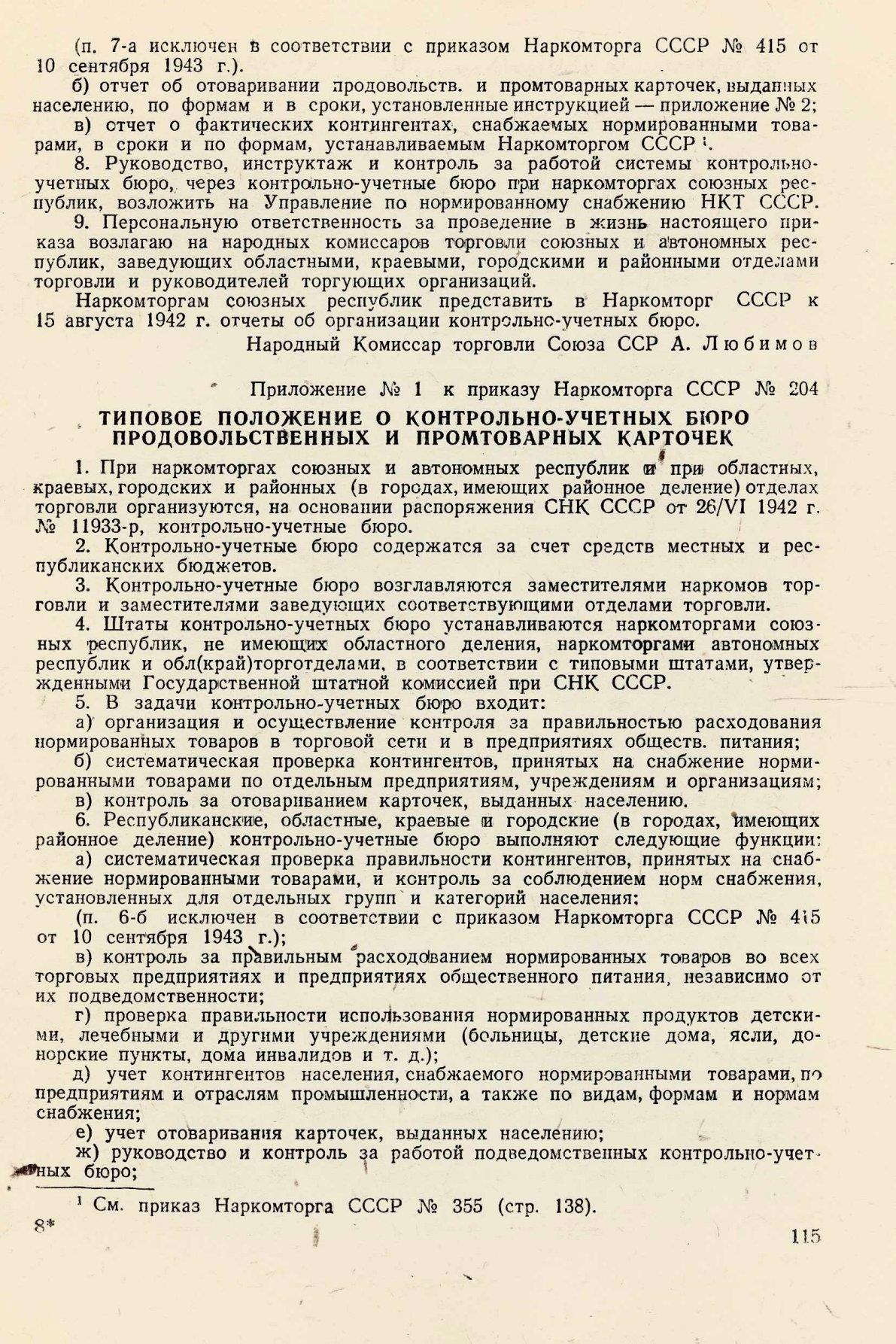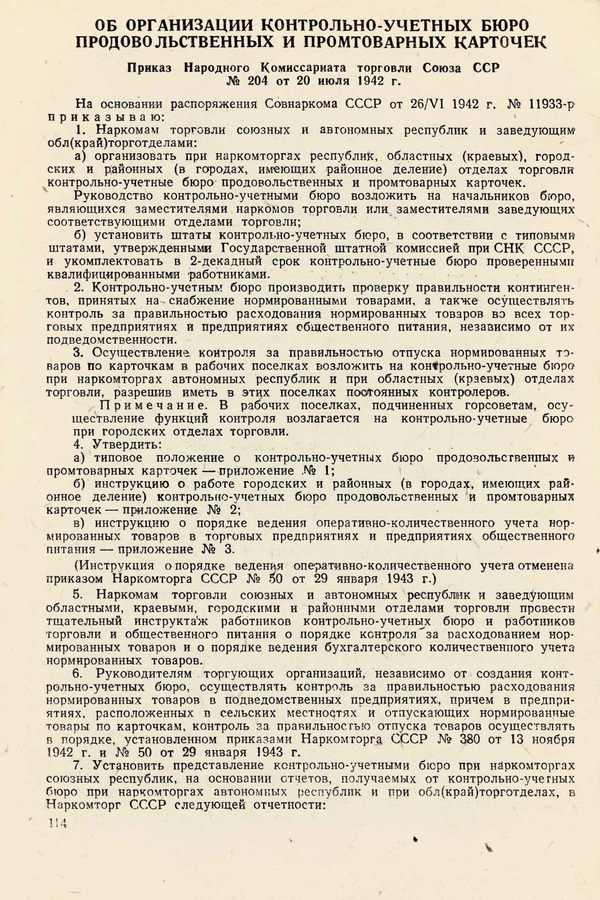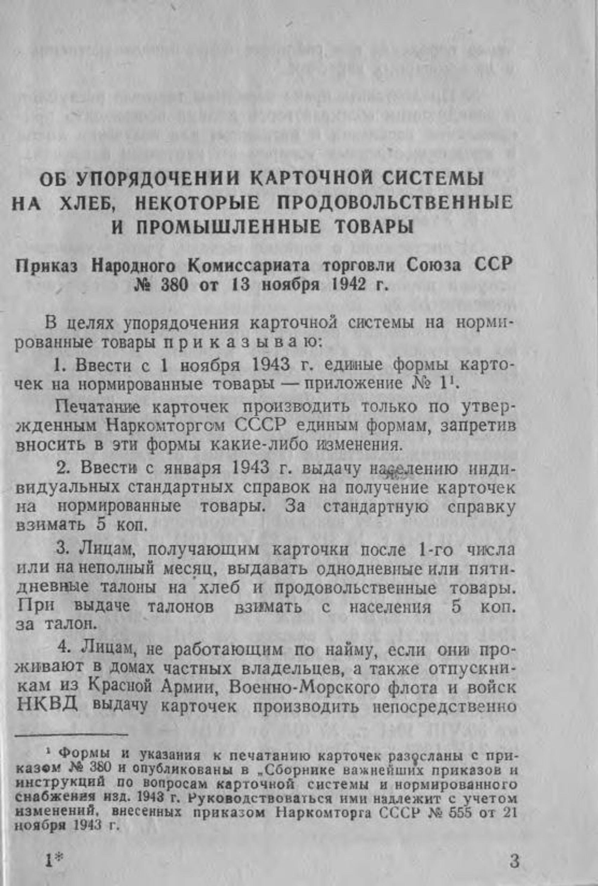 Ещё один нормативные правовой акт, ссылки на который встречаются чаще, это приказ Наркомторга СССР от 13.11.1942 г. № 380 «Об упорядочении карточной системы на хлеб, некоторые продовольственные и промышленные товары»: