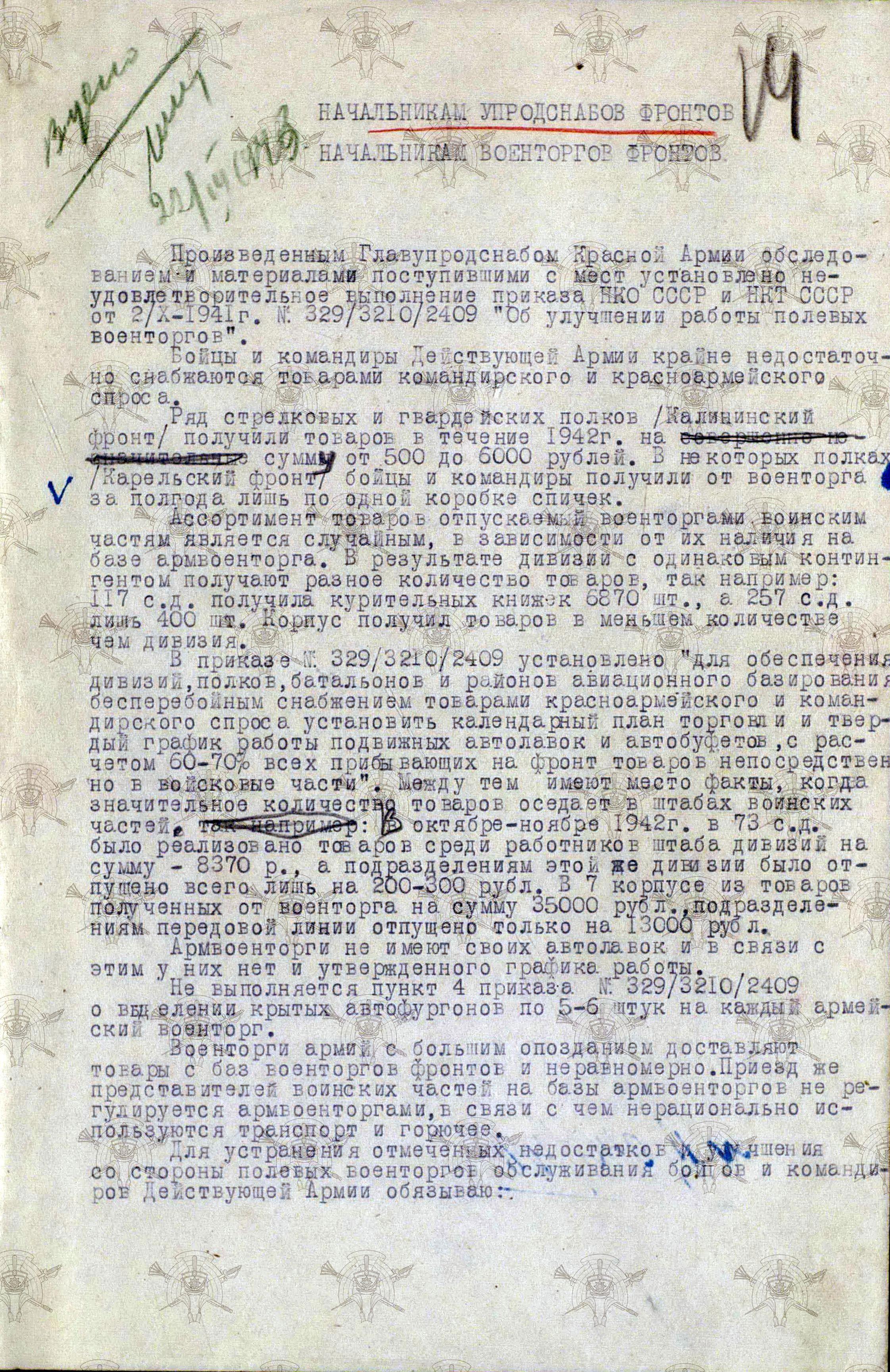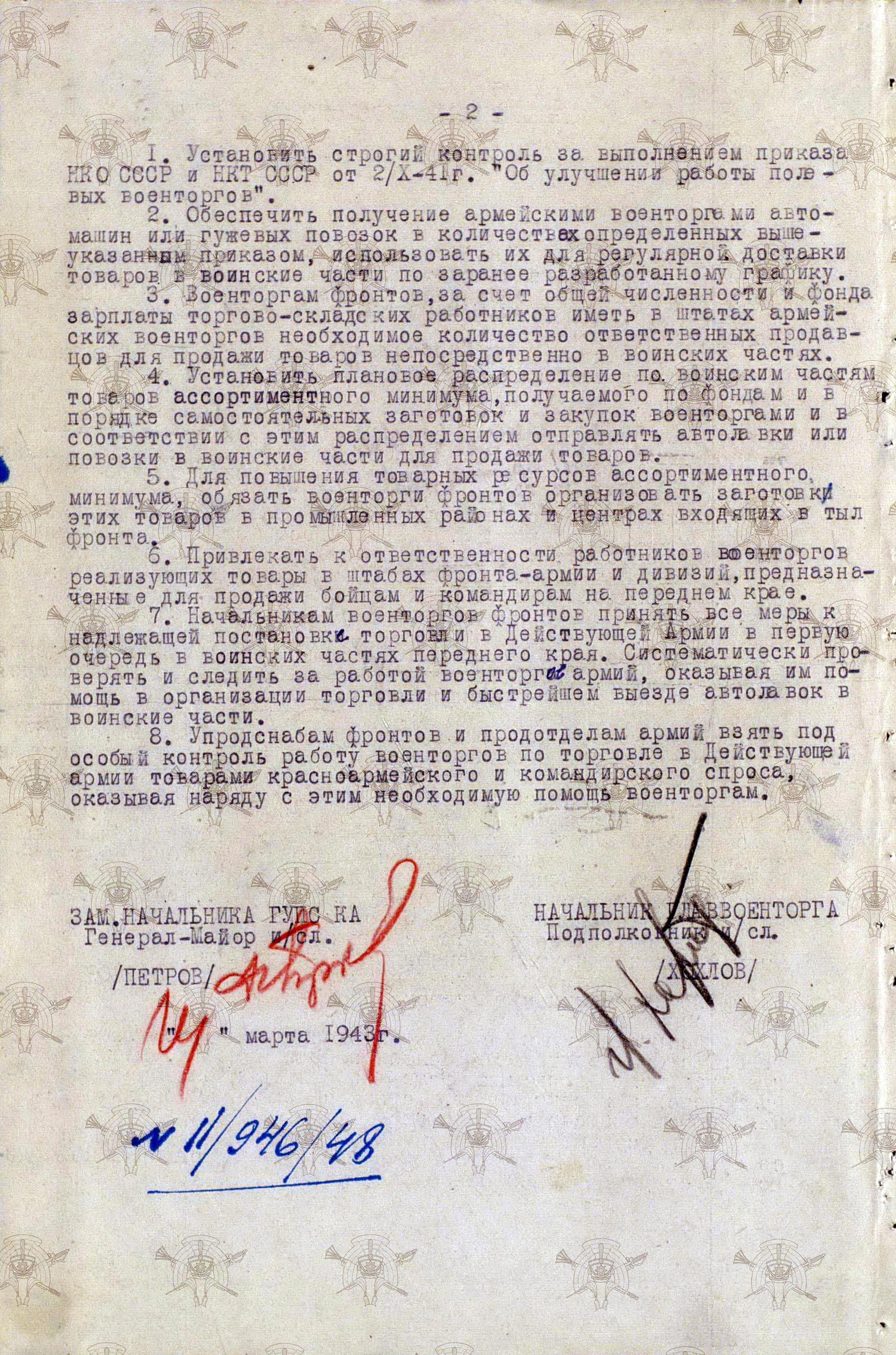 Но, не всё было гладко в работе предприятий военной торговли. И чтобы в этом убедиться, достаточно прочитать совместное указание зам. начальники Главного Управления Продснабжения КА и начальника Главвоенторга. И хотя приказ обязывает начальников Упрпродснабов фронтов и начальников военторгов фронтов к выполнению восьми пунктов, всё же есть сомнения, что выявленные недостатки были полностью или хотя бы на 75% устранены.