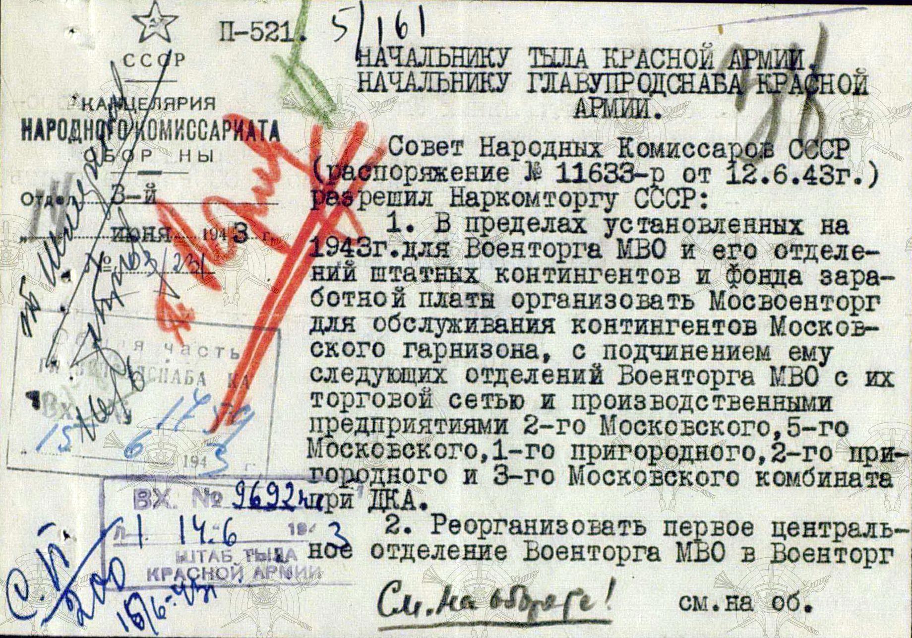 14 июня 1943 года, Военторгом Московского военного округа началось формирование двух новых организаций: